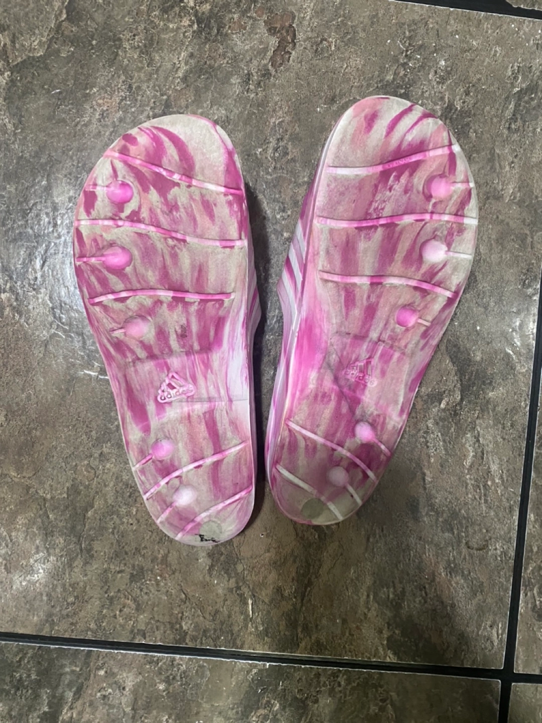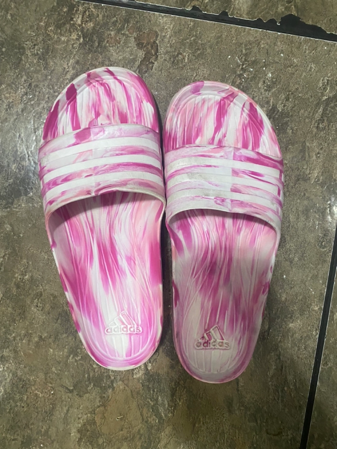 Selling a pair of Adidas Adilette Comfort Slides in a cool pink and white marble pattern! They have the classic three-stripe design and are super comfy for everyday wear. Size is US 8.