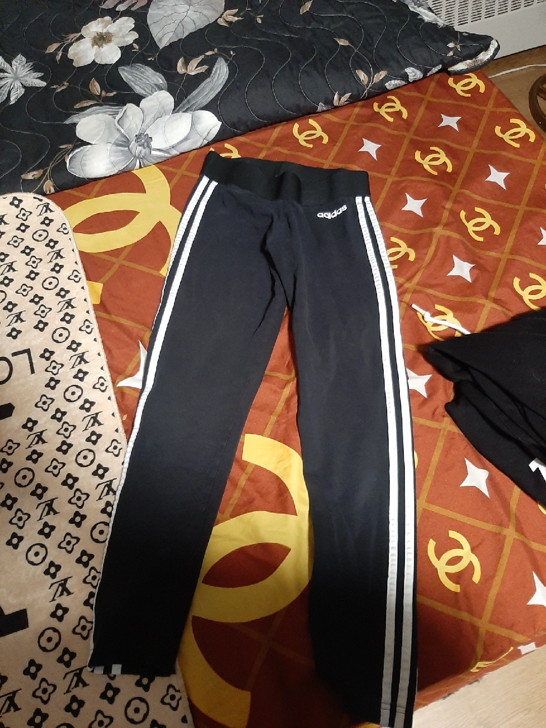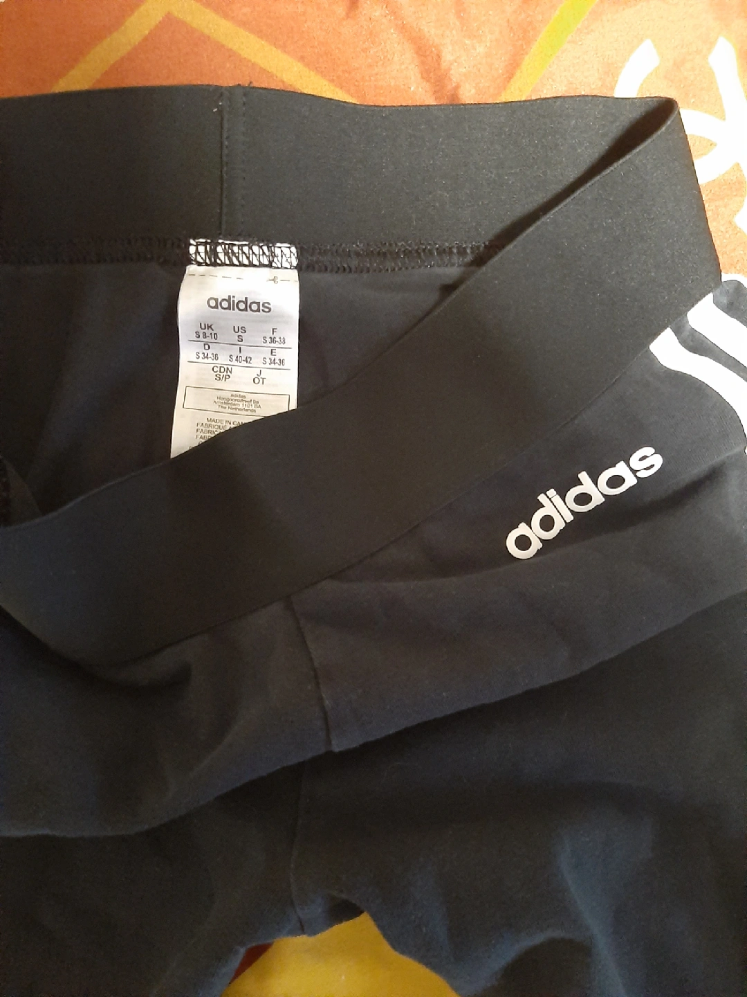 Selling a pair of Adidas black leggings in size S. They feature the classic three stripes down the side. Perfect for workouts or everyday wear!
