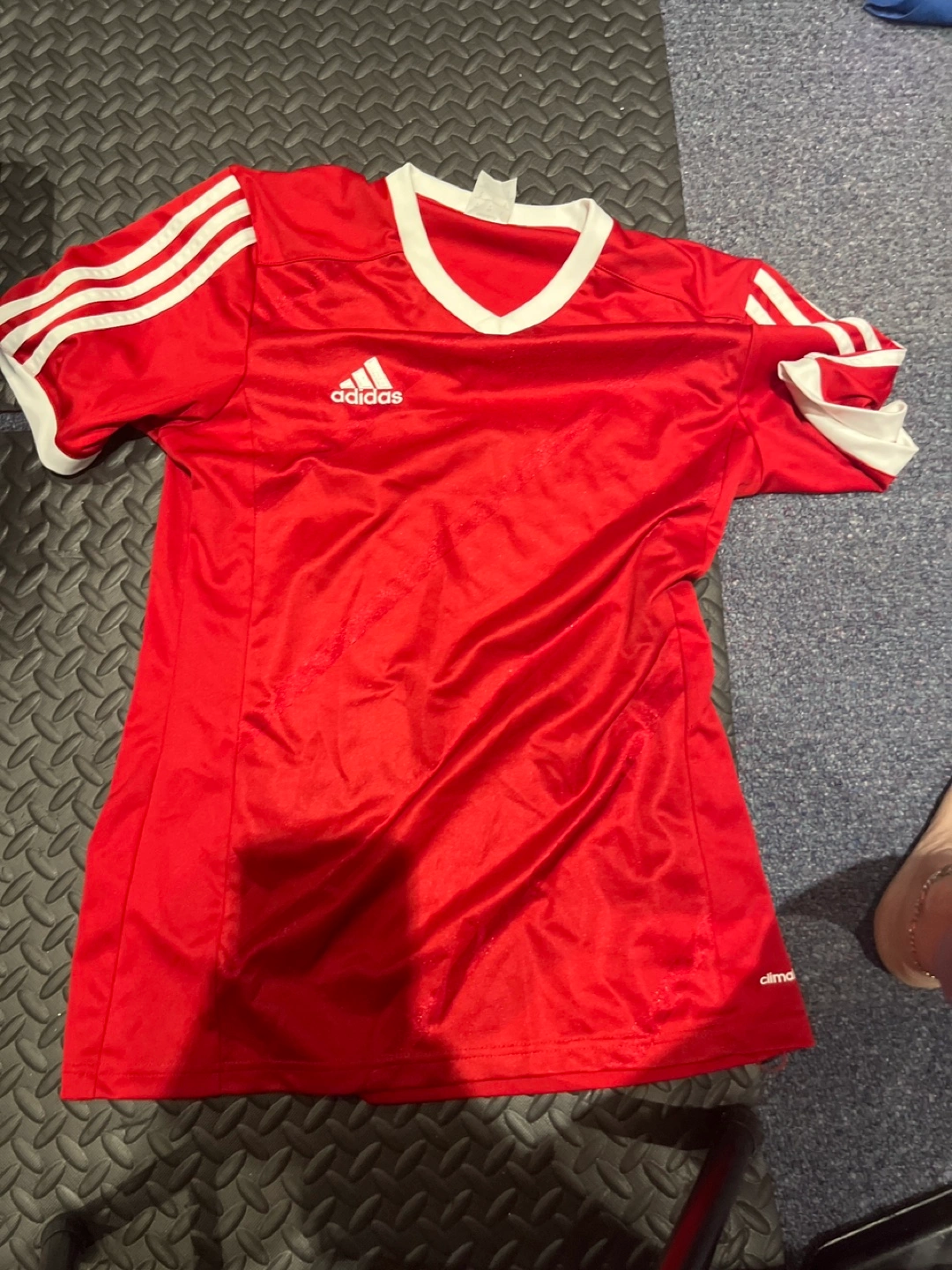 Red Adidas soccer jersey. Climacool technology. Size small. V-neck. Three white stripes on the shoulders. Good condition.