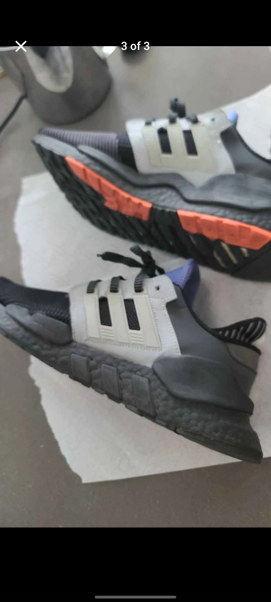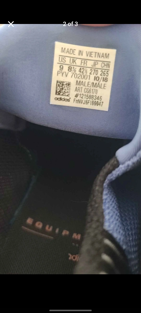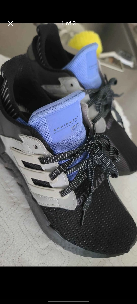 Selling a pair of Adidas Equipment Running Course shoes in size 9 (US). The color is black with silver and blue accents. Made in Vietnam.