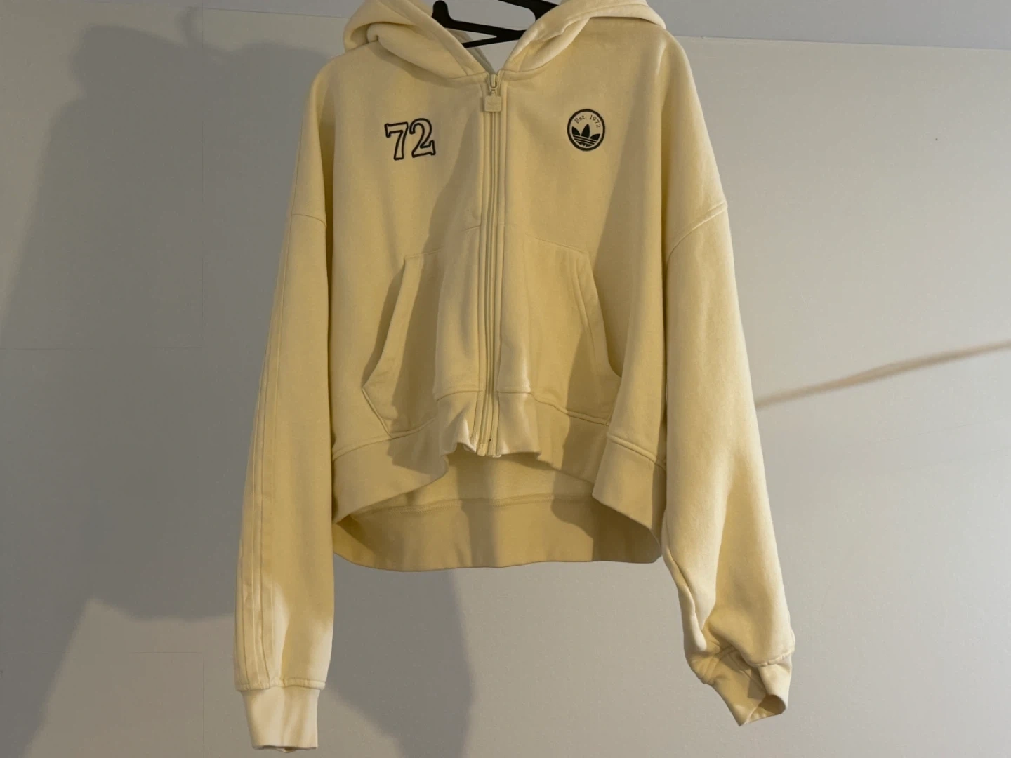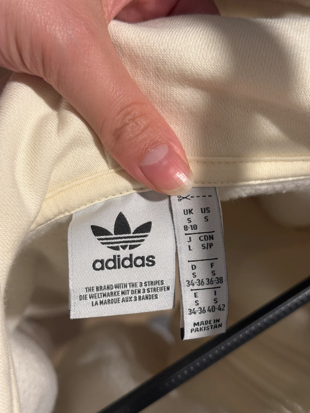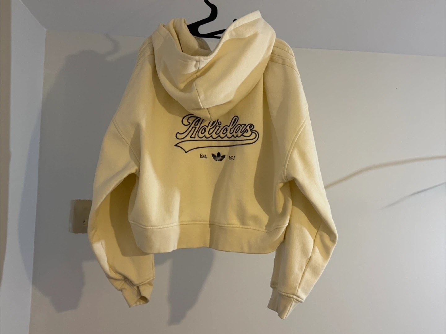 Selling an Adidas Est. 1972 cropped hoodie in a lovely cream colour! It's a size small and has a cool vintage vibe with the '72' detail and the Adidas logo on the back. Perfect for a casual, comfy look!