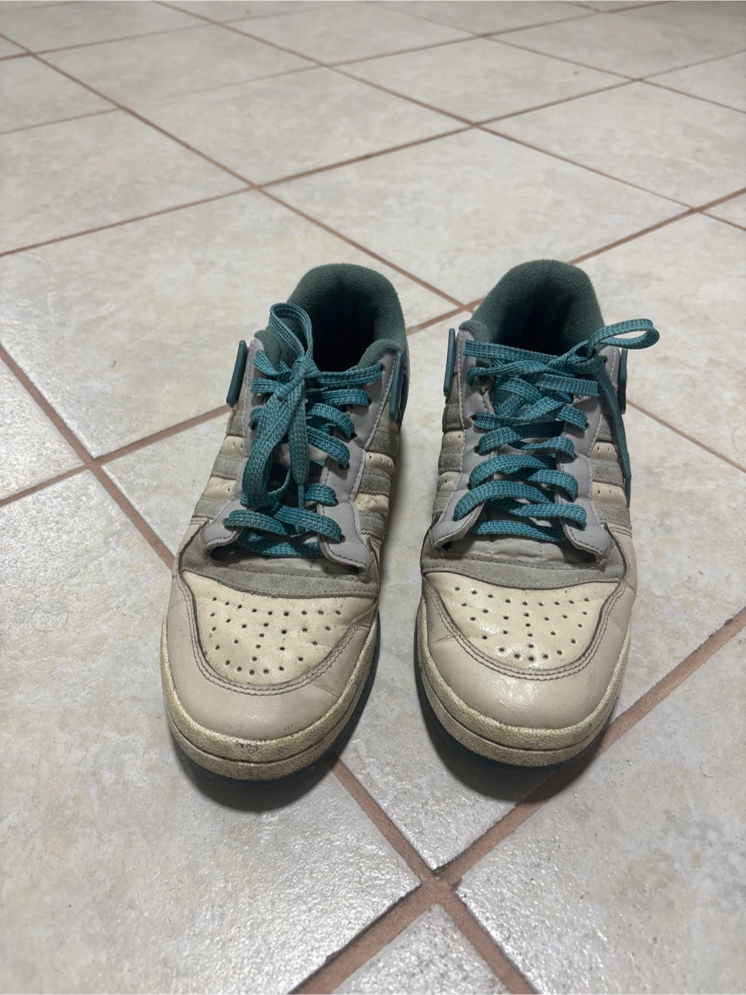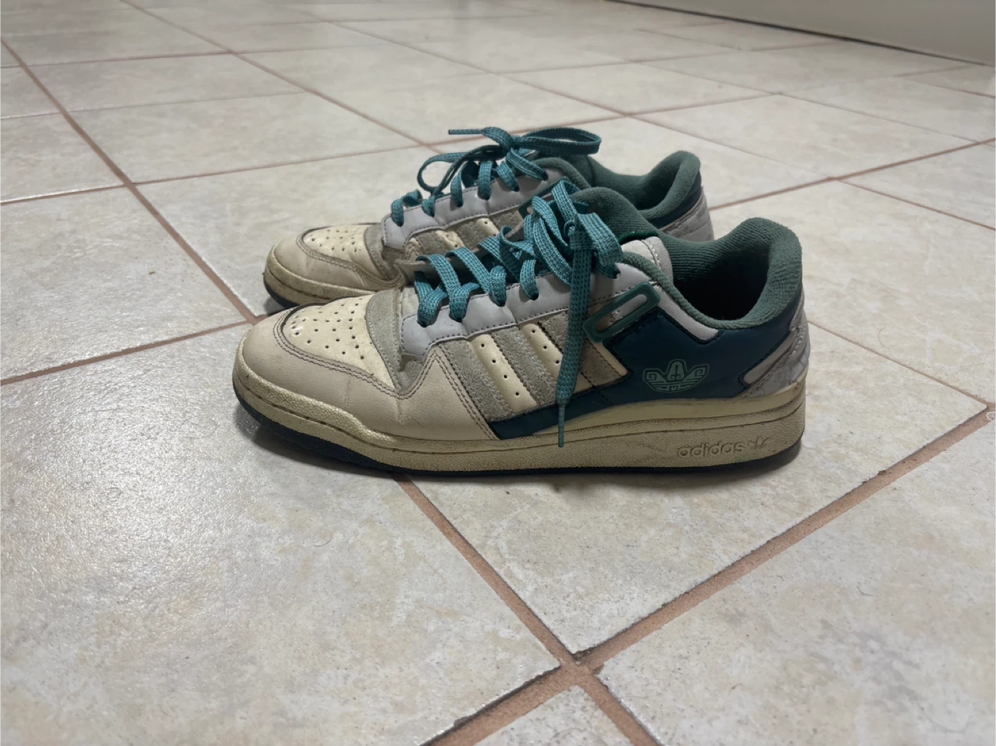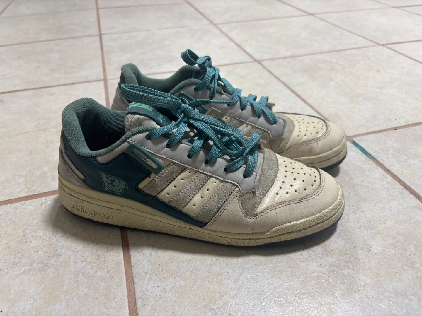 Selling a pair of Adidas Forum Low sneakers. They're a size 8 and have a cool, retro look with the green and off-white colourway. They've been worn, but still have lots of life left!