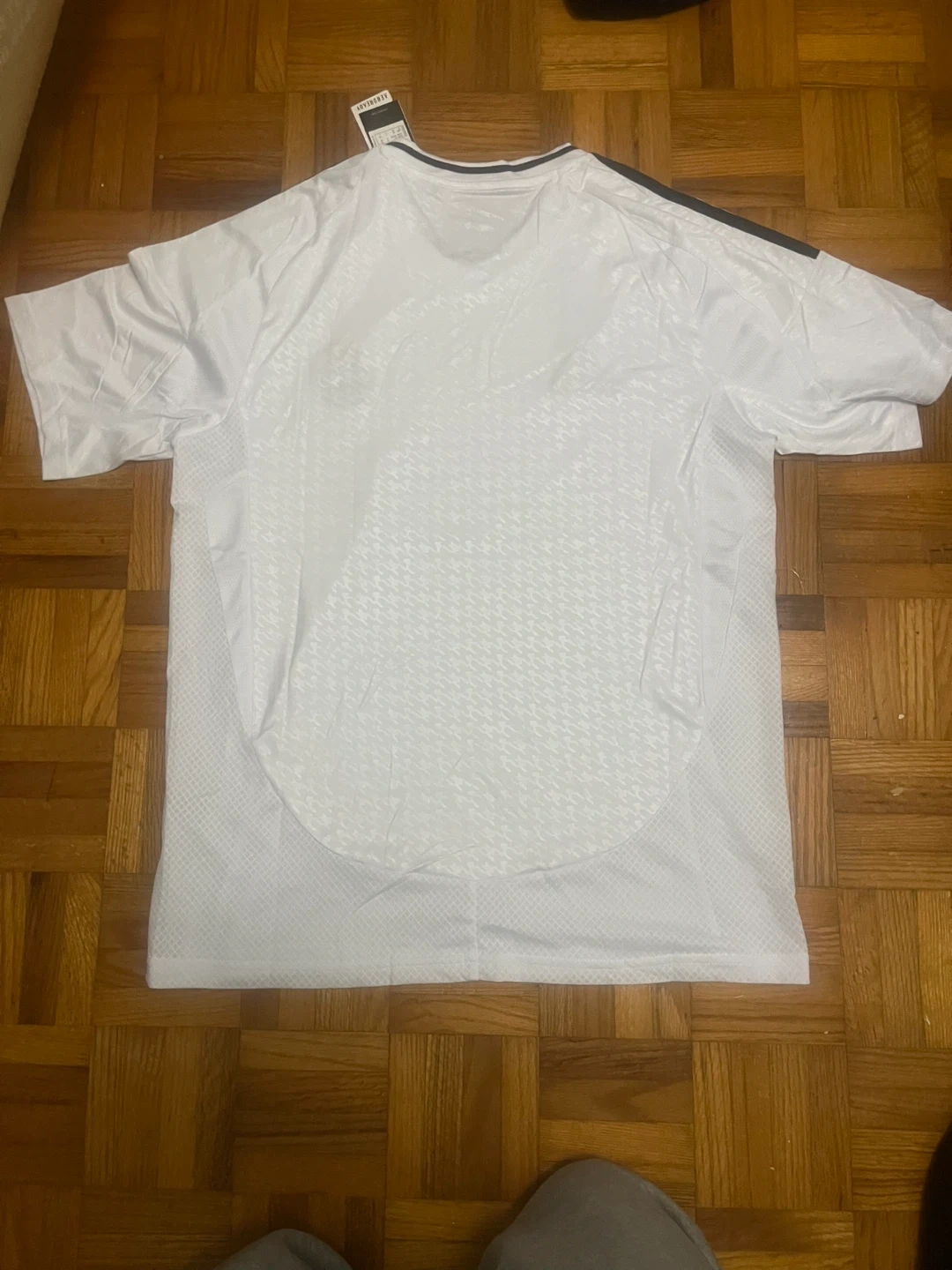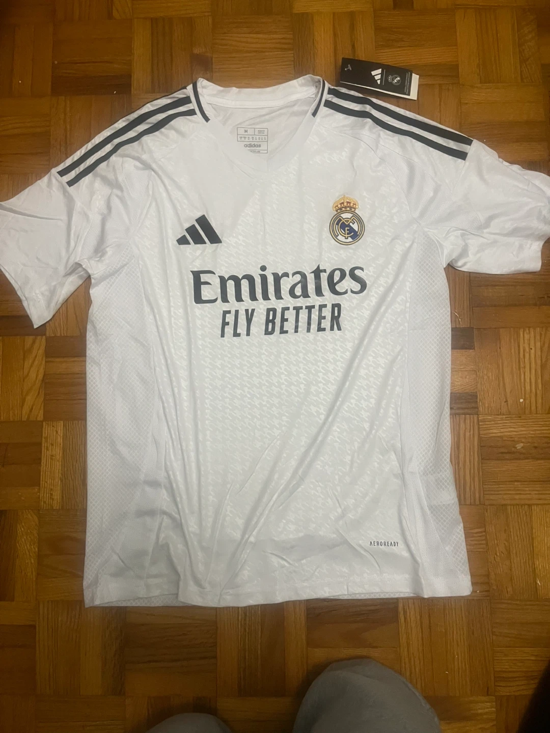 Selling a brand new Adidas Real Madrid jersey in size medium! It's white with black stripes on the shoulders and the Emirates FLY BETTER logo on the front. Official licensed product. 1:1