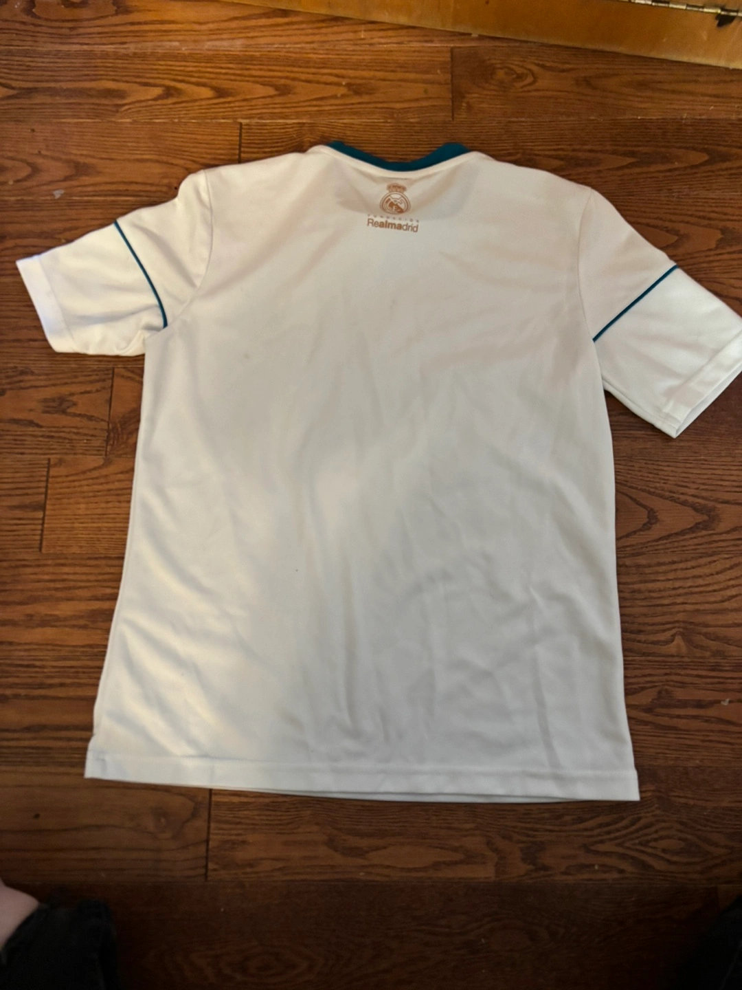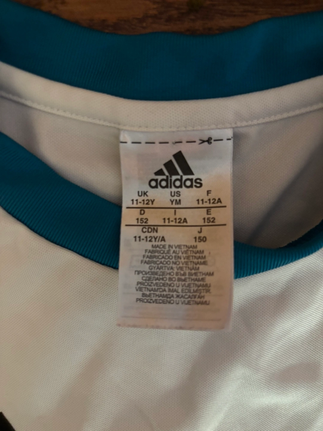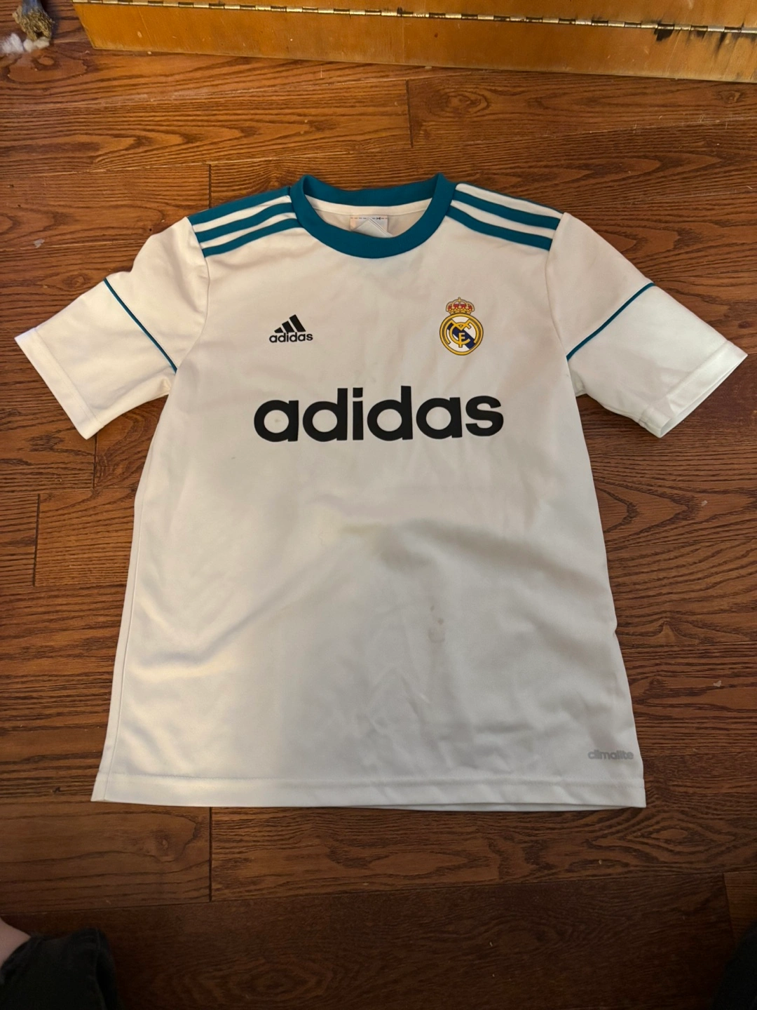 Selling a youth-sized Adidas Real Madrid jersey! It's in good condition and perfect for any young fan. The size is 11-12 years. Small stain on front