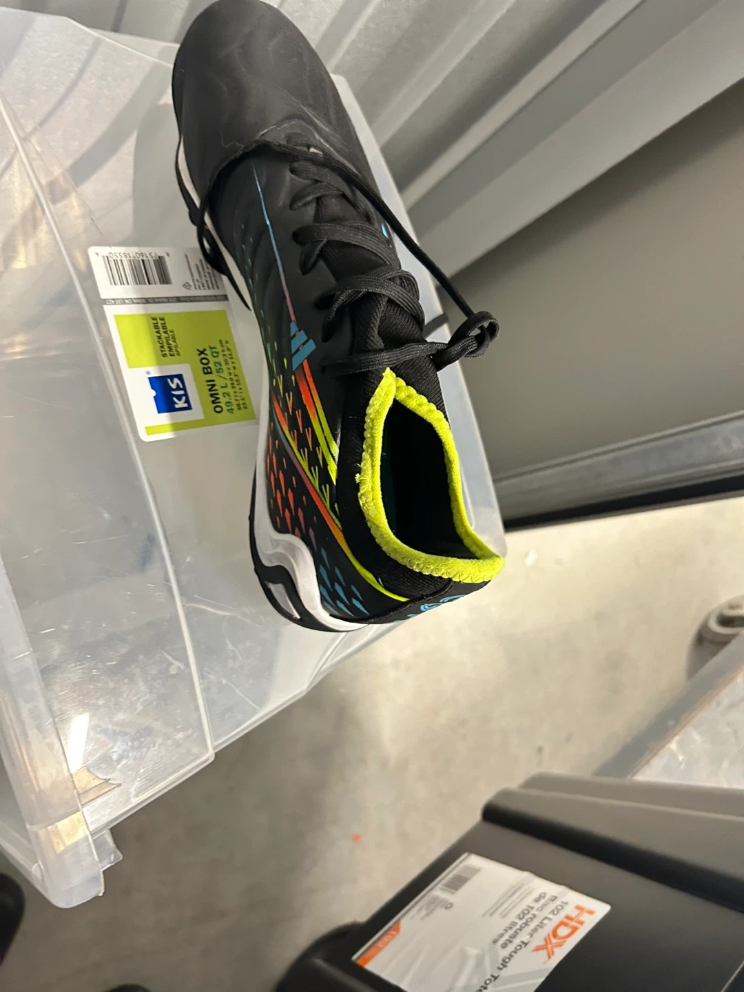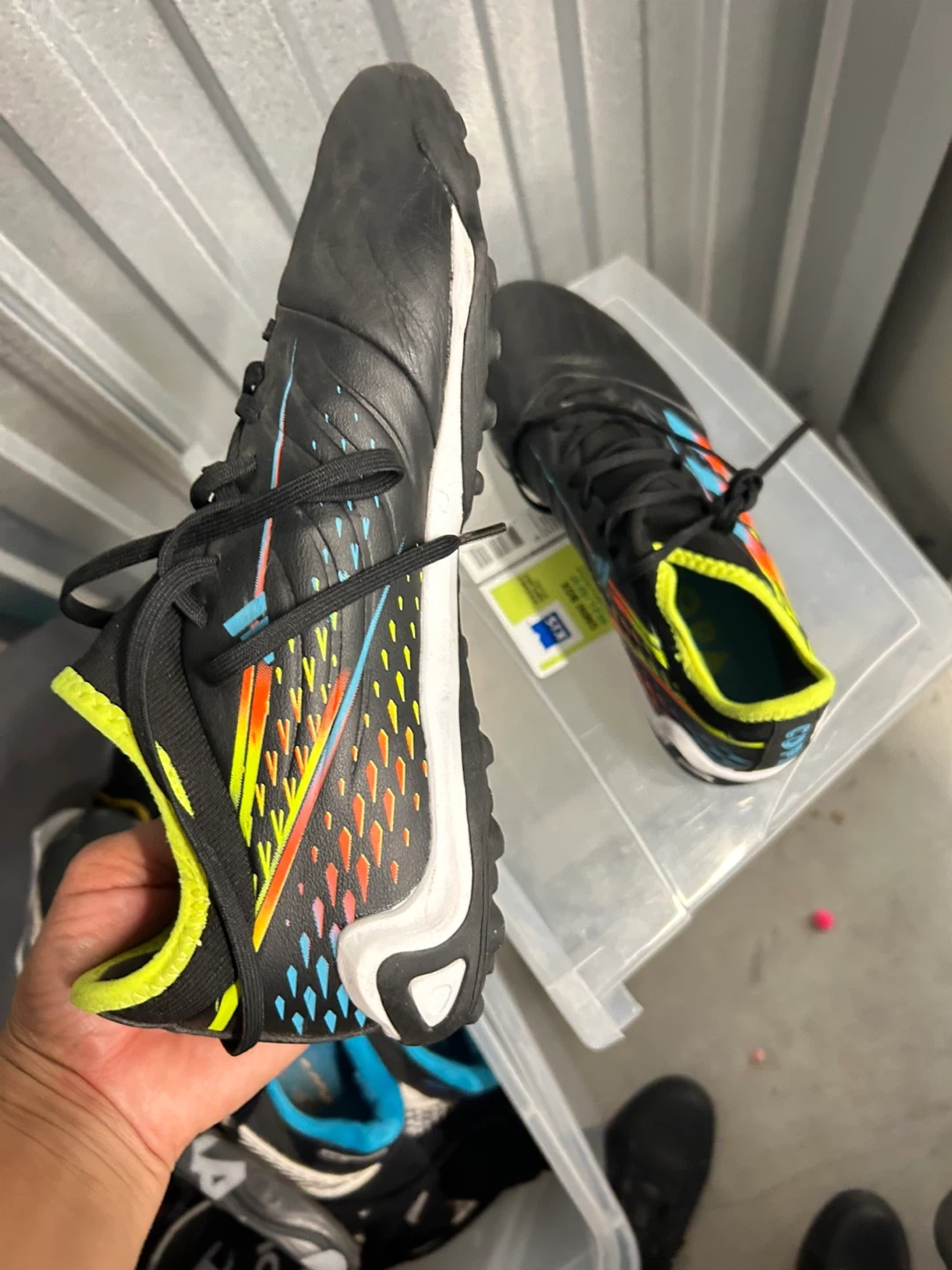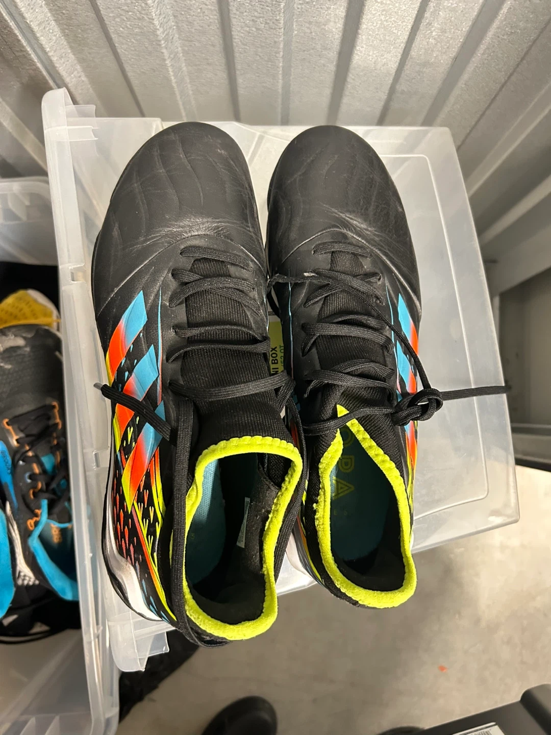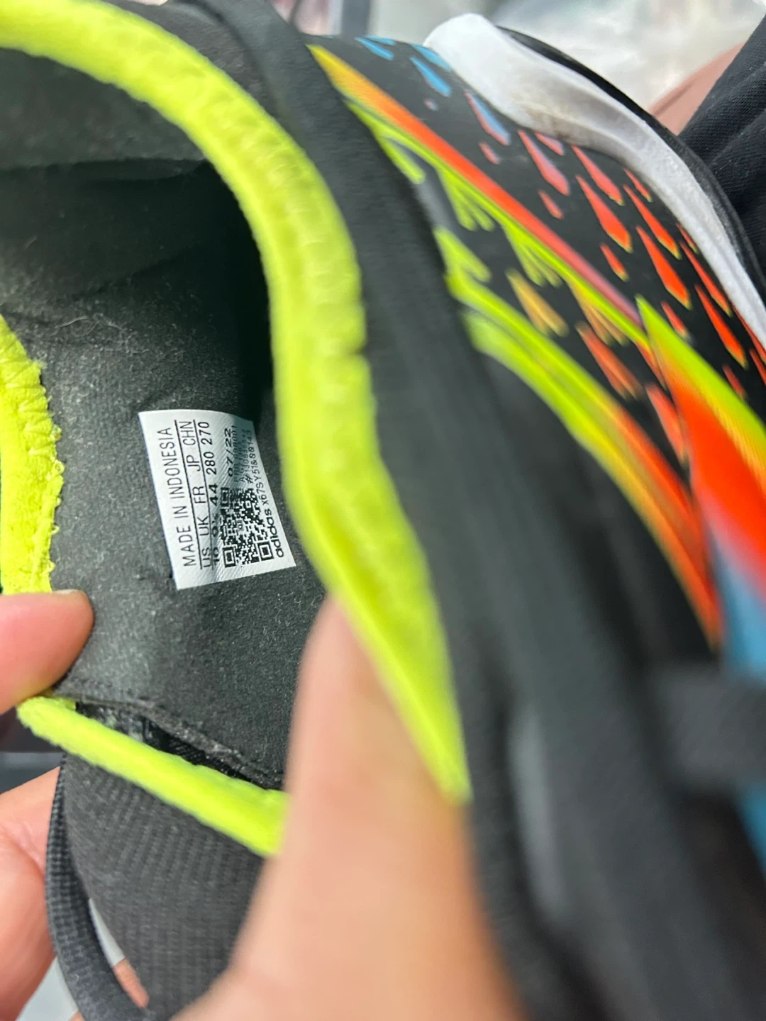 Selling a pair of Adidas soccer cleats. They are black with colourful accents and a bright yellow lining. The size is US 10 / UK 9.5 / FR 44 / JP 280. They have a textured sole for great grip on the field