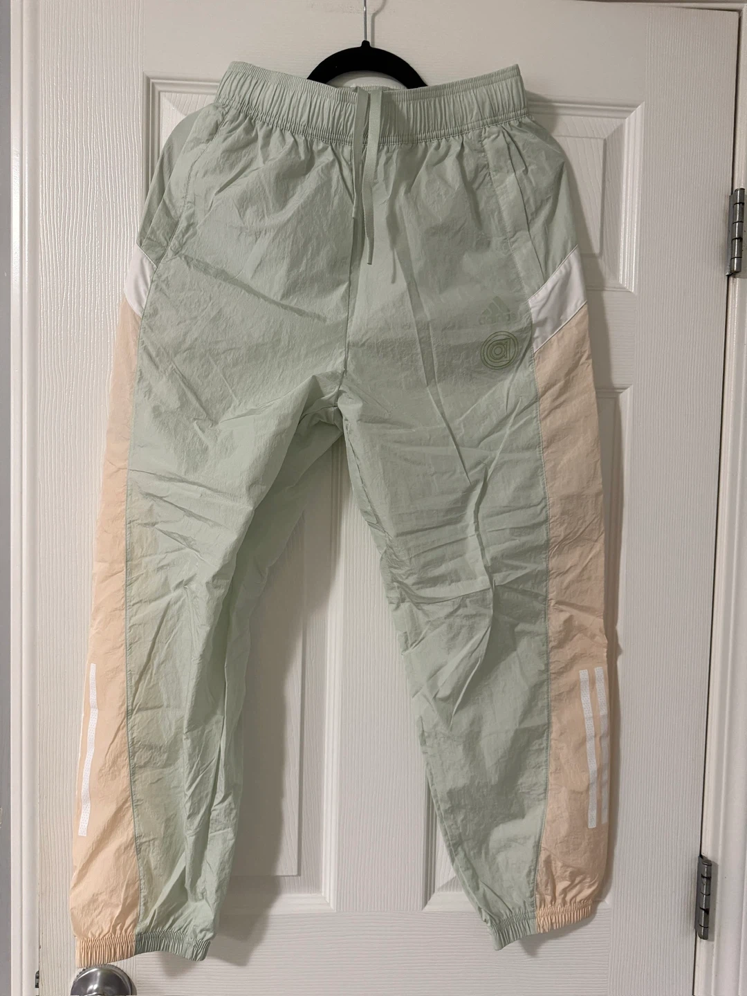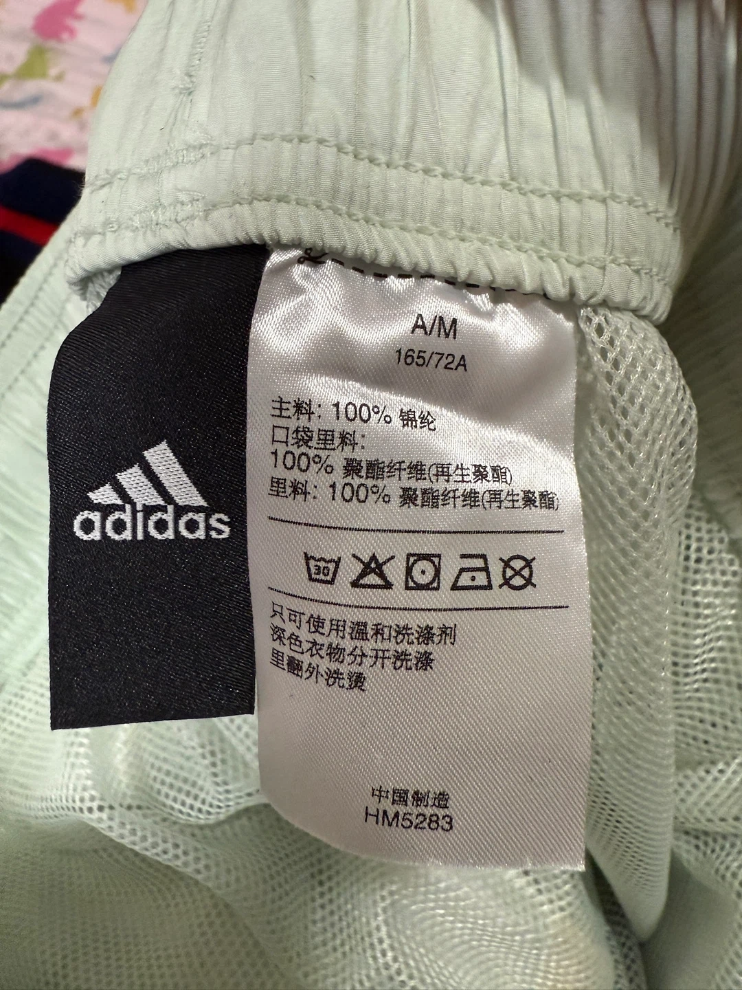 Here are some Adidas track pants in size A/M. The main material is 100% cotton. They have a light green colour with peach and white accents on the sides. Perfect for a casual or sporty look!