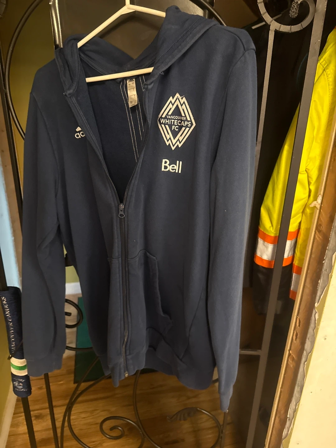 Selling an Adidas Vancouver Whitecaps FC hoodie in navy blue. It features the Whitecaps logo and Bell sponsor logo. Great for showing your team spirit!