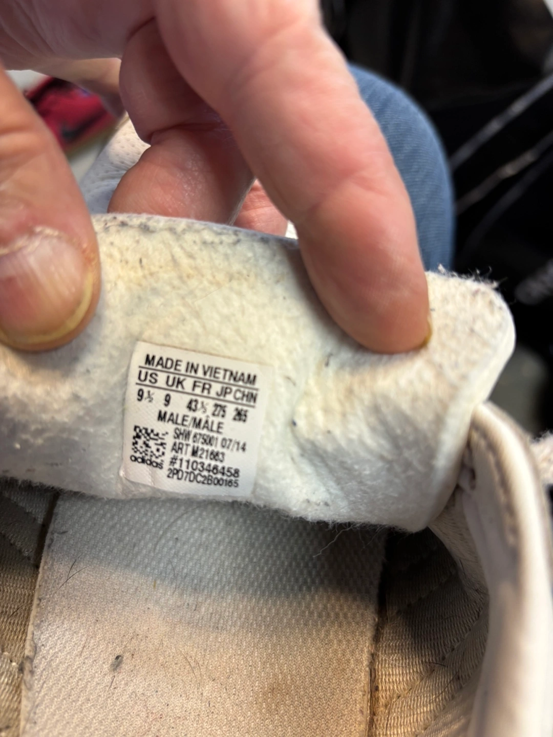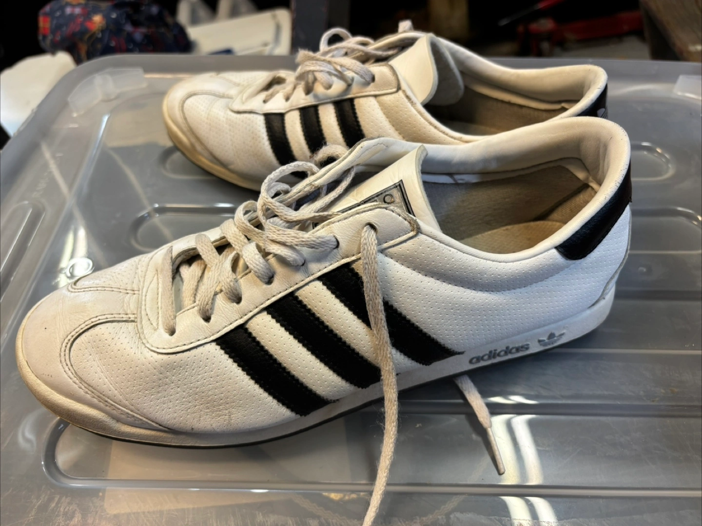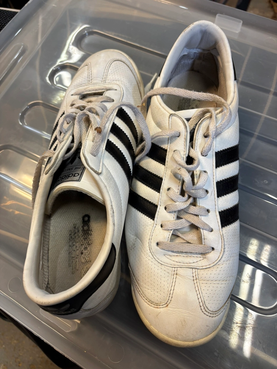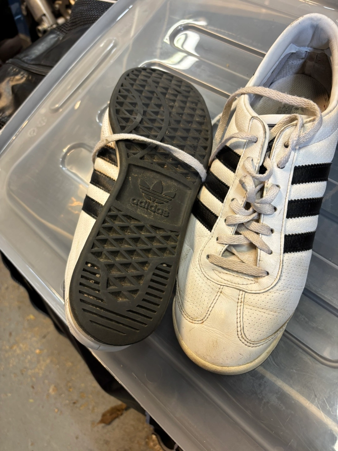 Selling a pair of Adidas sneakers in white with black stripes. They're in used condition, as you can see in the photos, but still have lots of life left! The size is US 9.5. Cash only no e-transfer address available on an ETA