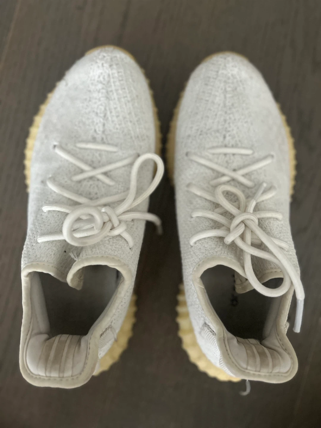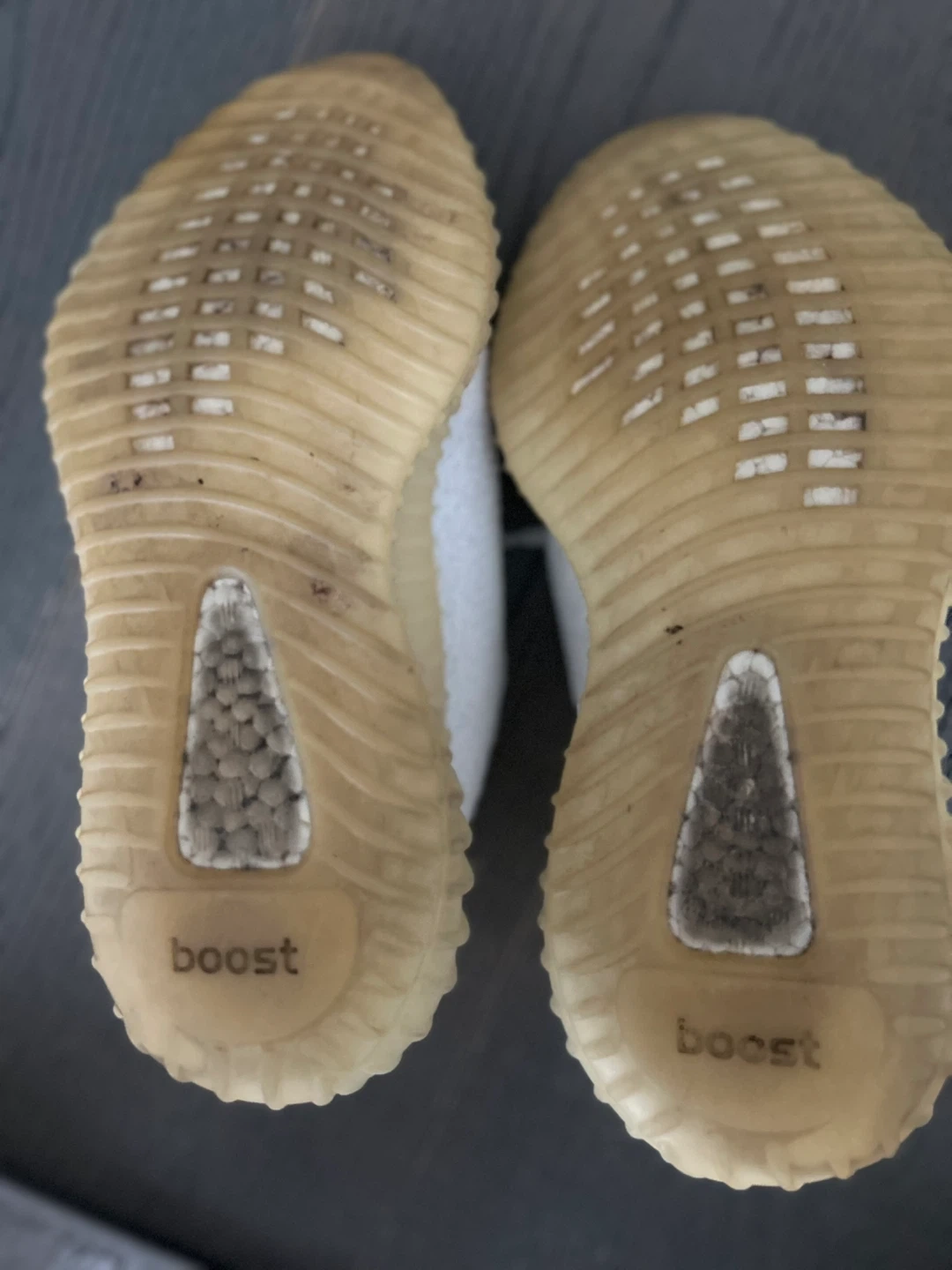 Selling a pair of Adidas Yeezy Boost 350 V2 in the Cream/Triple White colourway. They're in used condition, as you can see from the photos of the soles. Size is US 6. Still lots of life left!
