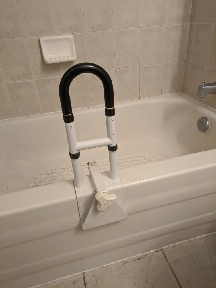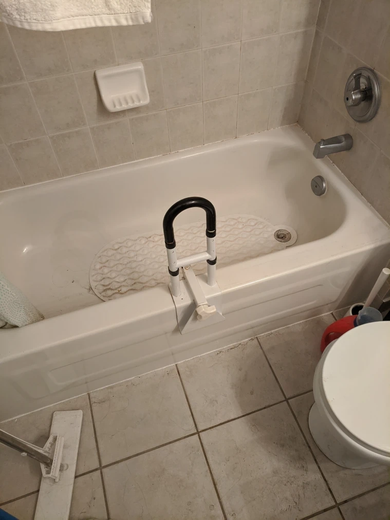 This is a white and black adjustable bathtub grab bar. It provides extra support and safety when getting in and out of the tub. It's easy to install and adjust to fit most standard bathtubs. very strong. Pick up at 195 Merton Street Toronto or pick up at Subway station Davisivill. And I can deliver it to your house but you need to pay me another $3. Thanks.