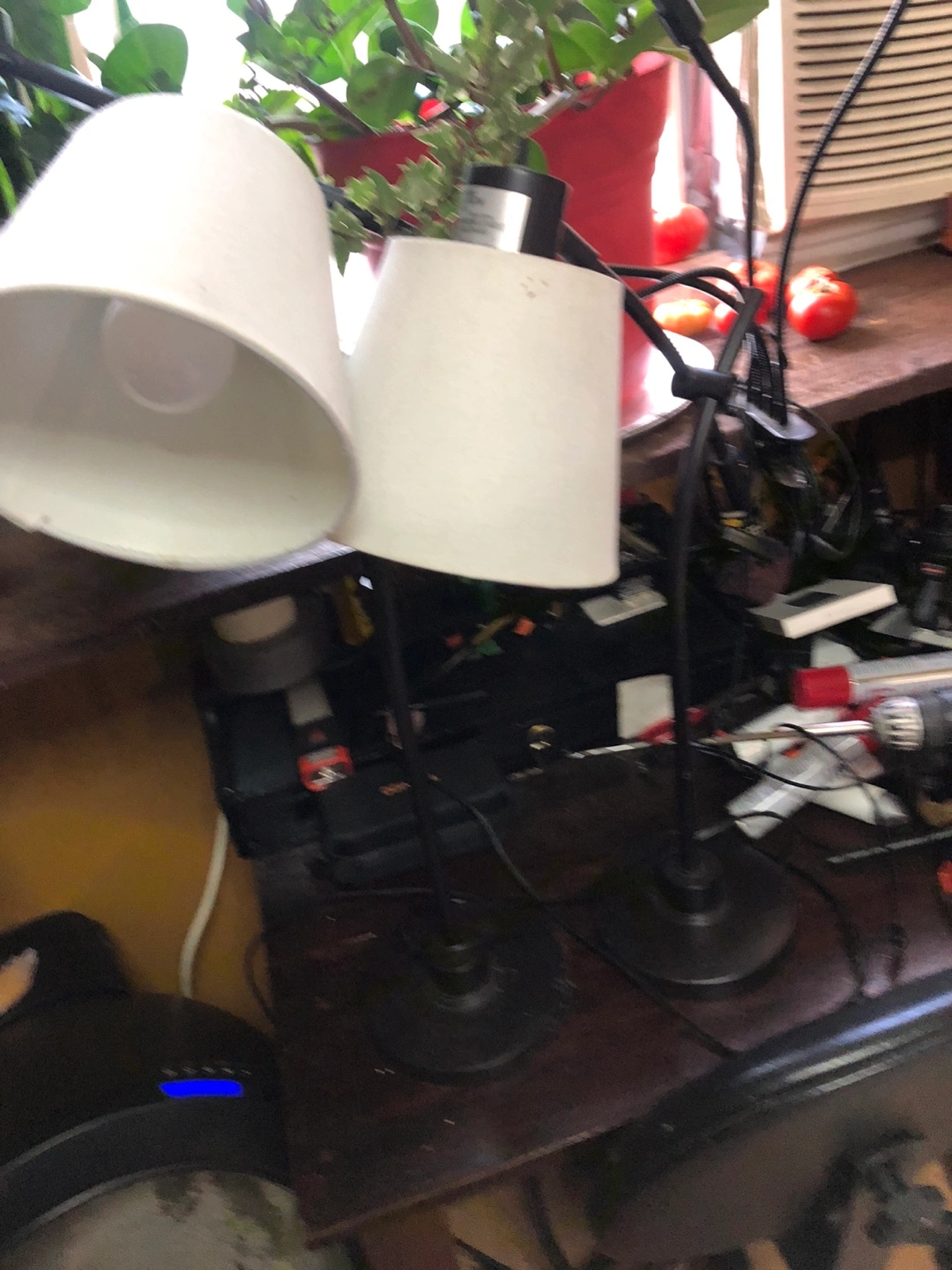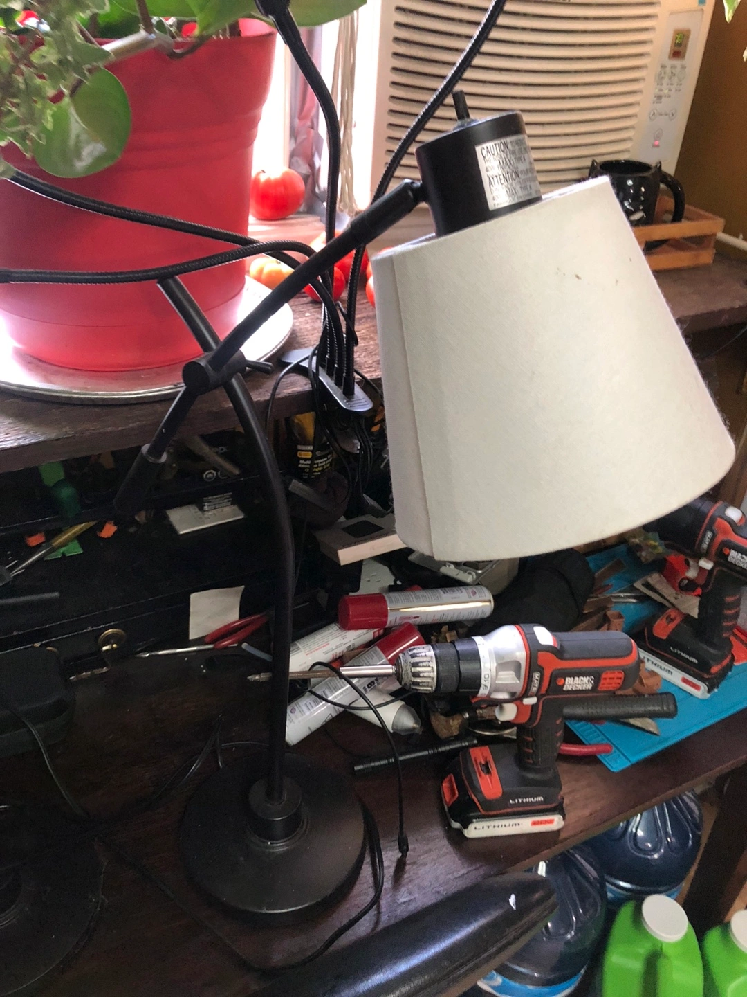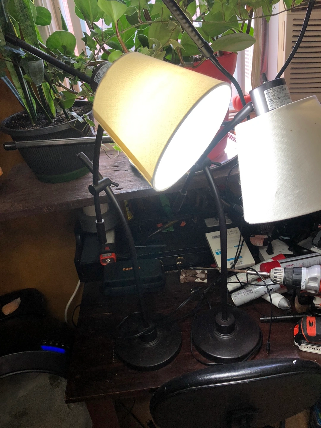 Selling a black desk lamp with an adjustable arm and a white shade. It's perfect for a desk or bedside table, and the adjustable arm makes it easy to direct the light where you need it. It's in good condition and ready to light up your space!