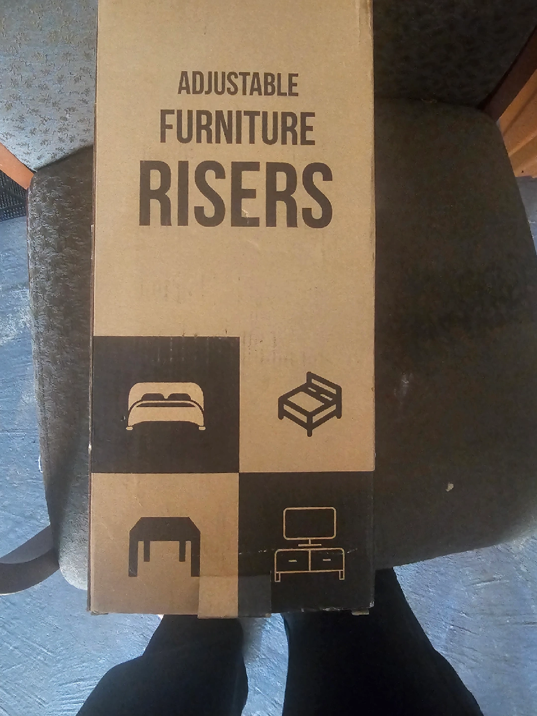 Selling a set of adjustable furniture risers in black! These are great for adding some extra height to your bed, couch, or table. They're in excellent condition and come in the original box