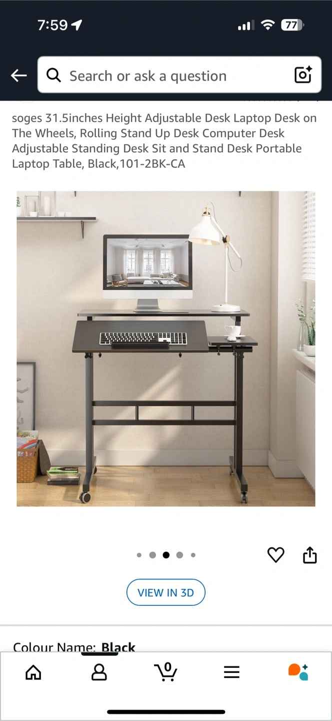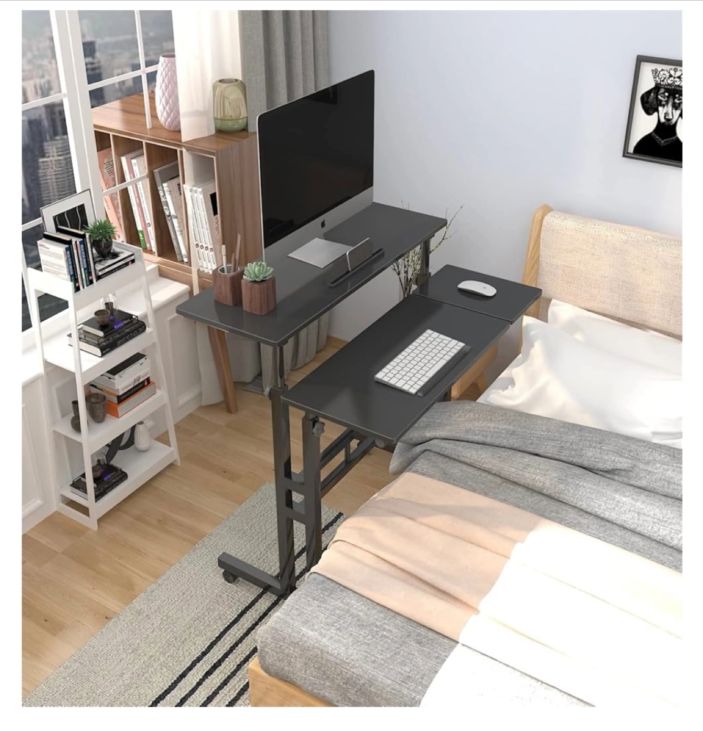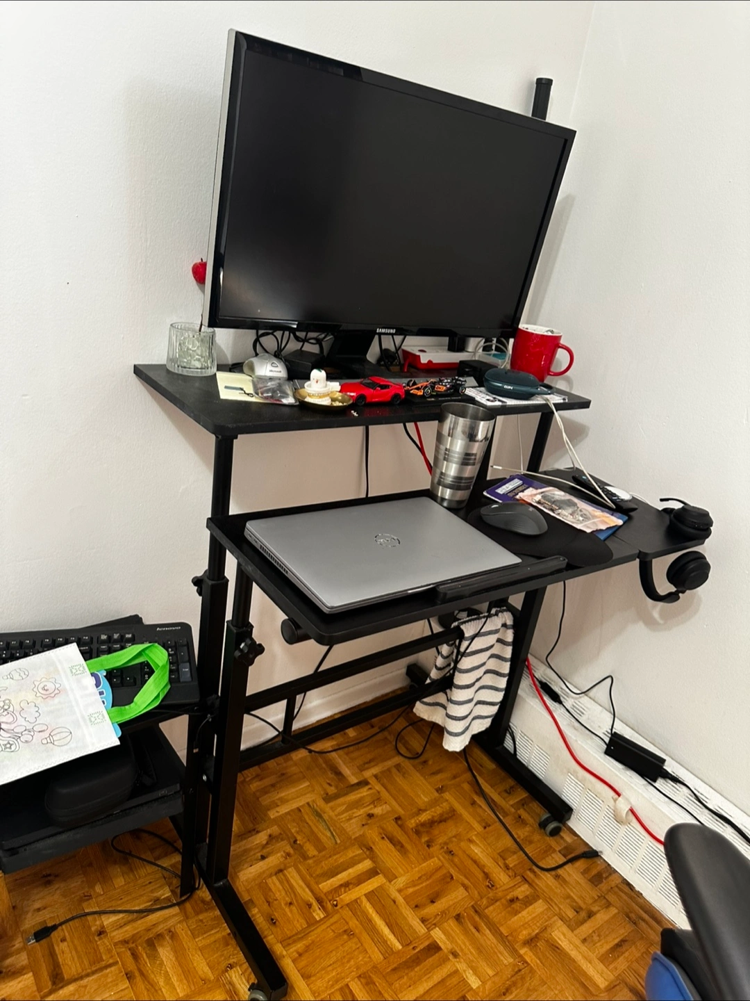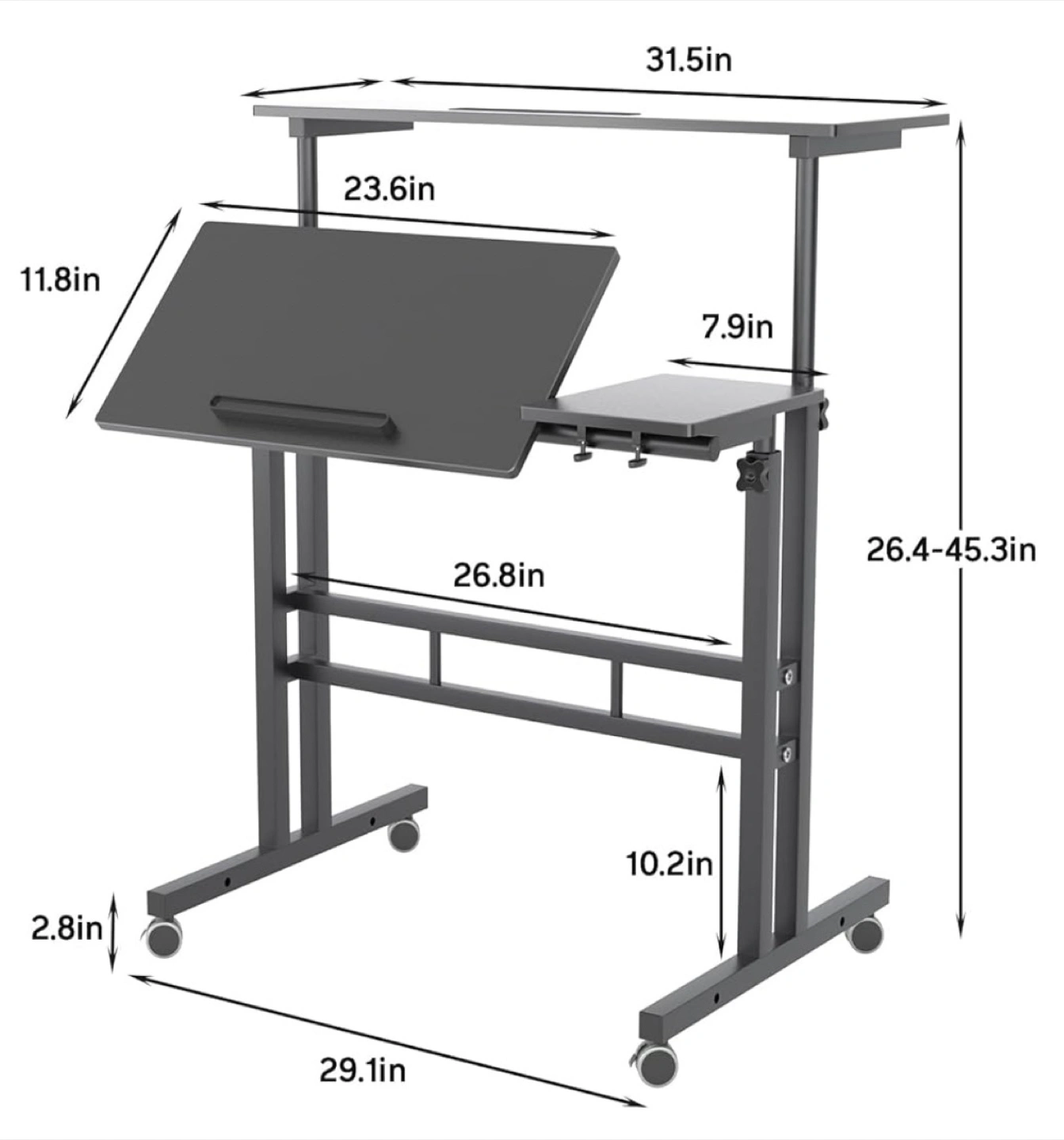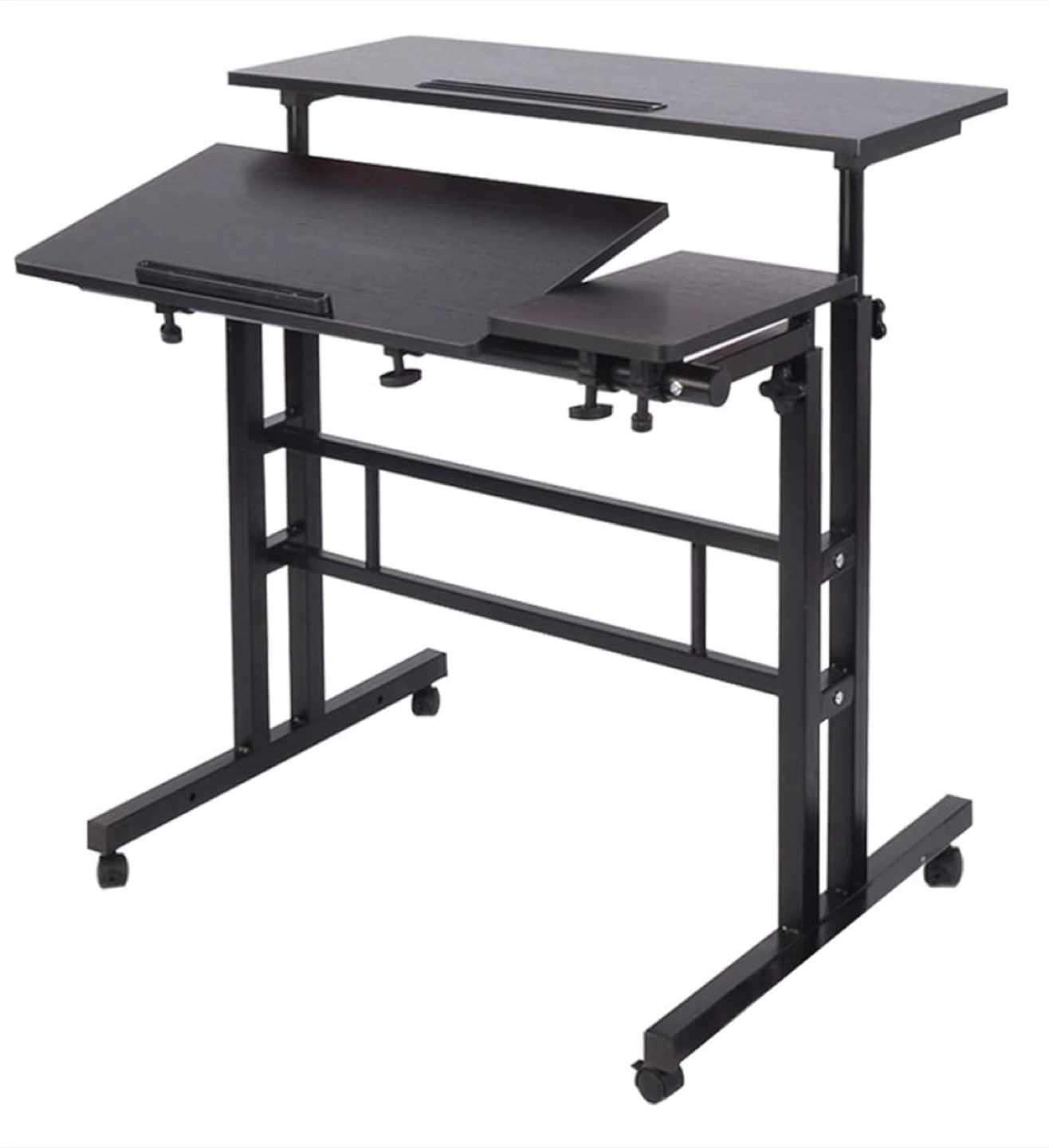 Selling a handy adjustable height rolling desk in black. It's perfect for setting up a workstation anywhere you need it! The height can be adjusted to suit your needs, and the rolling wheels make it easy to move around. It's in great condition and ready for a new home