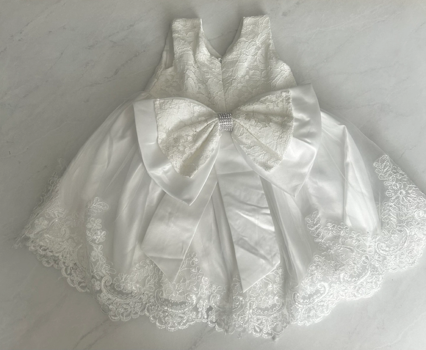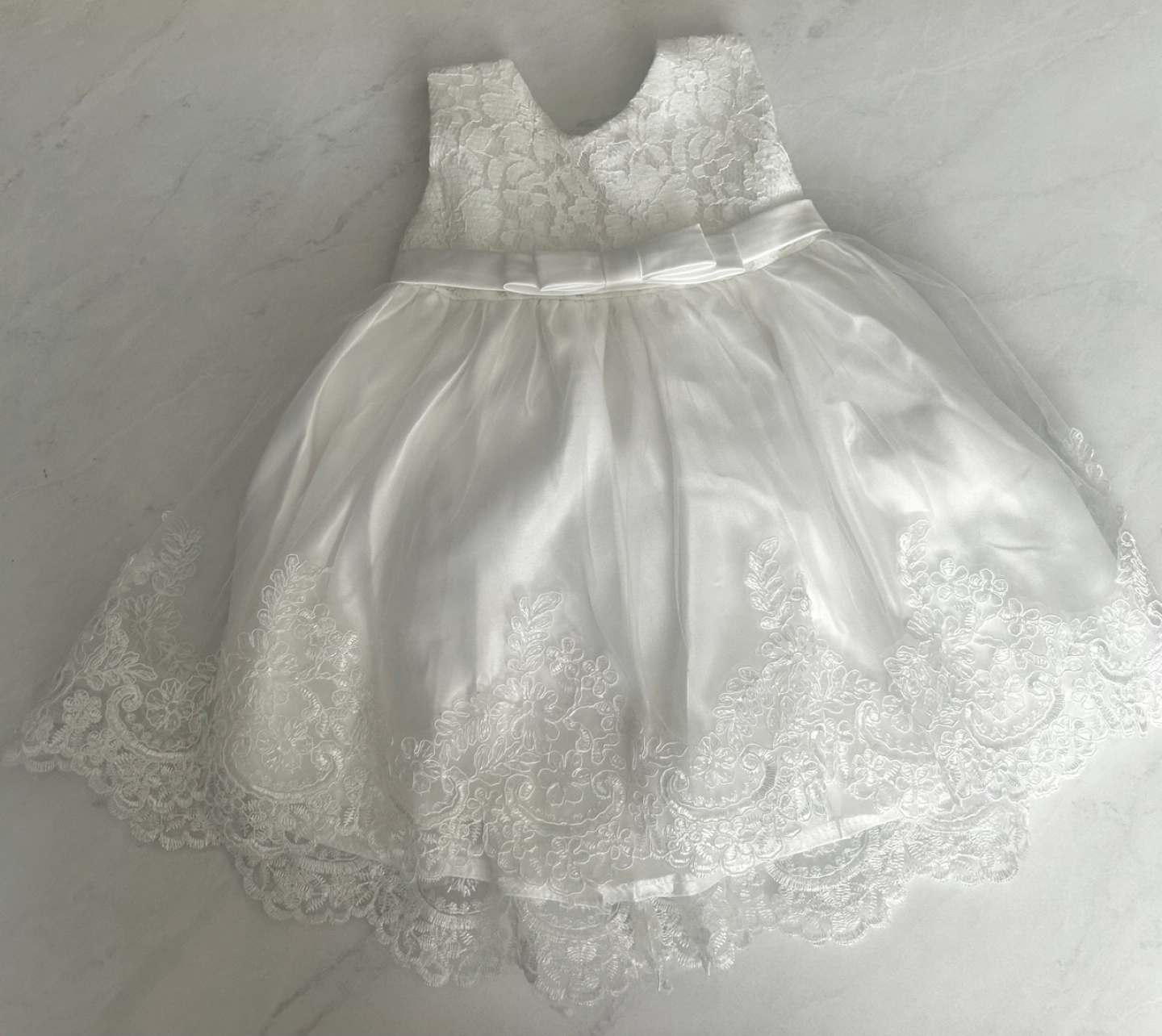 Beautiful white lace dress, perfect for special occasions. Features a large bow on the back. Sleeveless design. Lace detailing around the hem. Size 18 months. This dress was used only for 4 hours for my baby Christening. Very good and perfect condition. Open for offers.