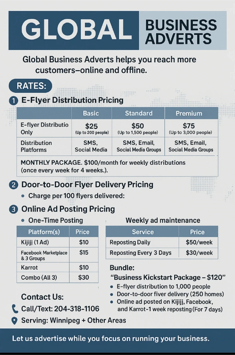 Global Business Adverts Global Business Adverts helps you reach more customers—online and offline. ⸻ ✅ Our Services: ⸻ 💻 E-Flyer Distribution Get your business seen fast—right on people’s phones! • Digital flyers sent via SMS, Email, and Social Media Groups • Targeted audience reach (local or wide) • Perfect for promotions, new products, sales & more ✔ Fast ✔ Affordable ✔ Results-driven ⸻ 🚪 Door-to-Door Flyer Delivery Reach customers directly in their homes! • We deliver your printed flyers house-to-house • Residential, commercial, or neighborhood-specific • You choose the area—we deliver the message • Daily or weekly drop options available Let real people see your offer at their front door! ⸻ 🌐 Online Ad Posting Let us post your ads on high-traffic platforms: • Kijiji • Facebook Marketplace & Groups • Karrot We help you: • Deliver compelling ads • Select the best categories • Post to multiple local groups • Repost and refresh ads for visibility 📈 Great for: • Small businesses • Events & promotions • Buy & sell services or items • Cleaning, beauty, repair, food, and more! ⸻ 📞 Ready to Advertise? Let’s get started today! Contact Us: 📱 Text: 204-318-1106 📍 Serving: Winnipeg + Other Areas ⸻ ✨ Ask about our combo deals & weekly plans for more savings! Let us advertise while you focus on running your business.