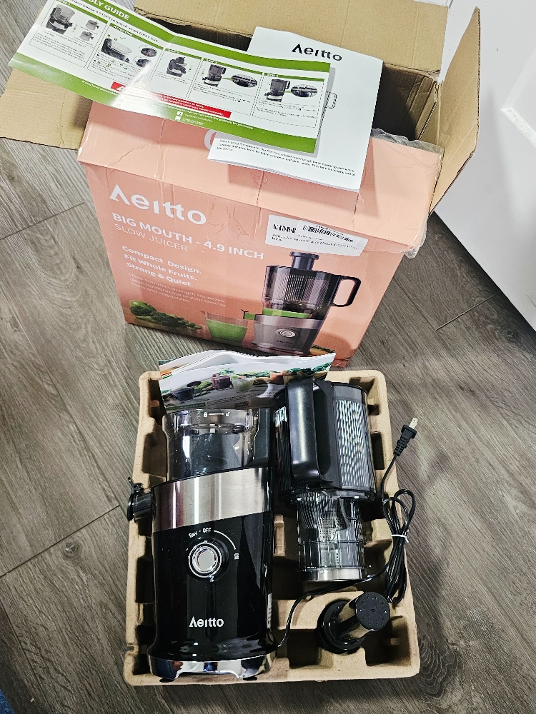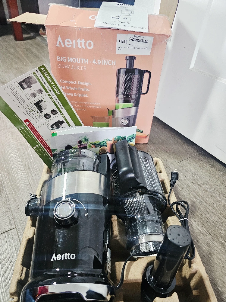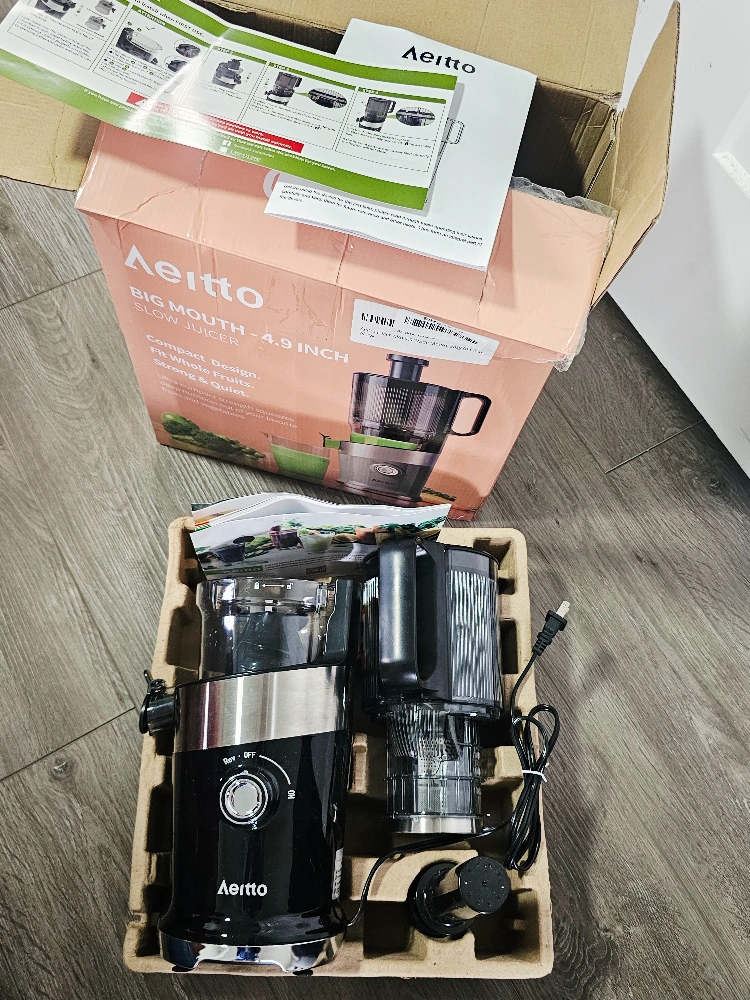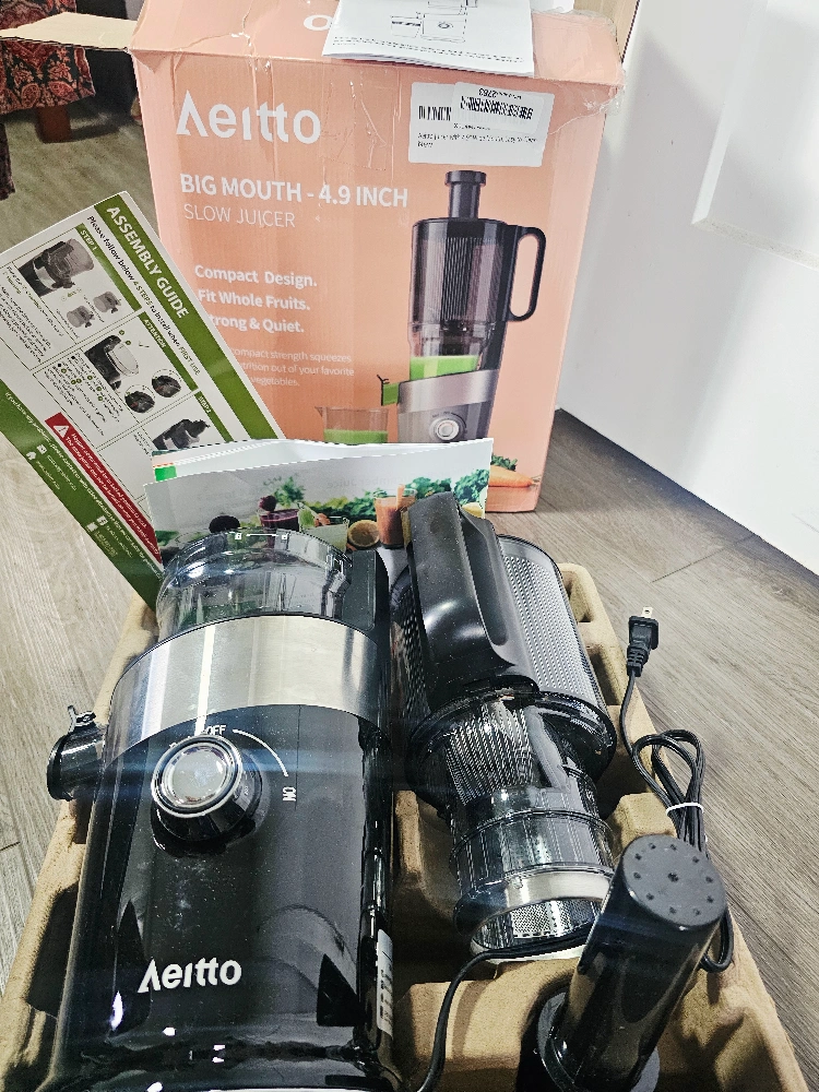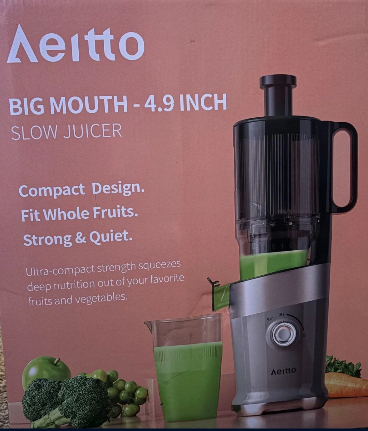 I'm selling an Aeitto Big Mouth 4.9 Inch Slow Juicer! It has a compact design and fits whole fruits. It's also strong and quiet. The juicer squeezes deep nutrition out of your favourite fruits and vegetables. Assembly guide included. Comes with the box!
