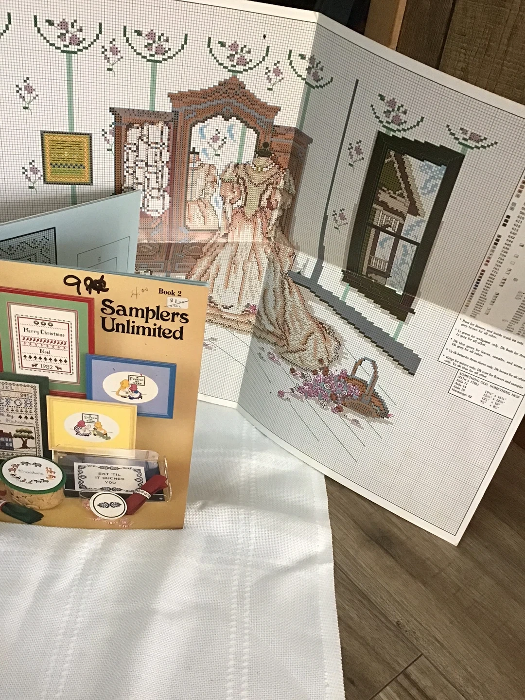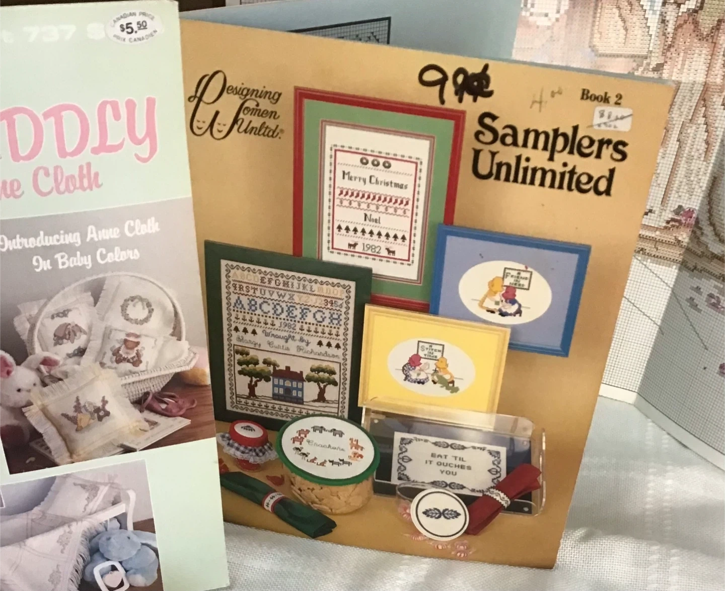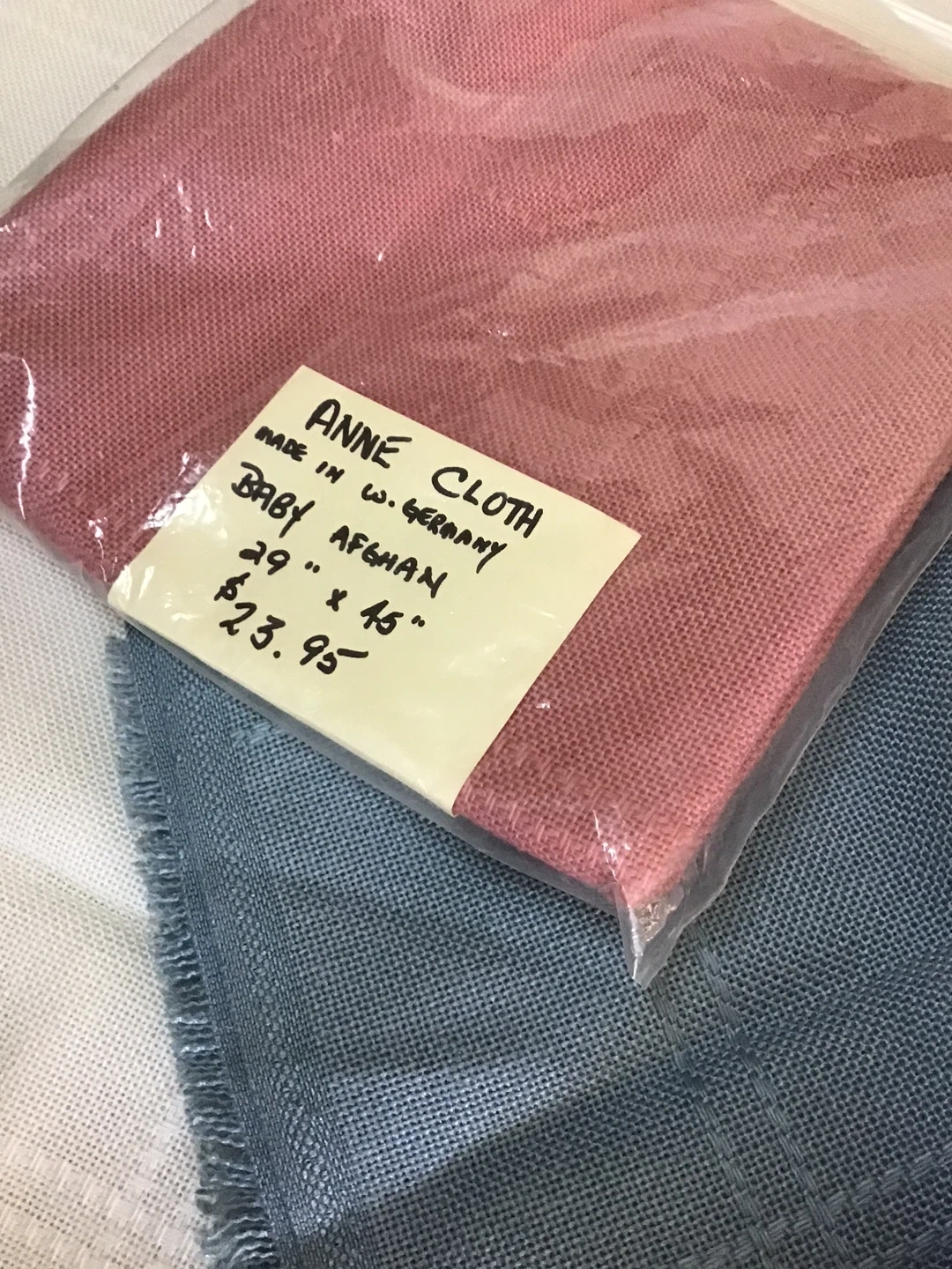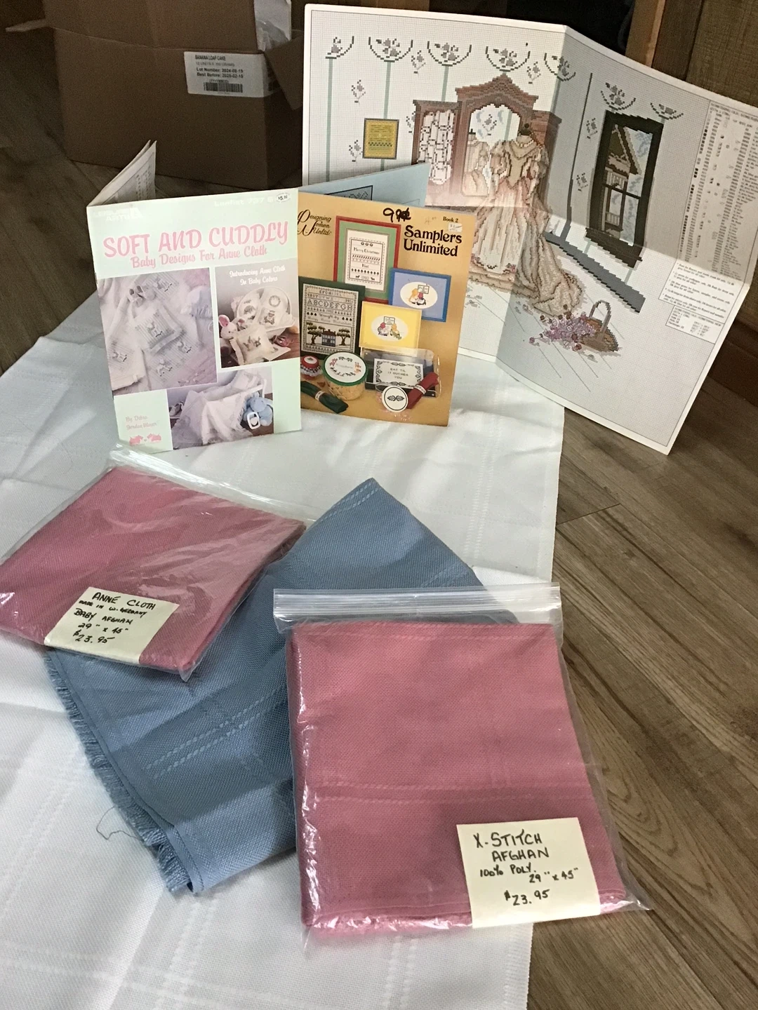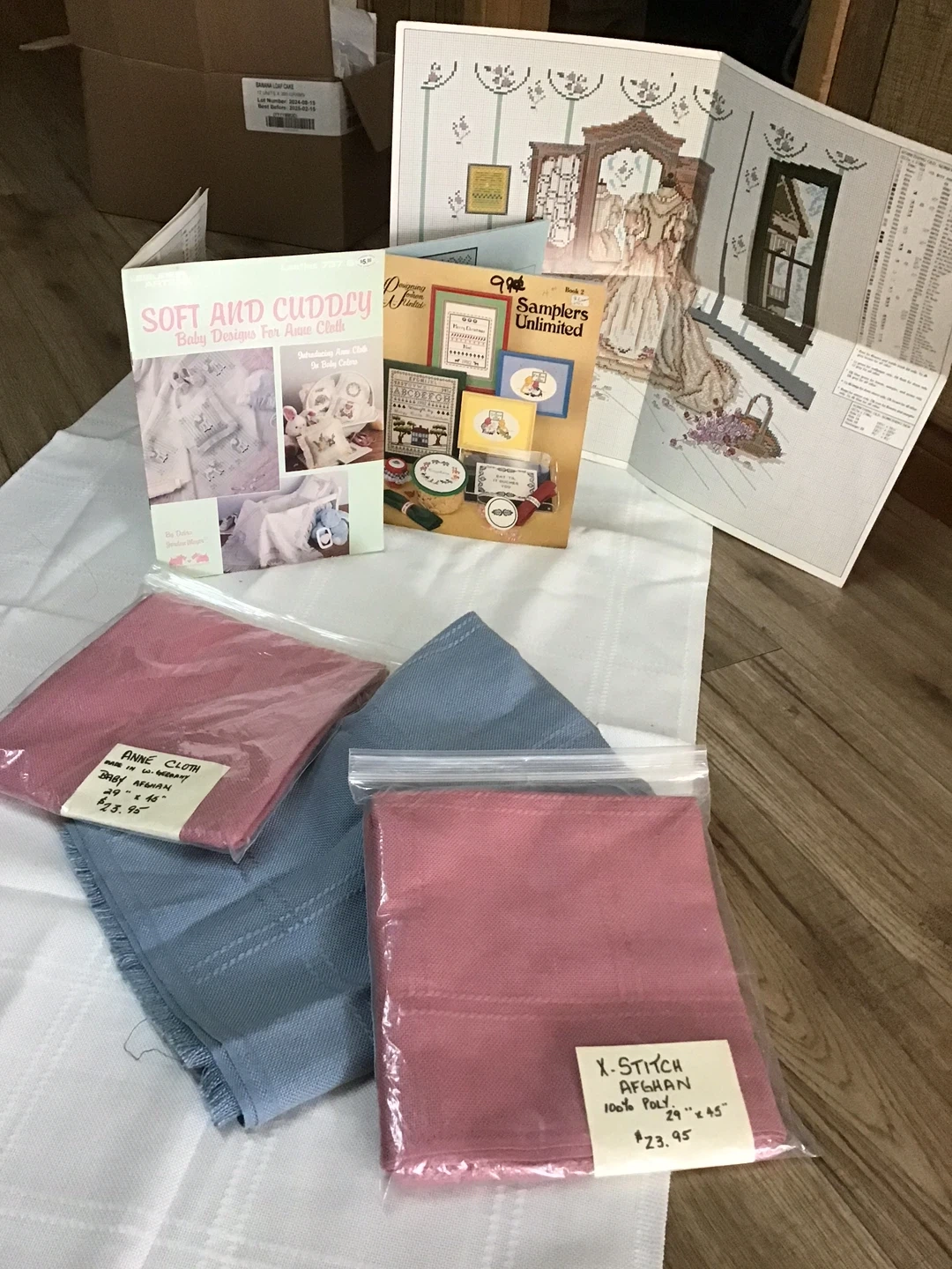 Selling a set of cross stitch material. Afghan size - 29 x 45” pieces of Aida cloth one pink 'X-Stitch Afghan' and one white one blue 'Anne Cloth Baby Afghan', both 29" x 45" 100% poly. Create your personalized design for baby - 'Soft and Cuddly' Baby Designs For Anne Cloth pattern book - 'Samplers Unlimited' pattern book. Price Aida is $15 not marked price. Pattern booklets 99 cents