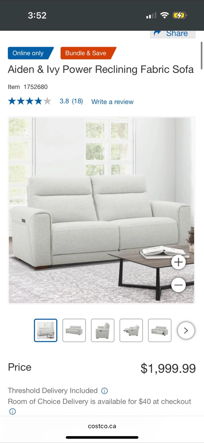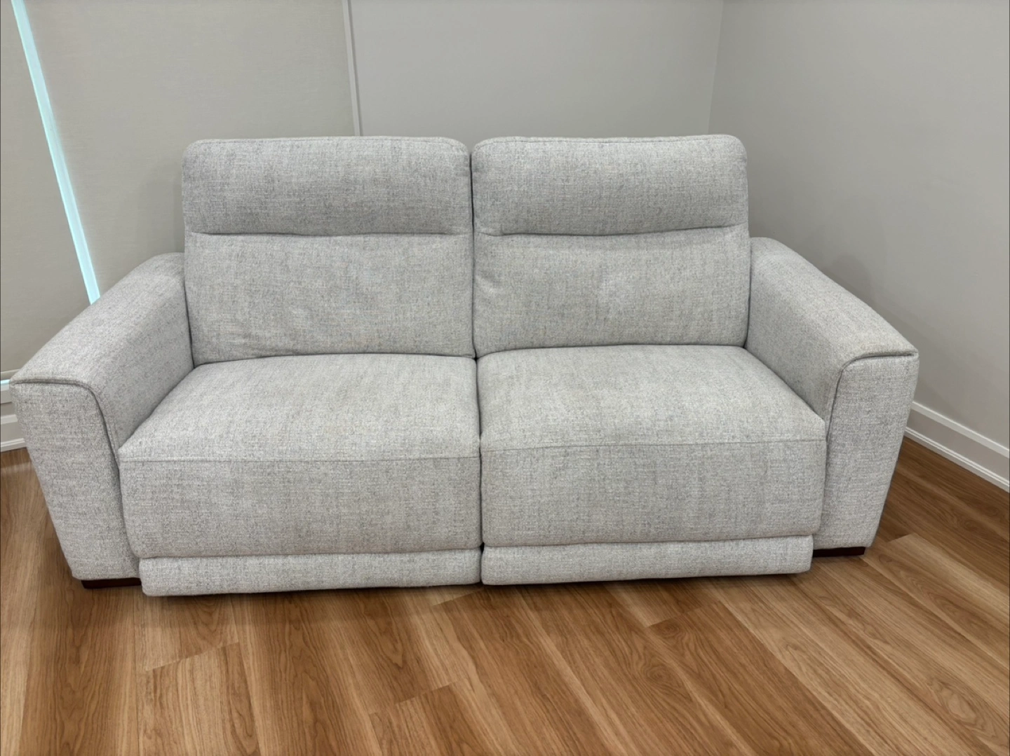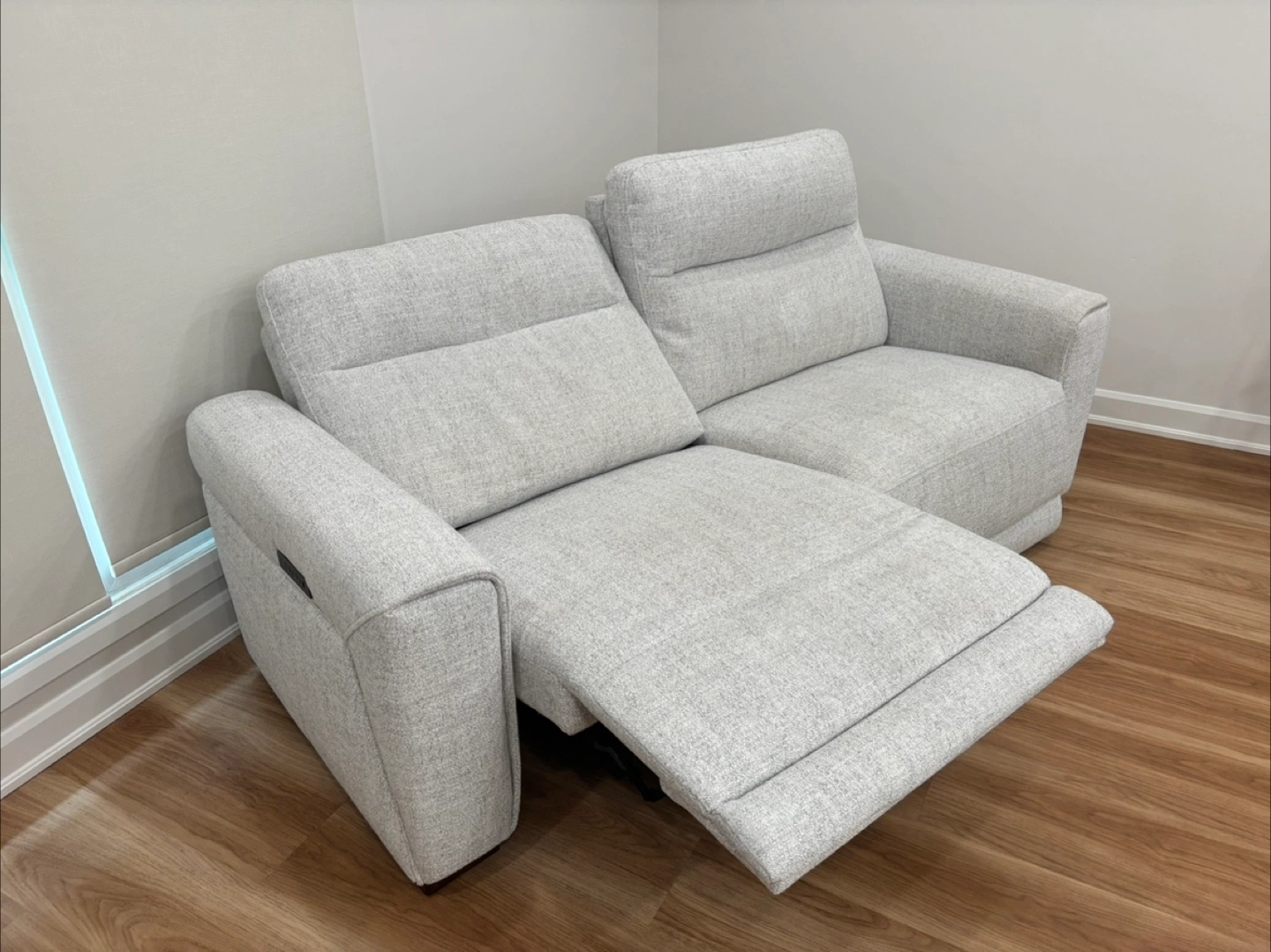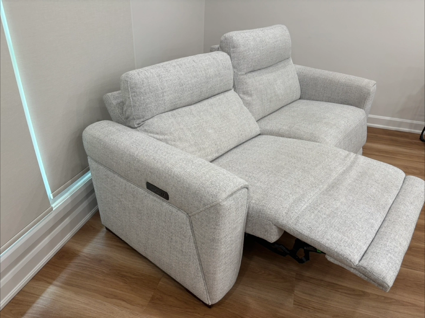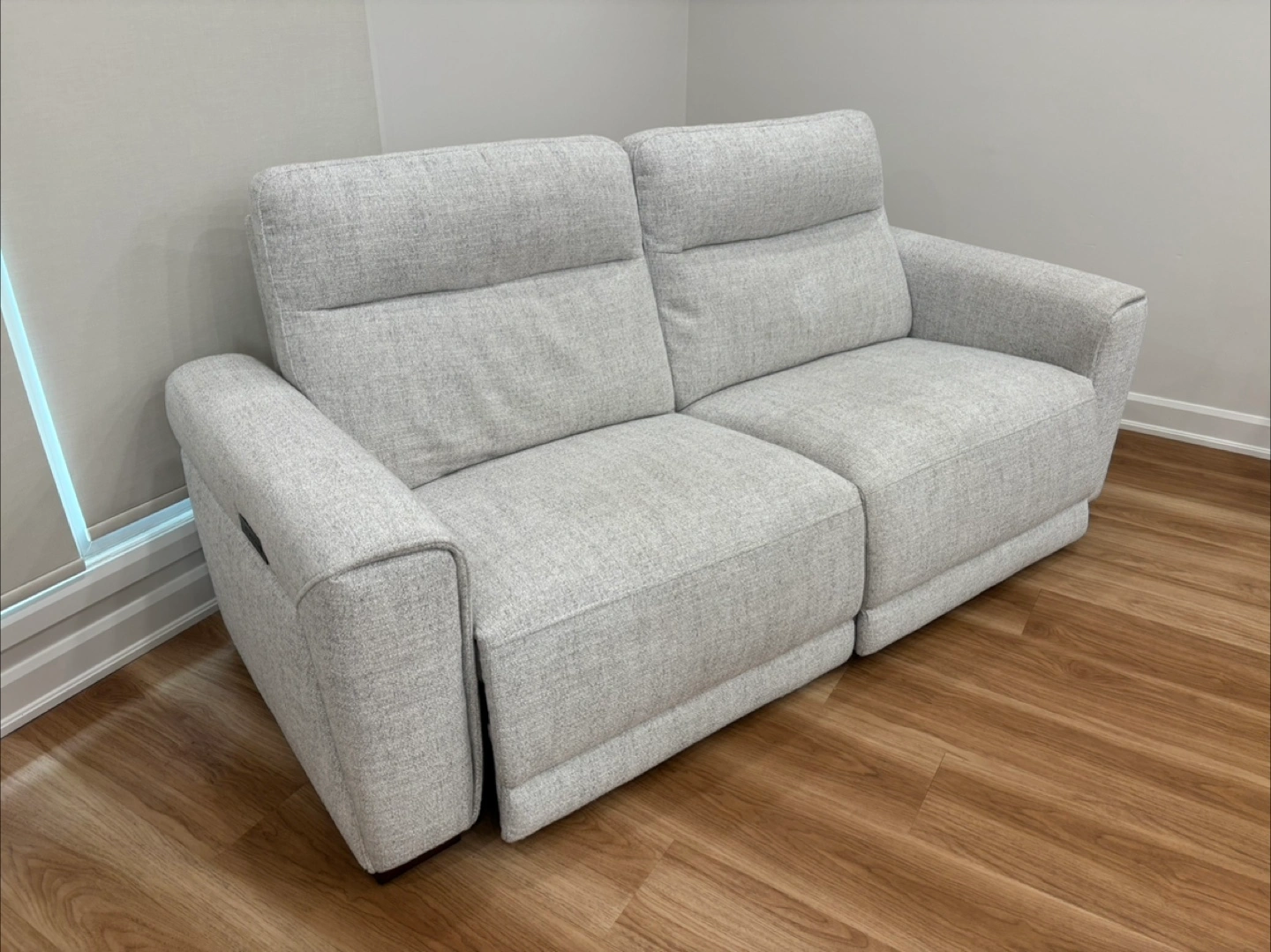 Grey power reclining sofa. Just over a year old. Good condition. Features: Upholstered in polyester fabric 2 power reclining seats 2 power adjustable headrests Metal switches with USB and USB-C ports Pick up required Sold at Costco for 1,999$
