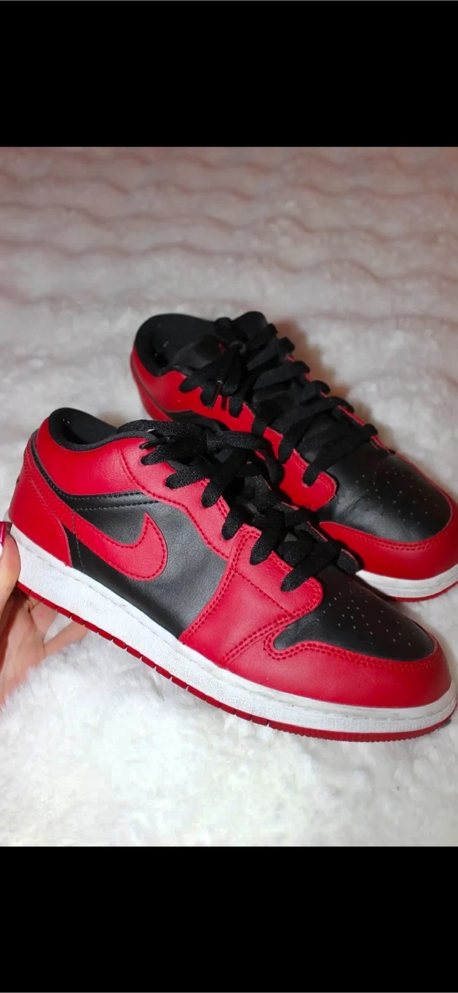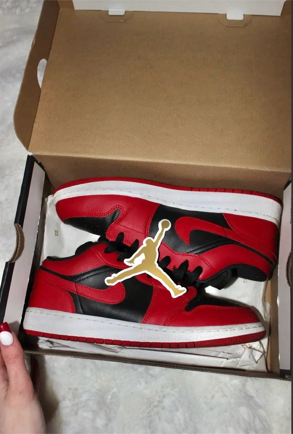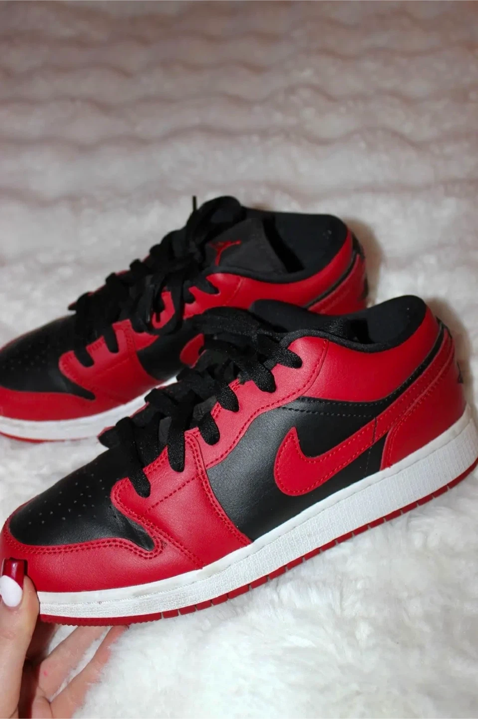Selling a pair of Air Jordan 1 Low sneakers in a vibrant red and black colourway! These stylish kicks are in great condition and come with the original box. Perfect for adding a pop of colour to your wardrobe or for everyday wear. They feature the iconic Air Jordan logo on the heel. Don't miss out on these classic sneakers!💕