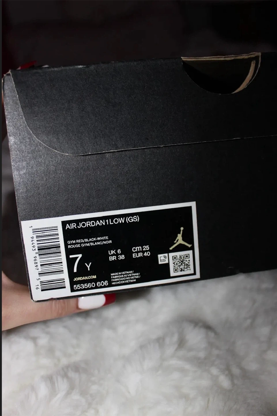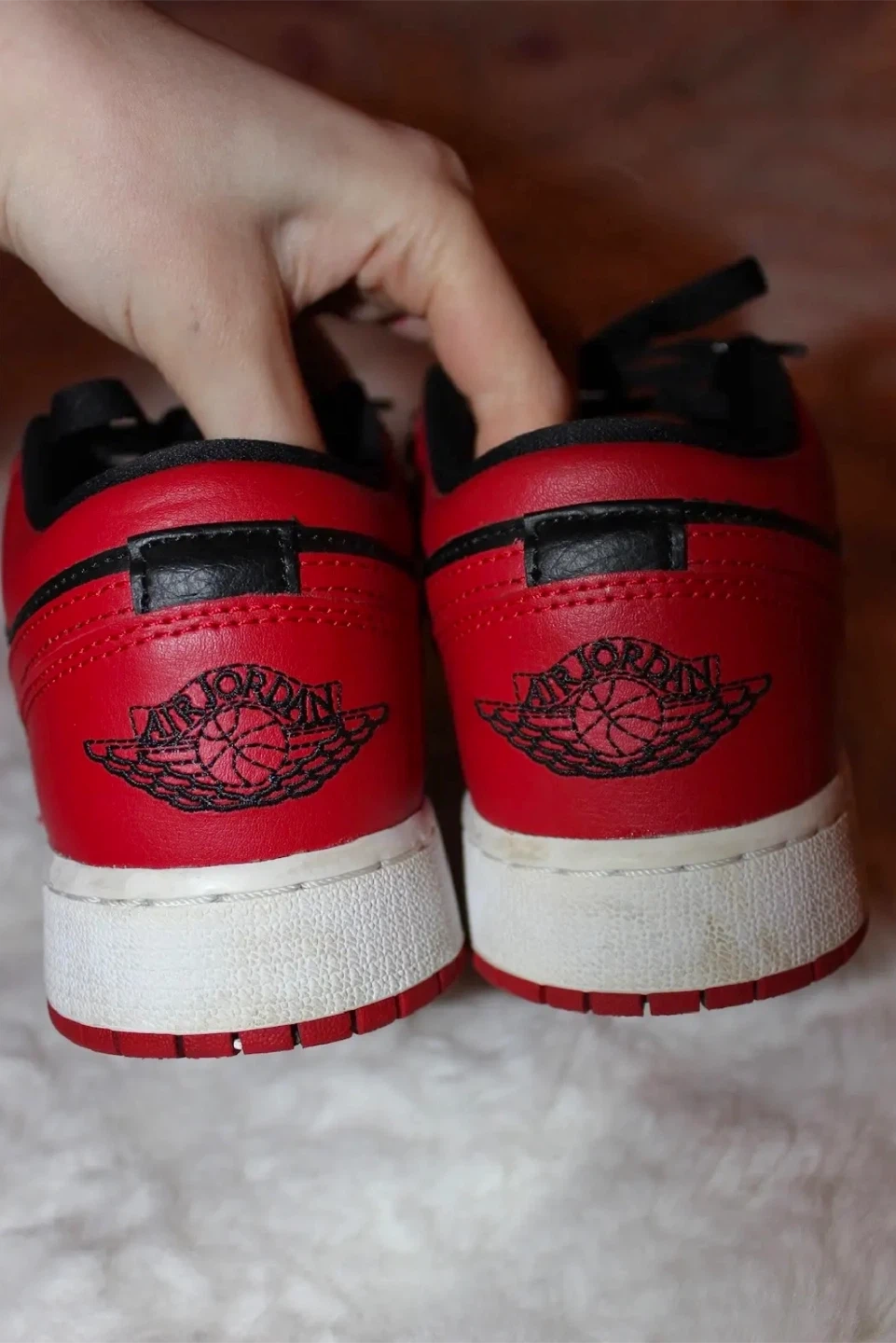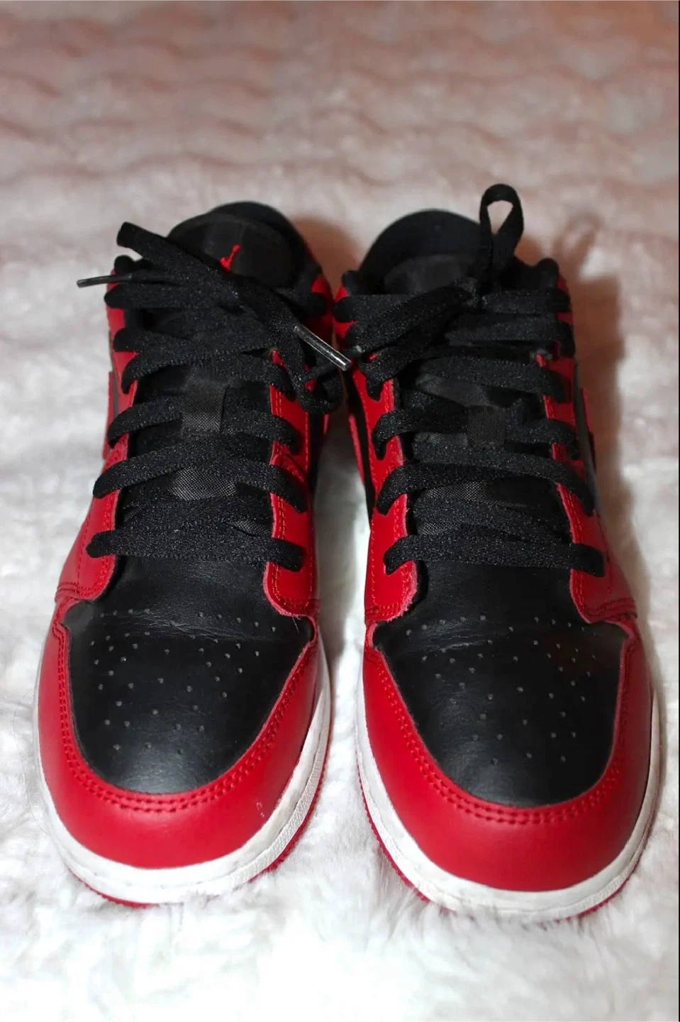Selling a pair of Air Jordan 1 Low sneakers in a vibrant red and black colourway! These stylish kicks are in great condition and come with the original box. Perfect for adding a pop of colour to your wardrobe or for everyday wear. They feature the iconic Air Jordan logo on the heel. Don't miss out on these classic sneakers!💕