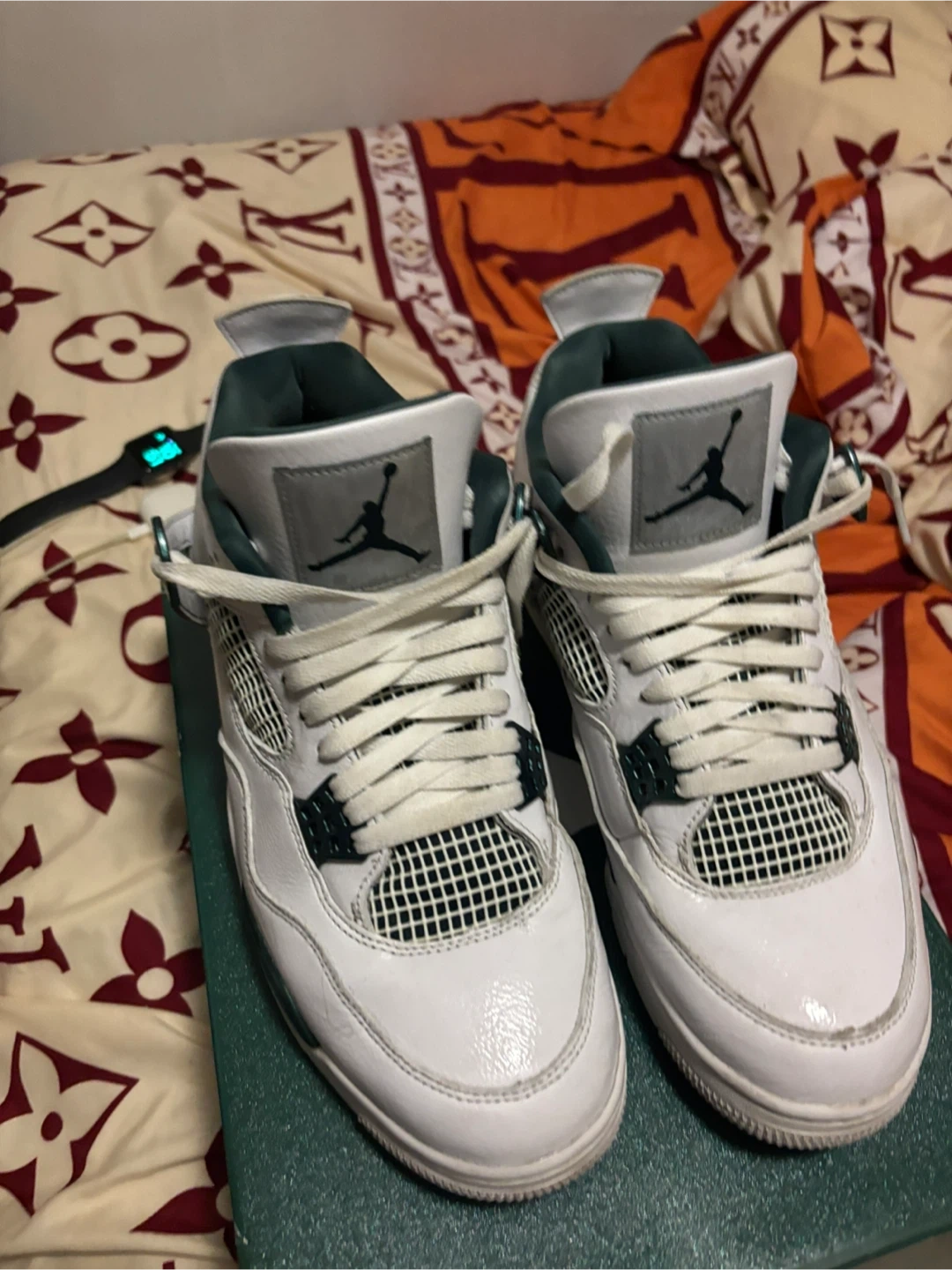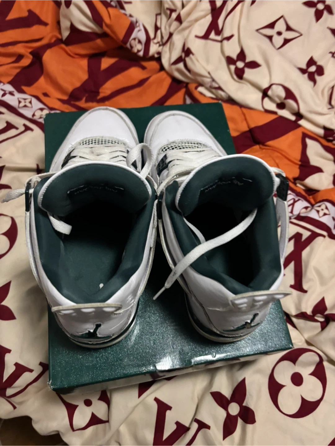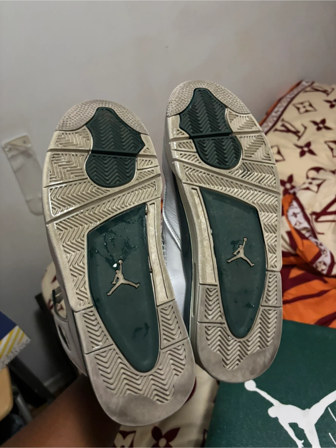 Selling a pair of Air Jordan 4 Retro sneakers in white and green. These are a US size 11.5 and come with the original box. They show some signs of wear on the soles, but are otherwise in good condition!