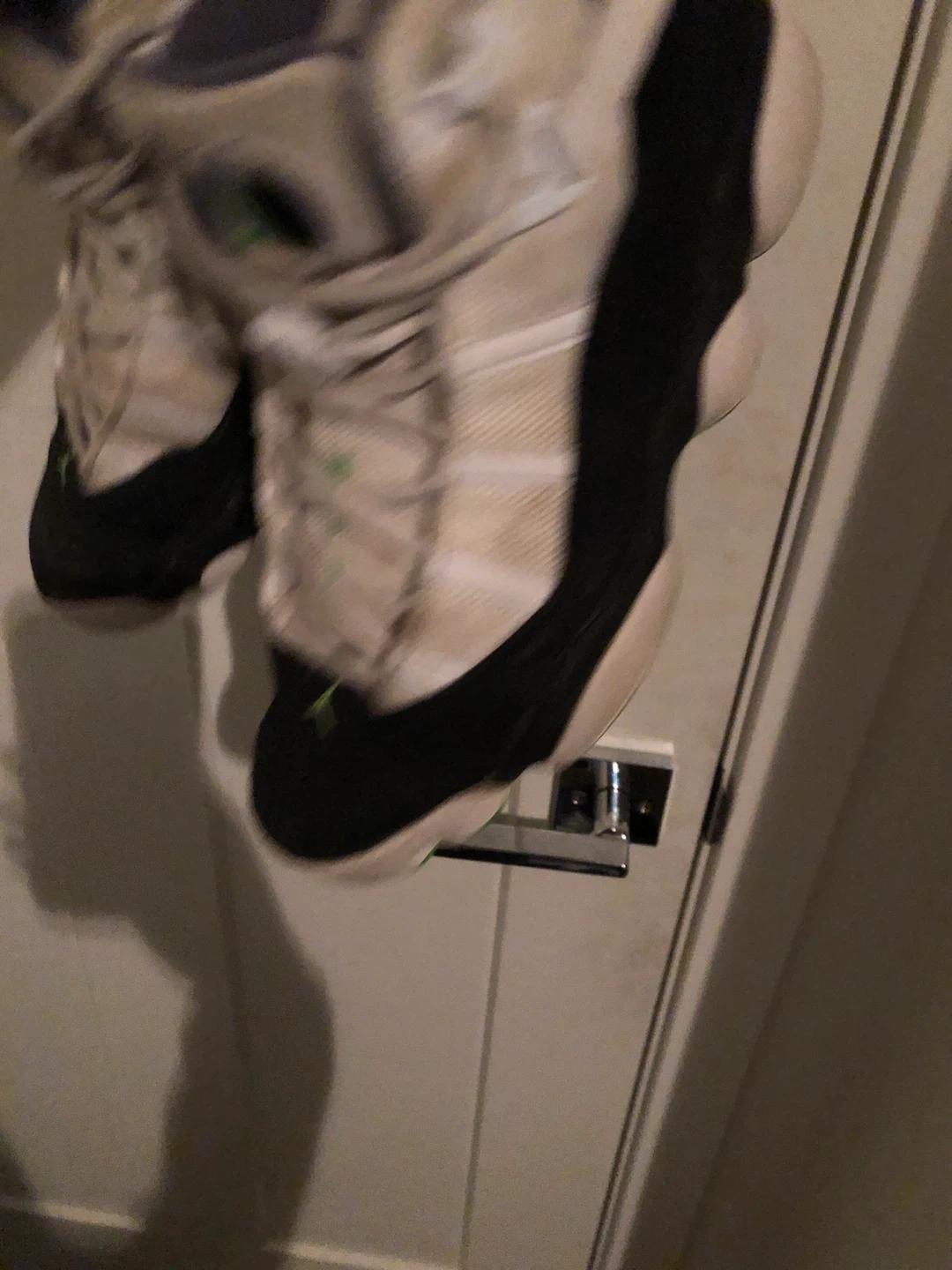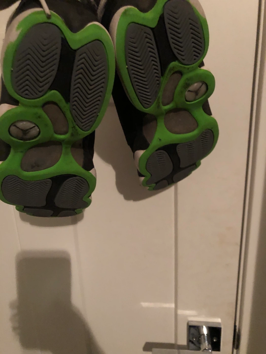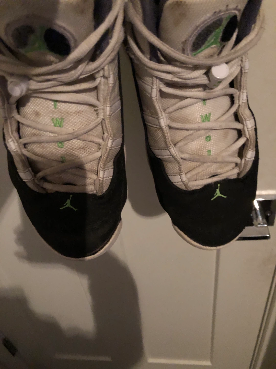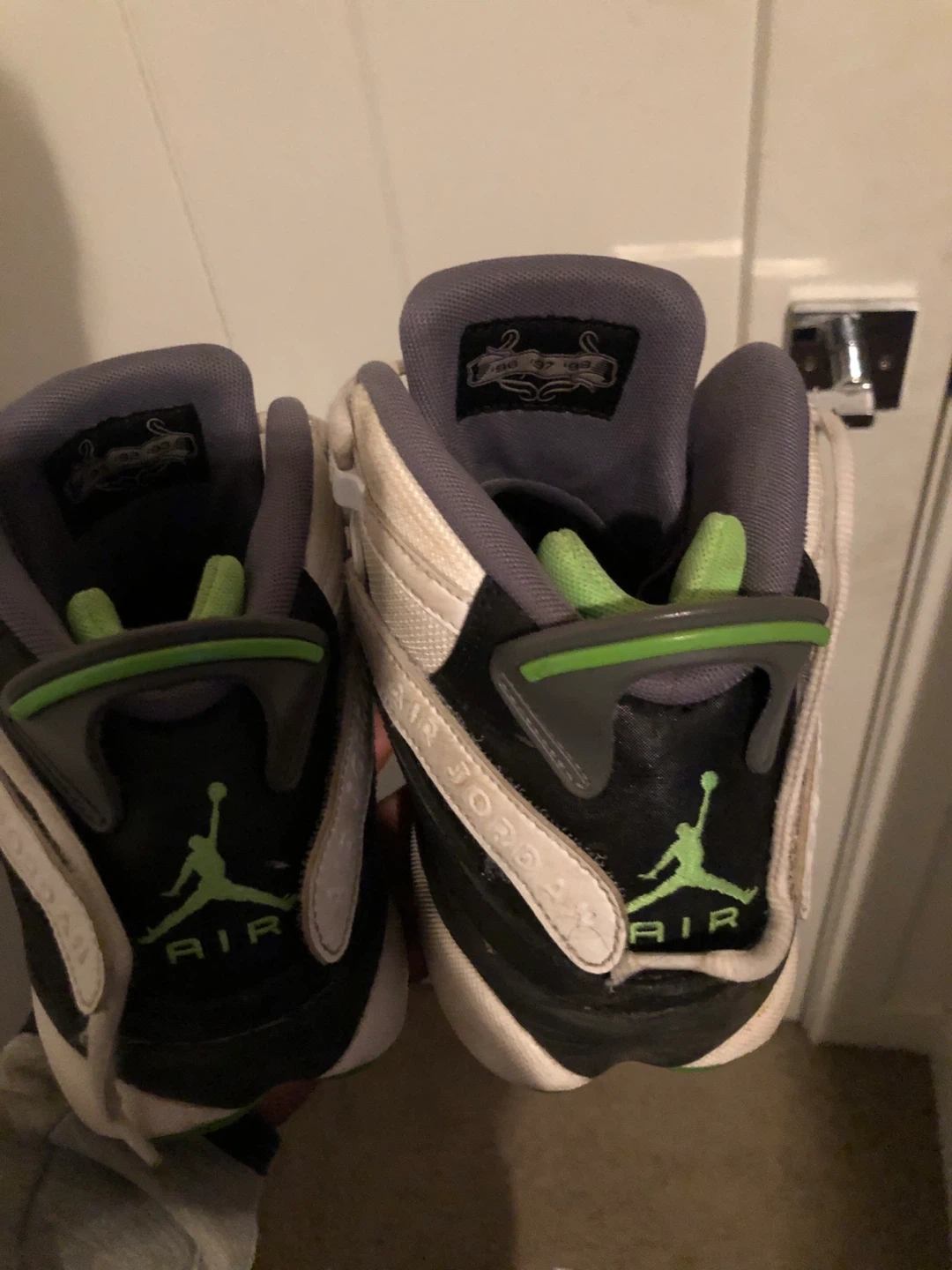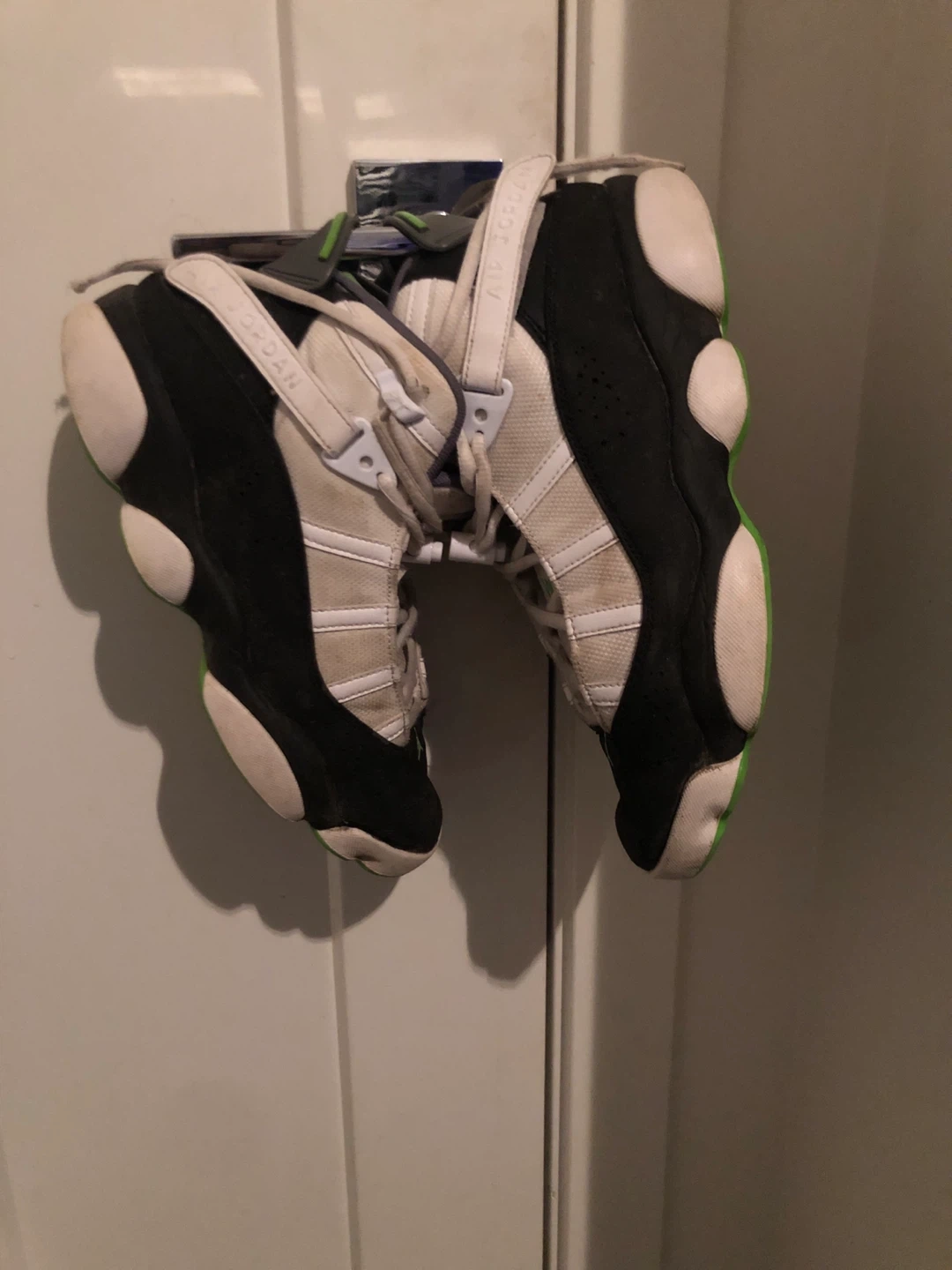 Selling a pair of Air Jordan 6 Rings sneakers. They are in used condition, as you can see from the photos. Still lots of life left in them! Will be attempted to be cleaned before the sale. A little dirty. As you can see in the picture. White, Green, Black, And Gray Colorway. Open to deals and Negotiation. Very comfortable and nice pair of shoes If you break into them…… And they are insanely cheap for how much they usually go for! I Highly would recommend this pair.