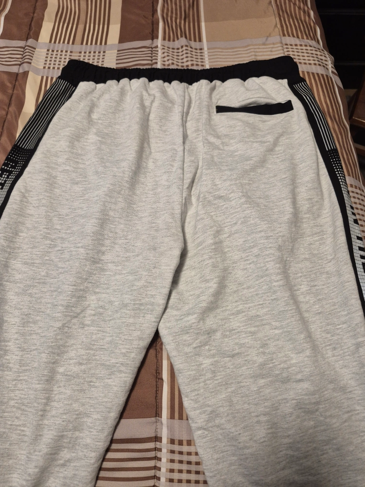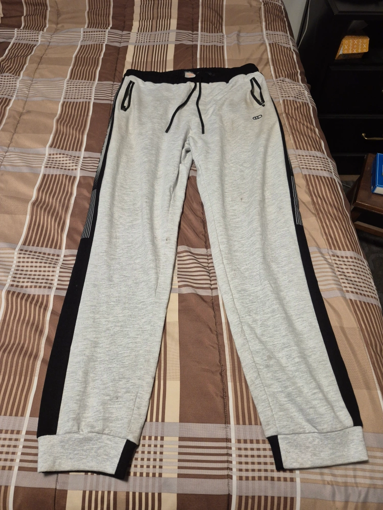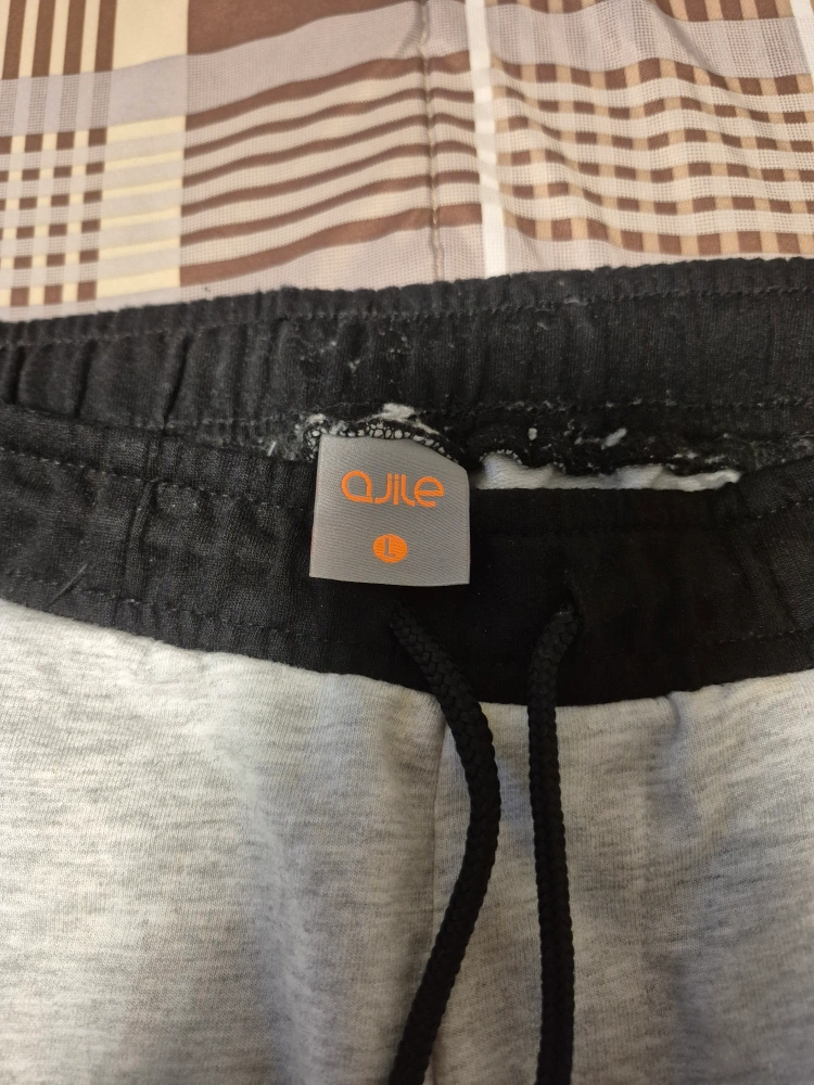 Selling a pair of AJILE joggers in size large. They're grey with black accents and have a drawstring waist. 2 zippered front pockets, 1 back pocket. Great for lounging or hitting the gym!