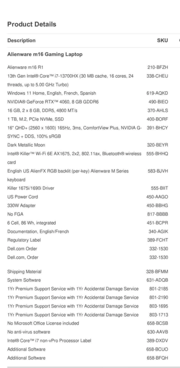 Selling my Alienware m16 R1 gaming laptop in excellent condition! Key specs: - 13th Gen Intel Core i7-13700HX - NVIDIA GeForce RTX 4060 - 16 GB DDR5 4800 MT/s - 1 TB M.2 PCIe NVMe SSD - 16" QHD+ (2560 x 1600) 165Hz display It also comes with a Killer Wi-Fi 6E AX1675, AlienFX RGB backlit keyboard, and a 330W adapter. Includes original box and documentation!