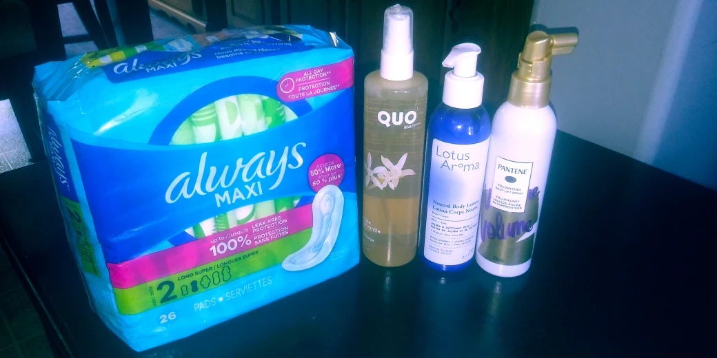 Selling a pack of Always Maxi pads, long super size, with 26 pads included. Also included are Quo Beauty product, Lotus Aroma Neutral Body Lotion, and Pantene Volumizing Root Lift Spray