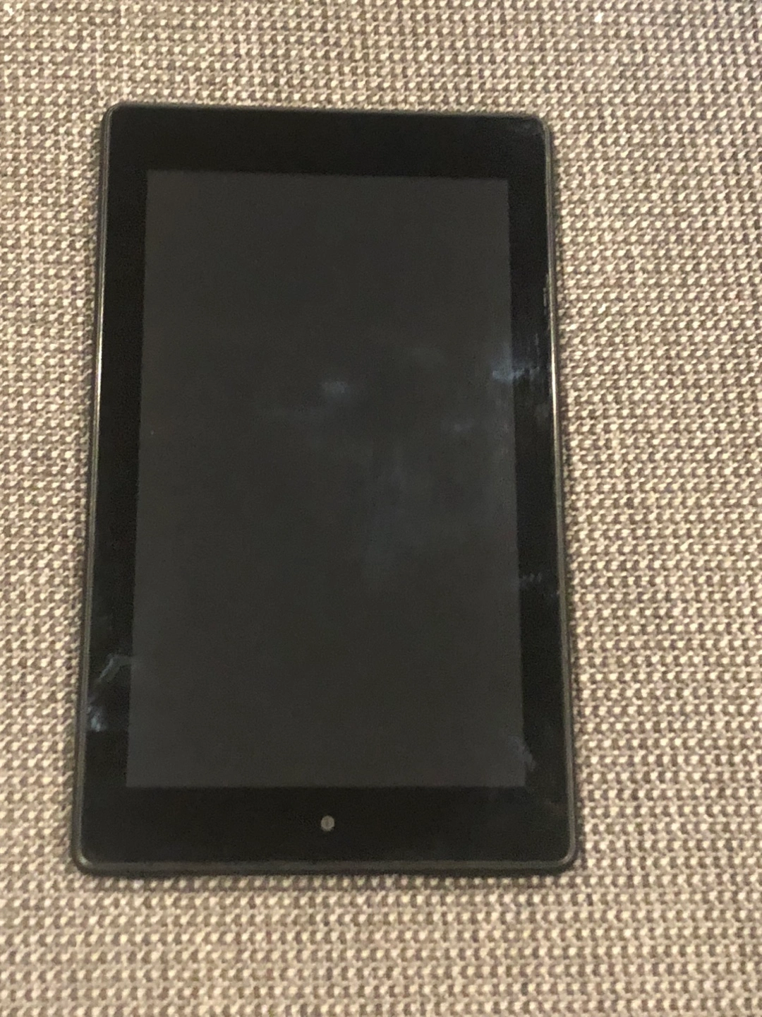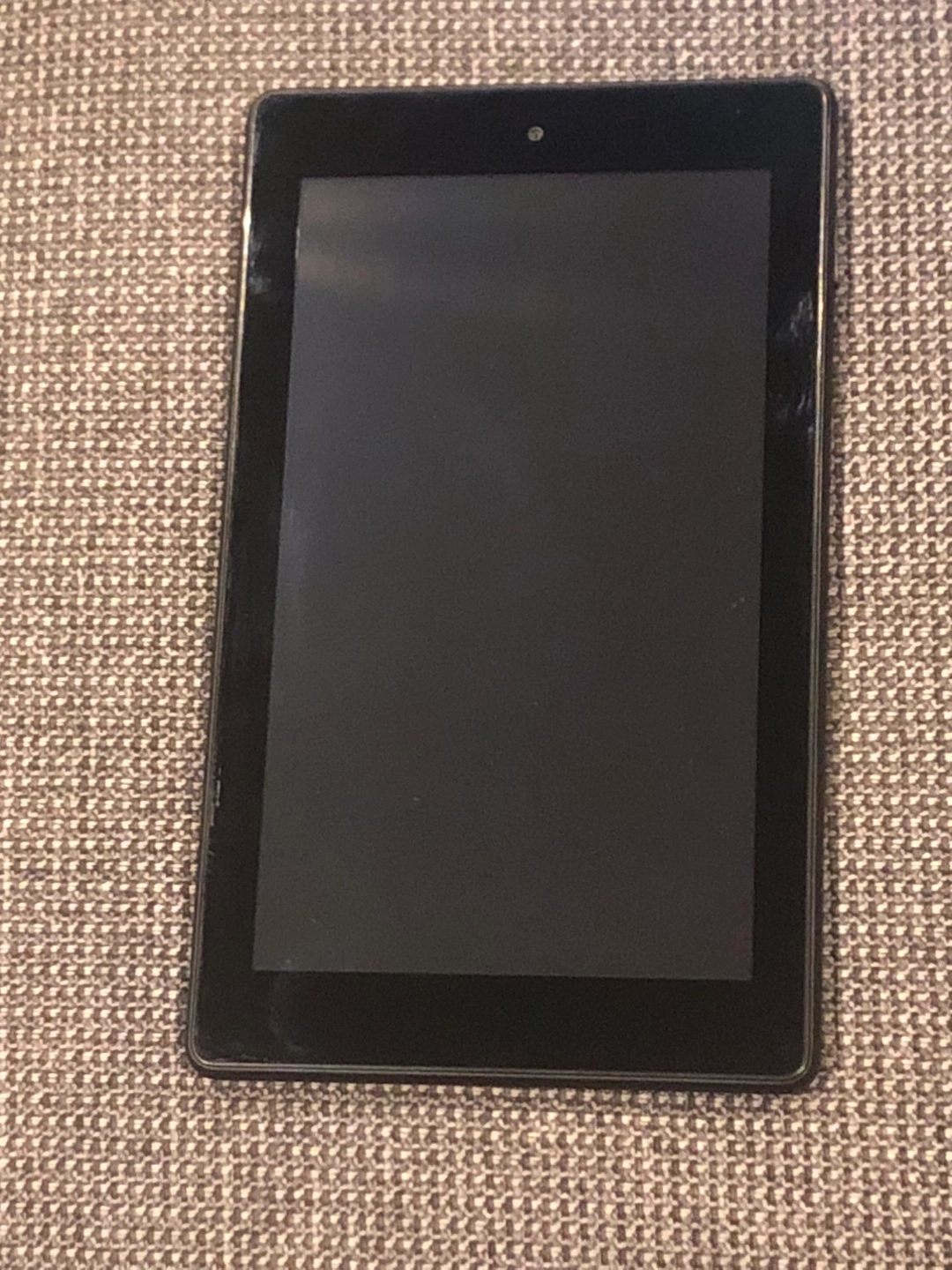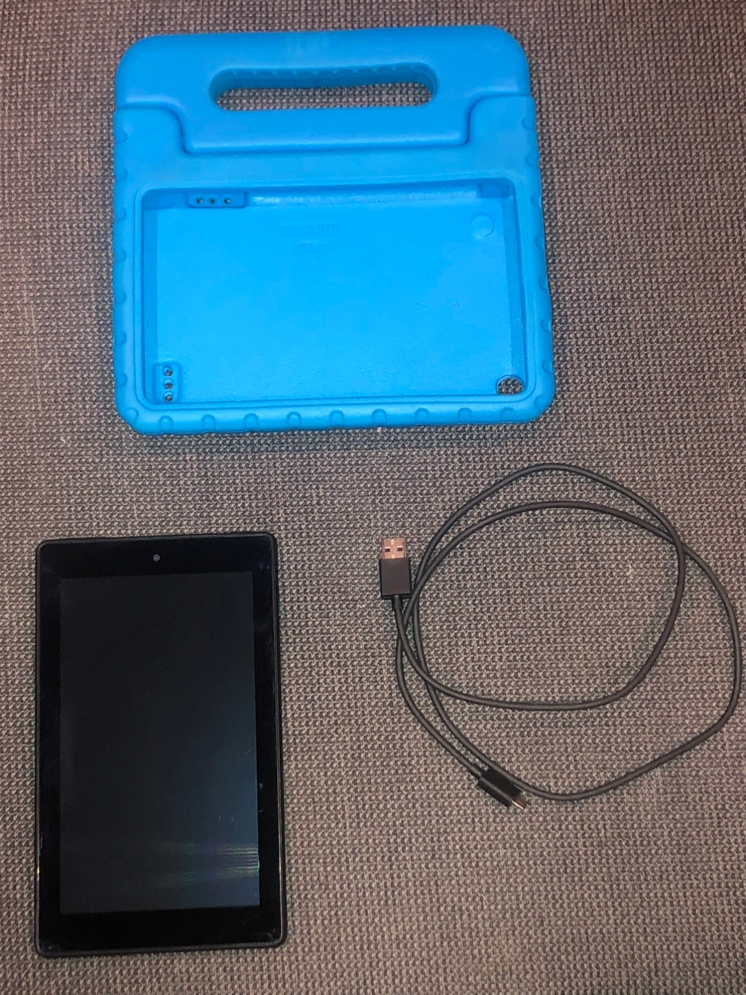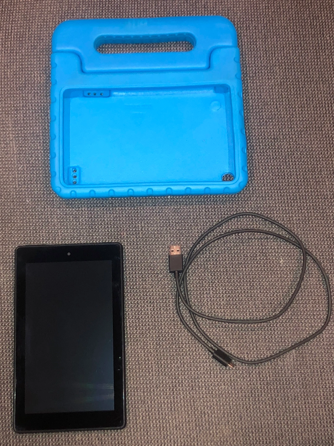 Selling an Amazon Fire 7 tablet. It comes with a blue protective case and a charging cable. This tablet is great for reading, browsing, and watching videos. It's lightweight and portable, perfect for on-the-go entertainment