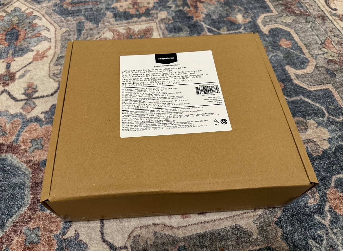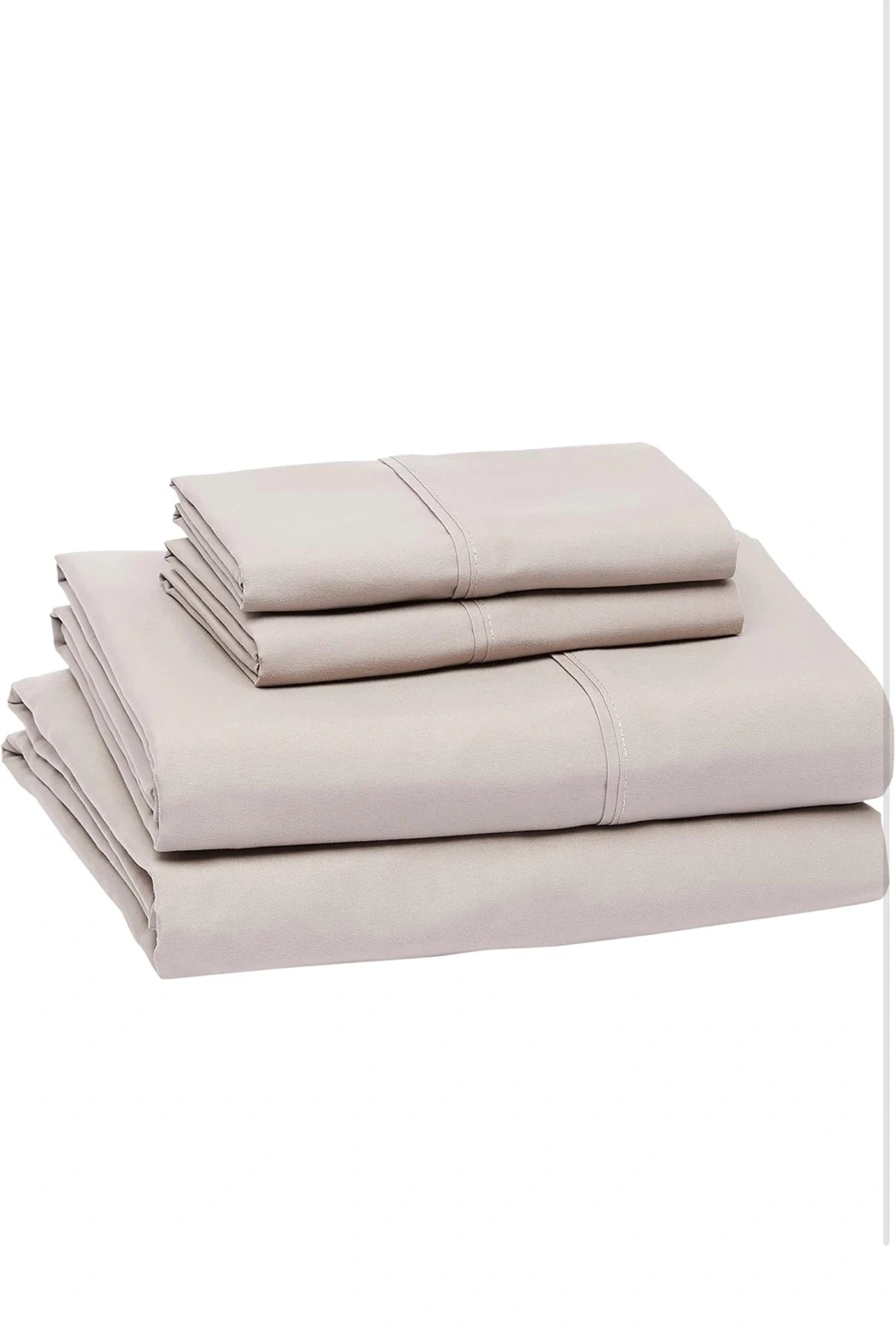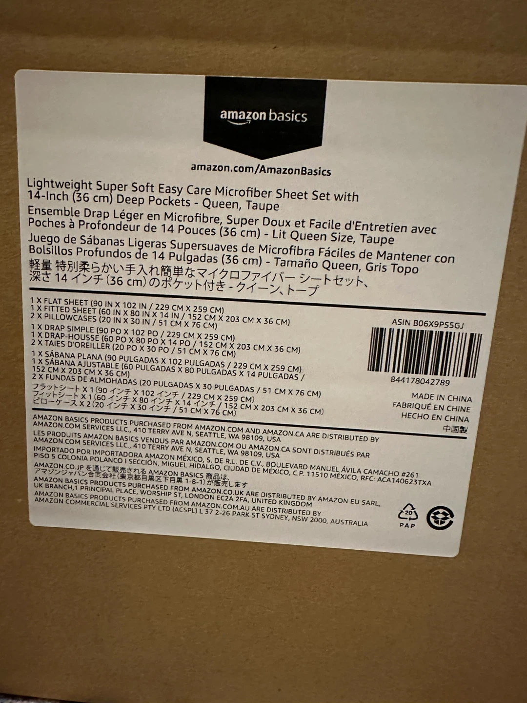 Brand new in original packaging Get a super soft and easy care microfiber sheet set from AmazonBasics! This set includes: - 1 flat sheet (90 in x 102 in / 229 cm x 259 cm) - 1 fitted sheet (60 in x 80 in x 14 in / 152 cm x 203 cm x 36 cm) - 2 pillowcases (20 in x 30 in / 51 cm x 76 cm) It's a lightweight and durable queen-sized set in a neutral taupe colour. Comes in the original box!