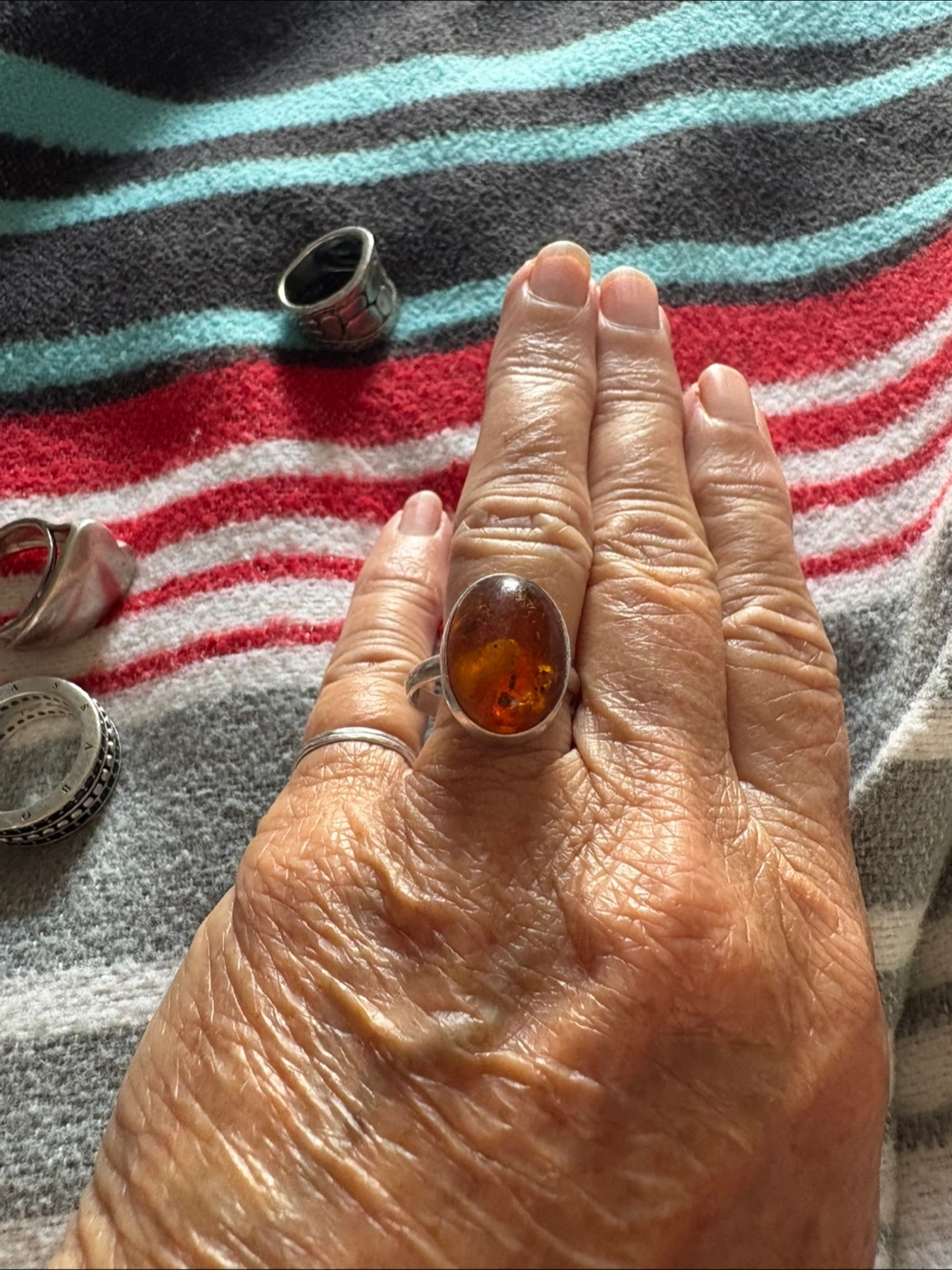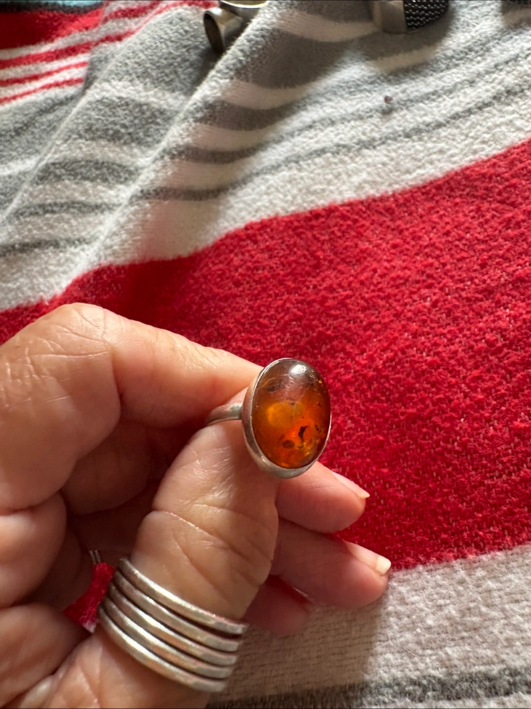 Selling a beautiful amber stone ring! It appears to be a size 8. The band is silver. It's in great condition and ready for a new home