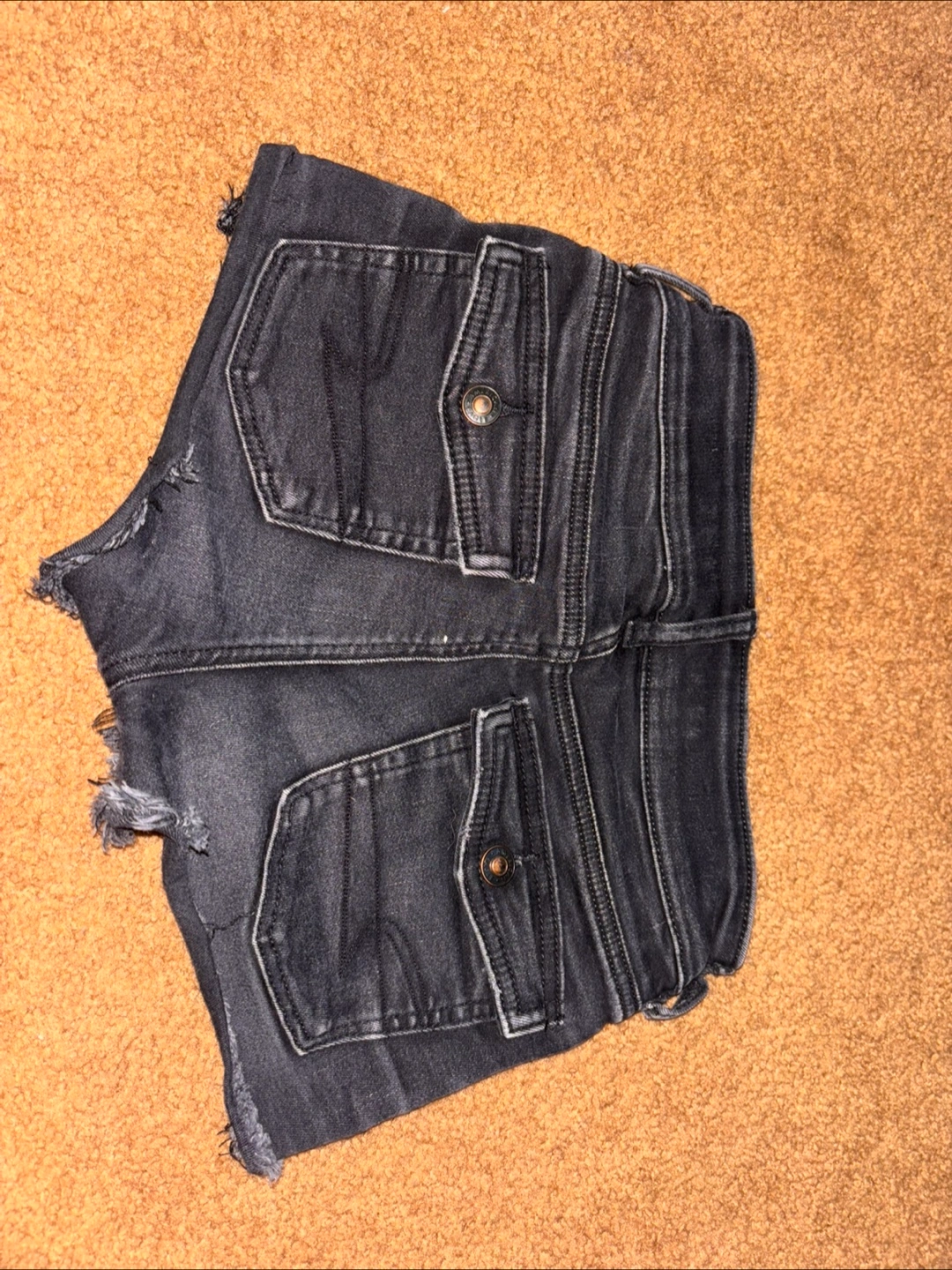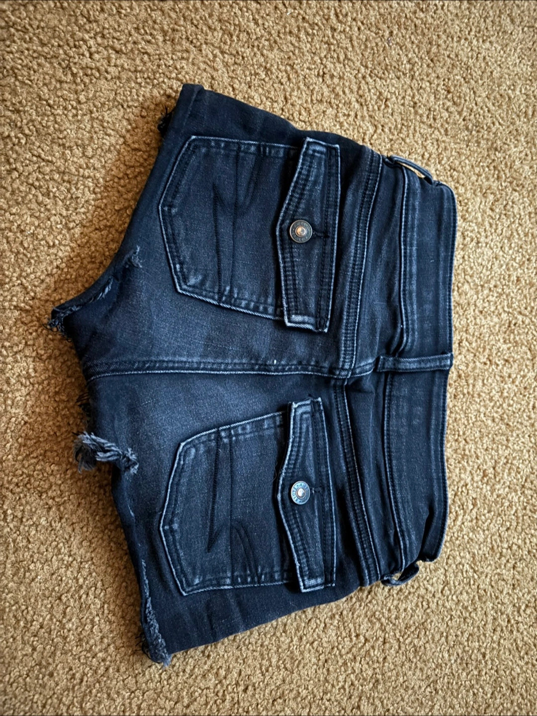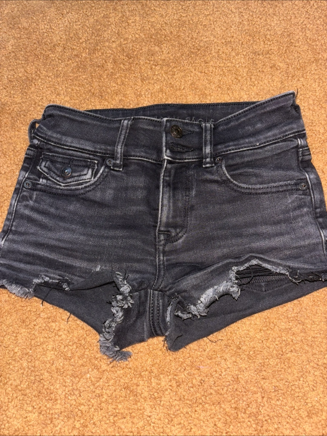 These are a pair of American Eagle black denim shorts in size 0. They feature a distressed, frayed hem and a classic five-pocket design. Perfect for a casual, edgy look!