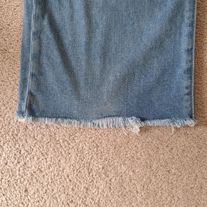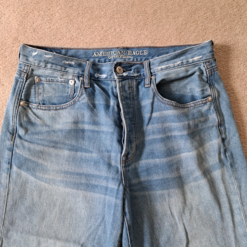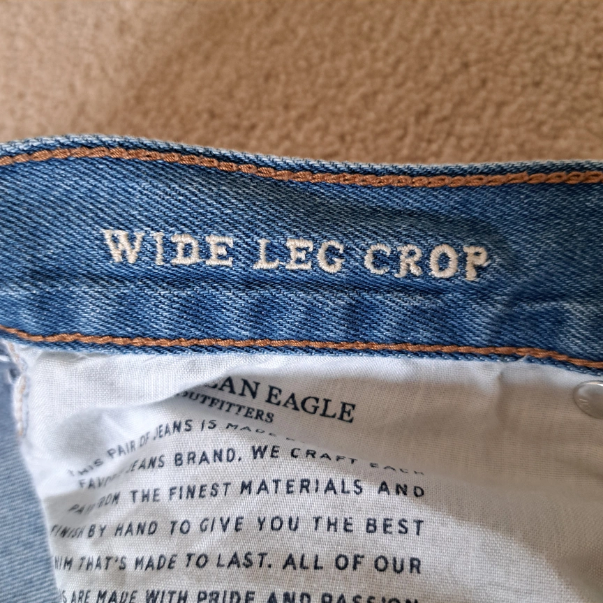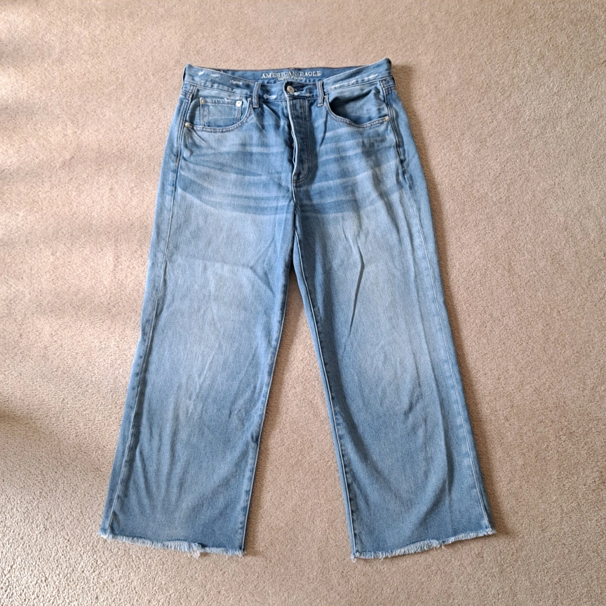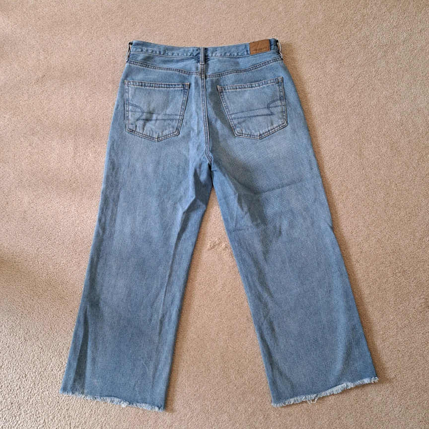 Excellent condition American Eagle Outfitters jeans Wide leg crop Light wash button fly closure 5 pocket style Frayed, raw hem Size: 8 Colour: blue Approximate measurements laid flat: Waist across: 16" Inseam: 24"