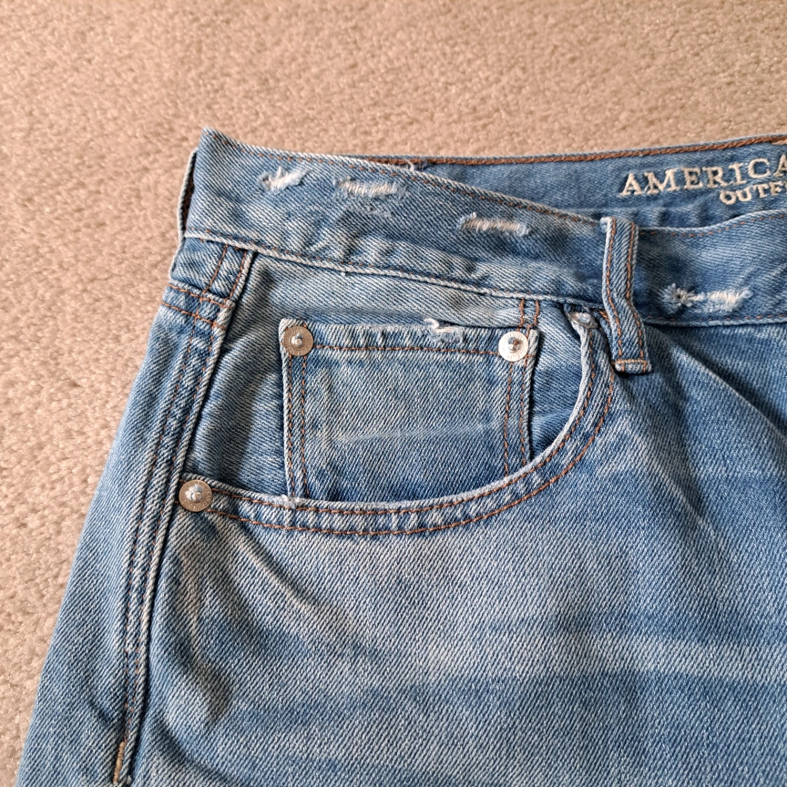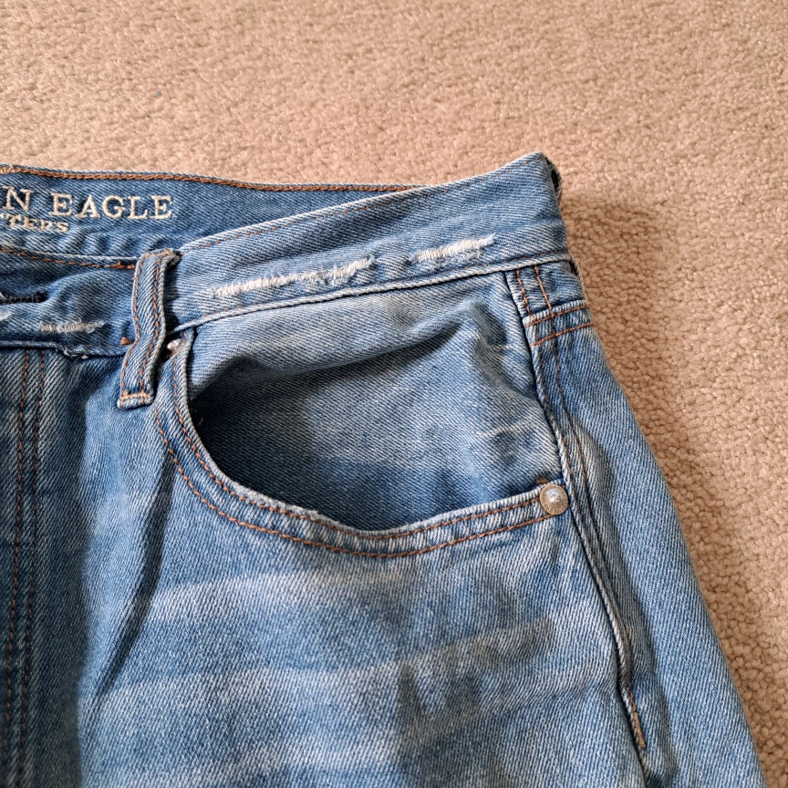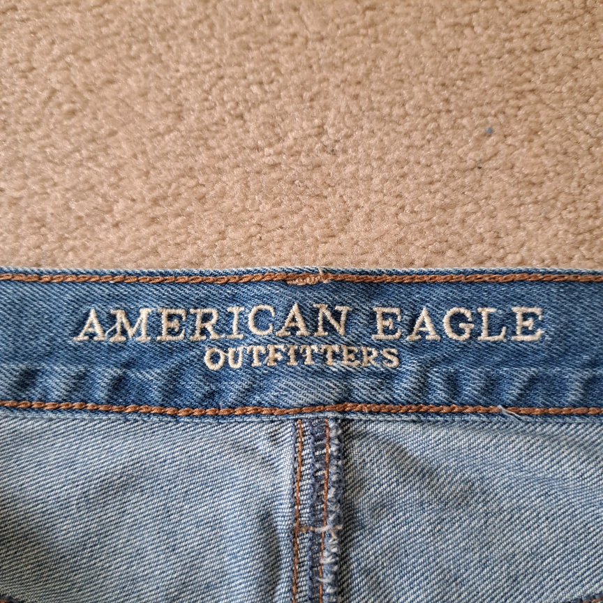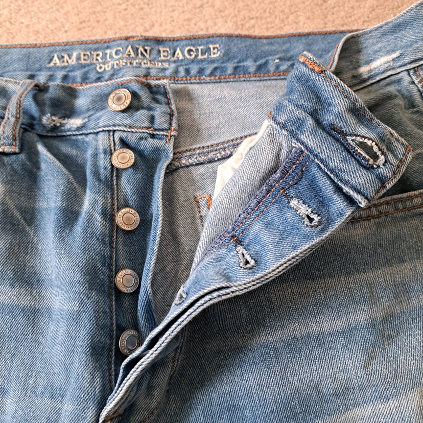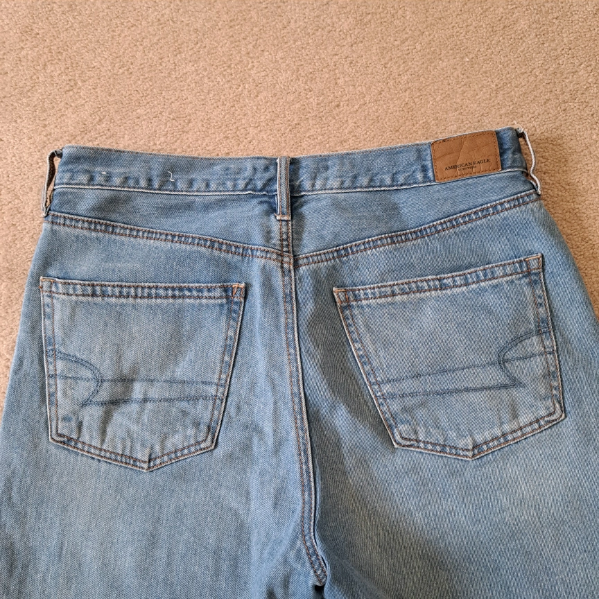 Excellent condition American Eagle Outfitters jeans Wide leg crop Light wash button fly closure 5 pocket style Frayed, raw hem Size: 8 Colour: blue Approximate measurements laid flat: Waist across: 16" Inseam: 24"