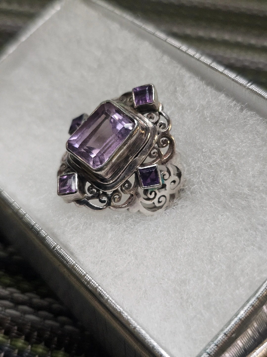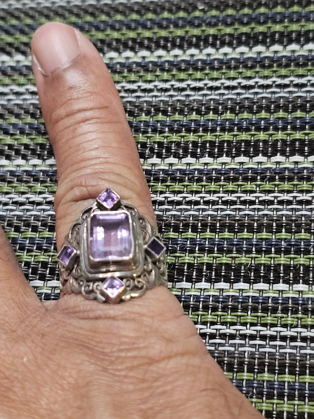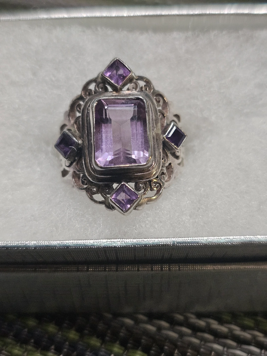 This is a beautiful amethyst ring set in sterling silver. It features a large, rectangular amethyst stone in the center, surrounded by smaller square amethyst stones. The ring has an ornate, filigree design. It's a lovely piece to add to your jewelry collection!