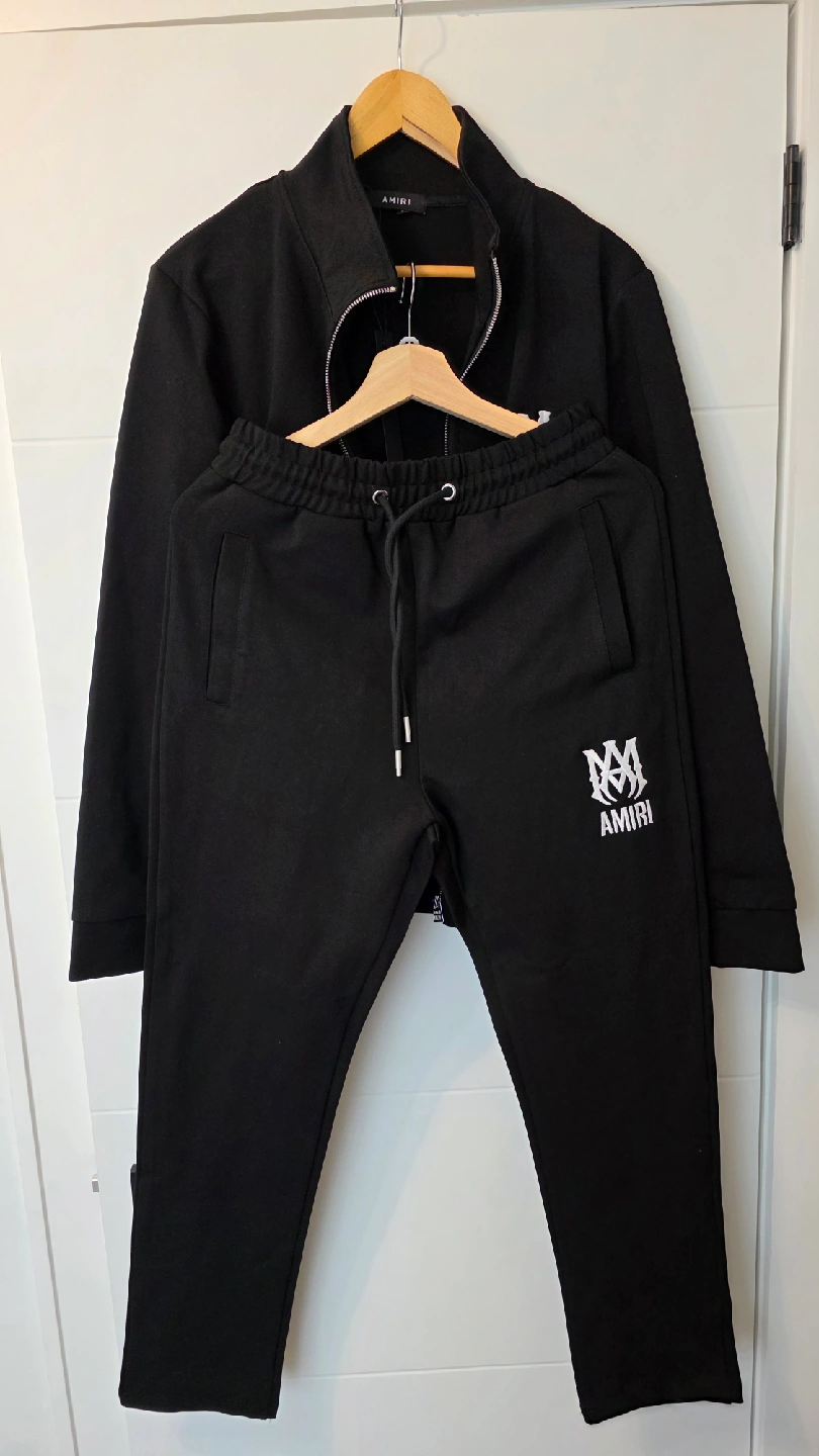 I am offering a AMIRI tracksuit set in black for sale. The set includes one hoodie in size XL and one without a hoodie in size L, both bearing the AMIRI logo. Each piece is priced at $150.