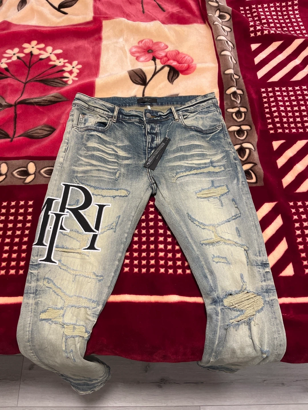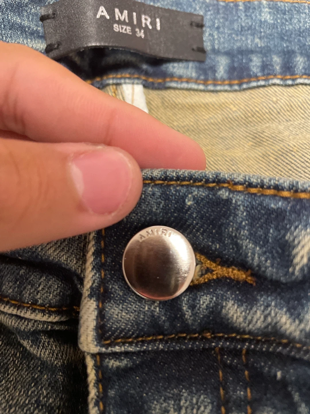 Selling a pair of AMIRI distressed jeans in size 34. The jeans are made of 98% cotton and 2% elastane. They have a unique, stylish look with the distressed detailing. Made in the USA with materials from Italy!