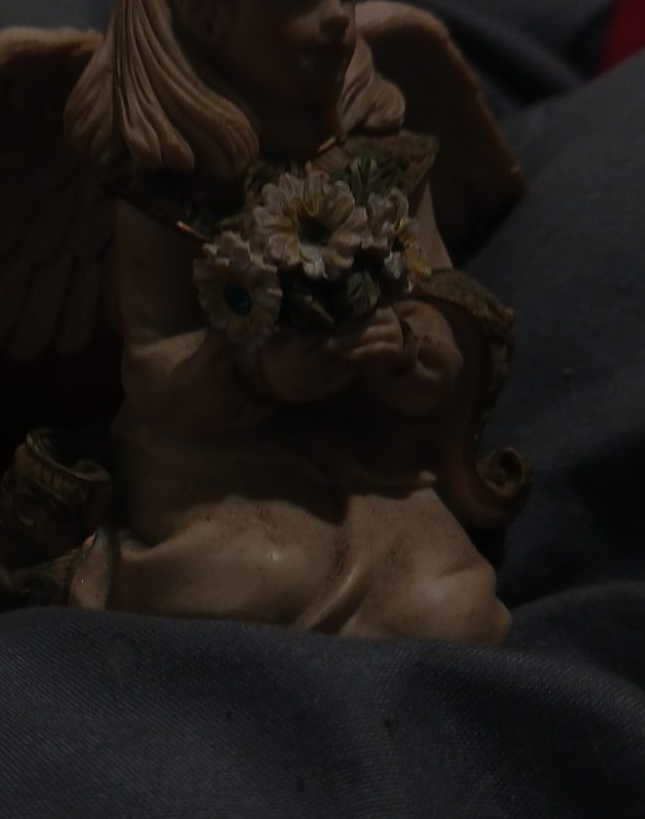 A charming angel figurine holding a bouquet of flowers. It's a lovely piece for adding a touch of serenity to any room
