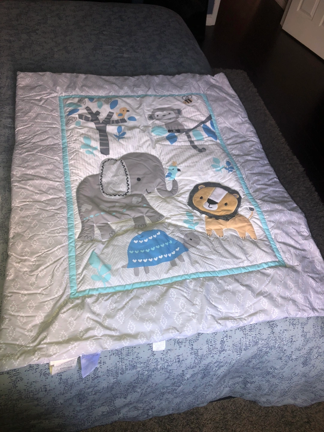 A cute baby blanket with an animal print design featuring an elephant, lion, and monkey. Perfect for keeping your little one cozy and warm!