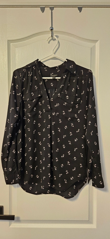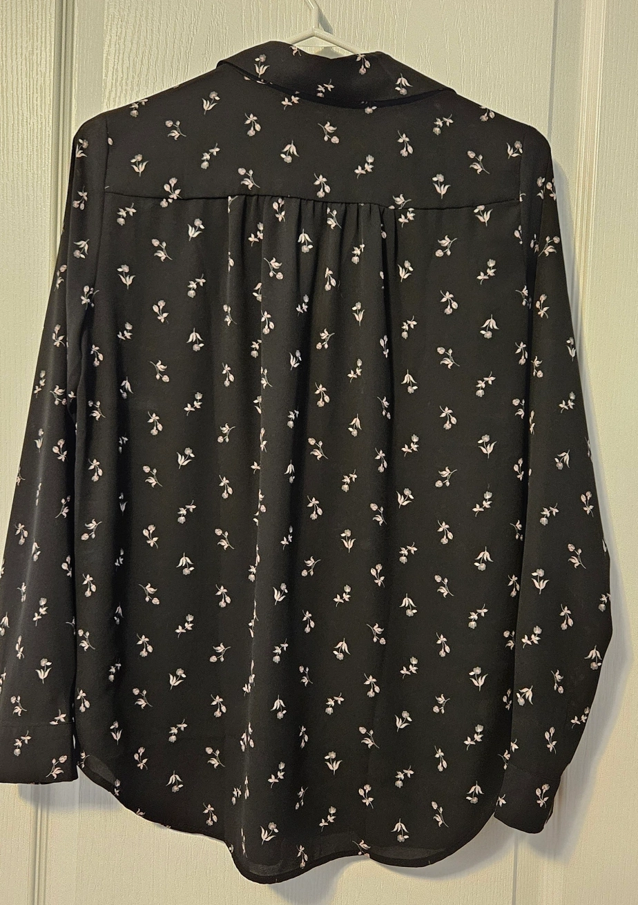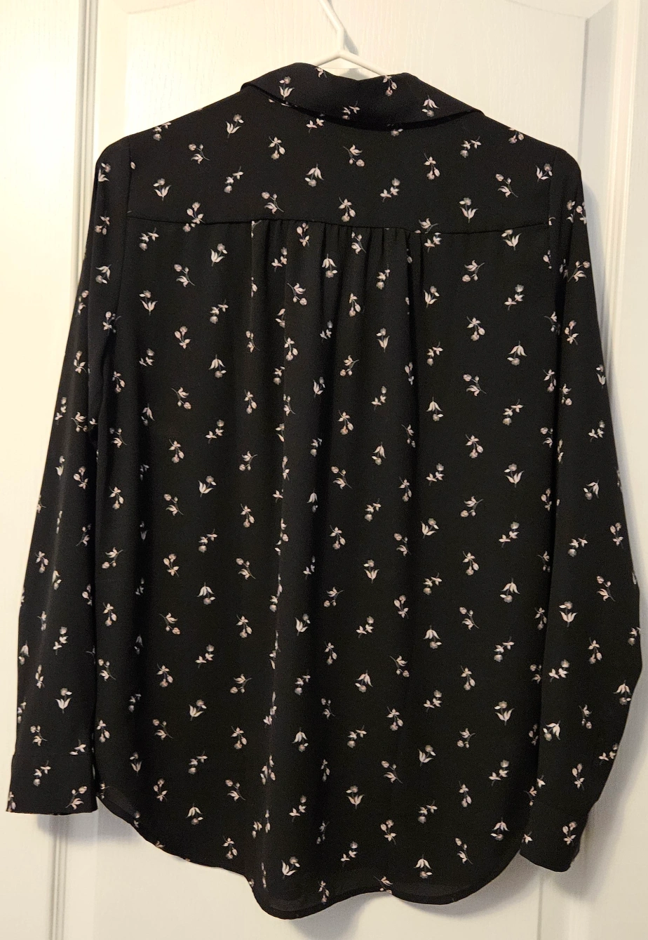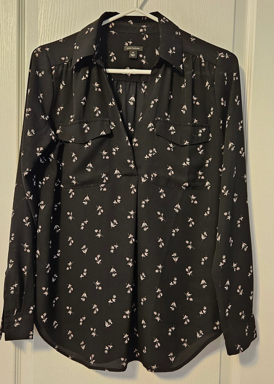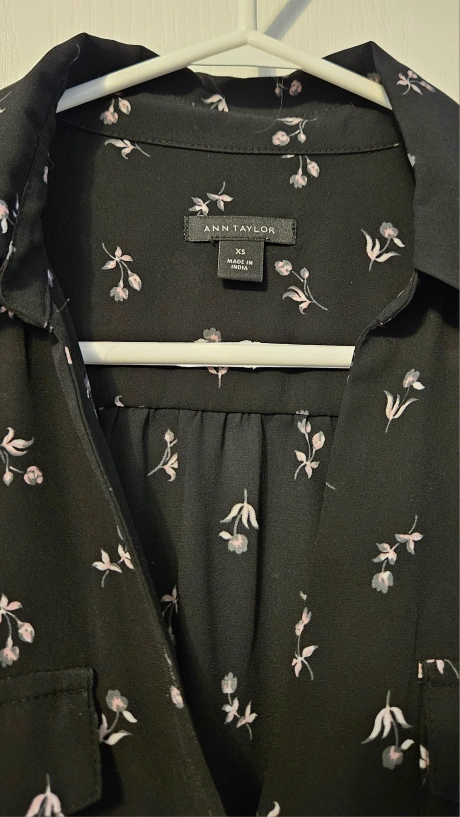 Here's a cute Ann Taylor blouse in size XS! It features a black background with a delicate floral pattern. This one button shirt has two front pockets and a comfortable fit. Perfect for adding a touch of elegance to your wardrobe!