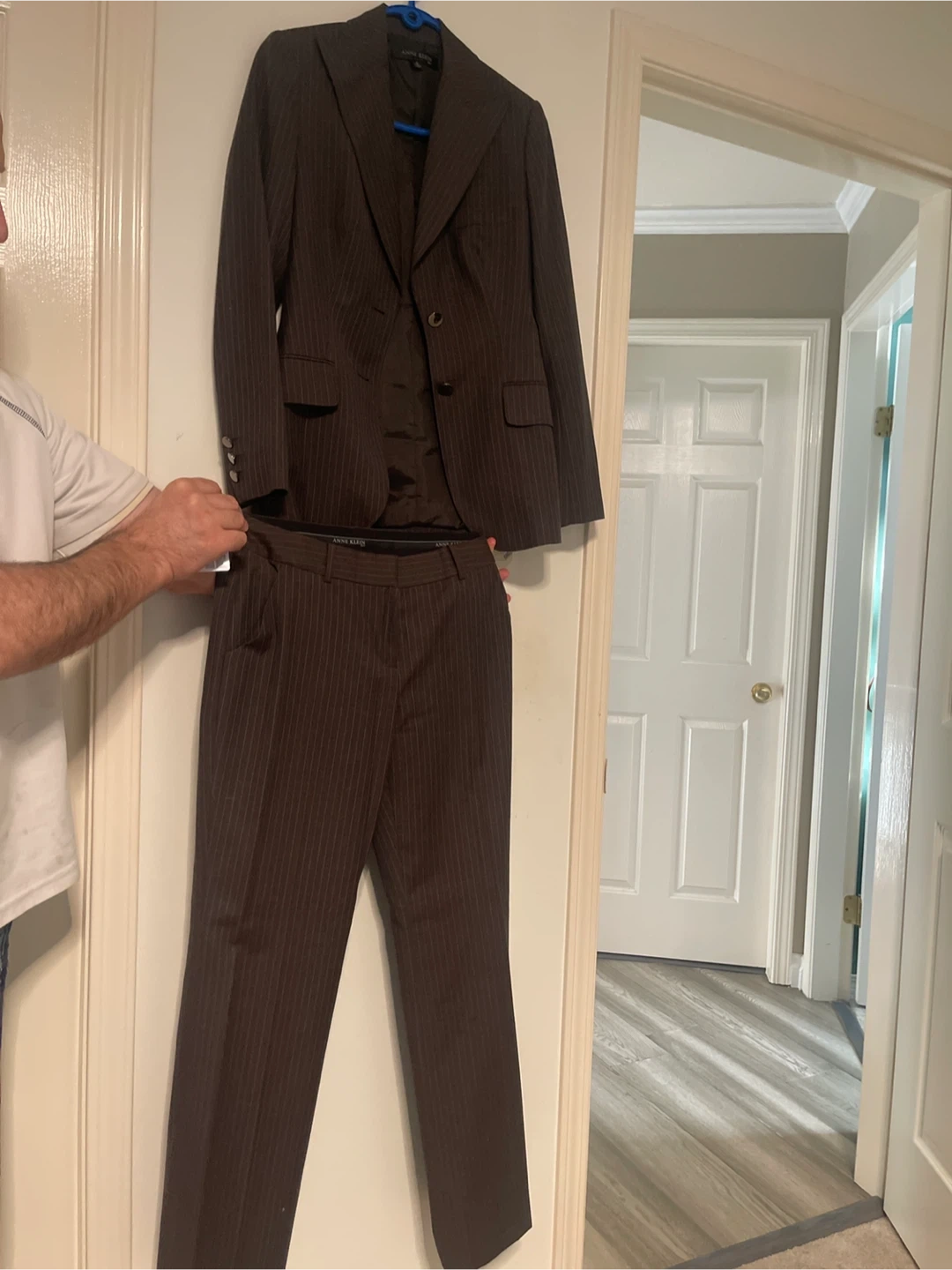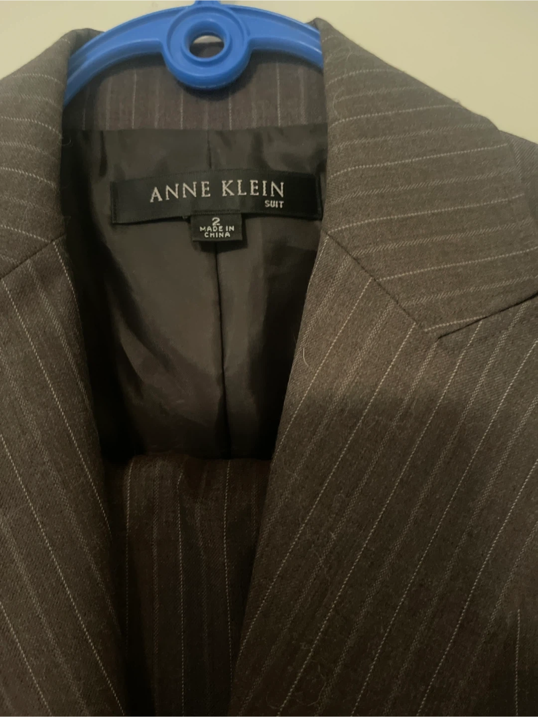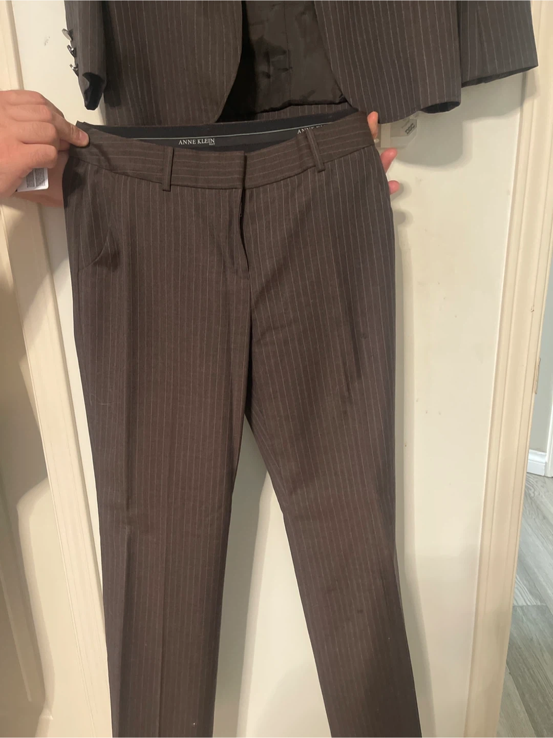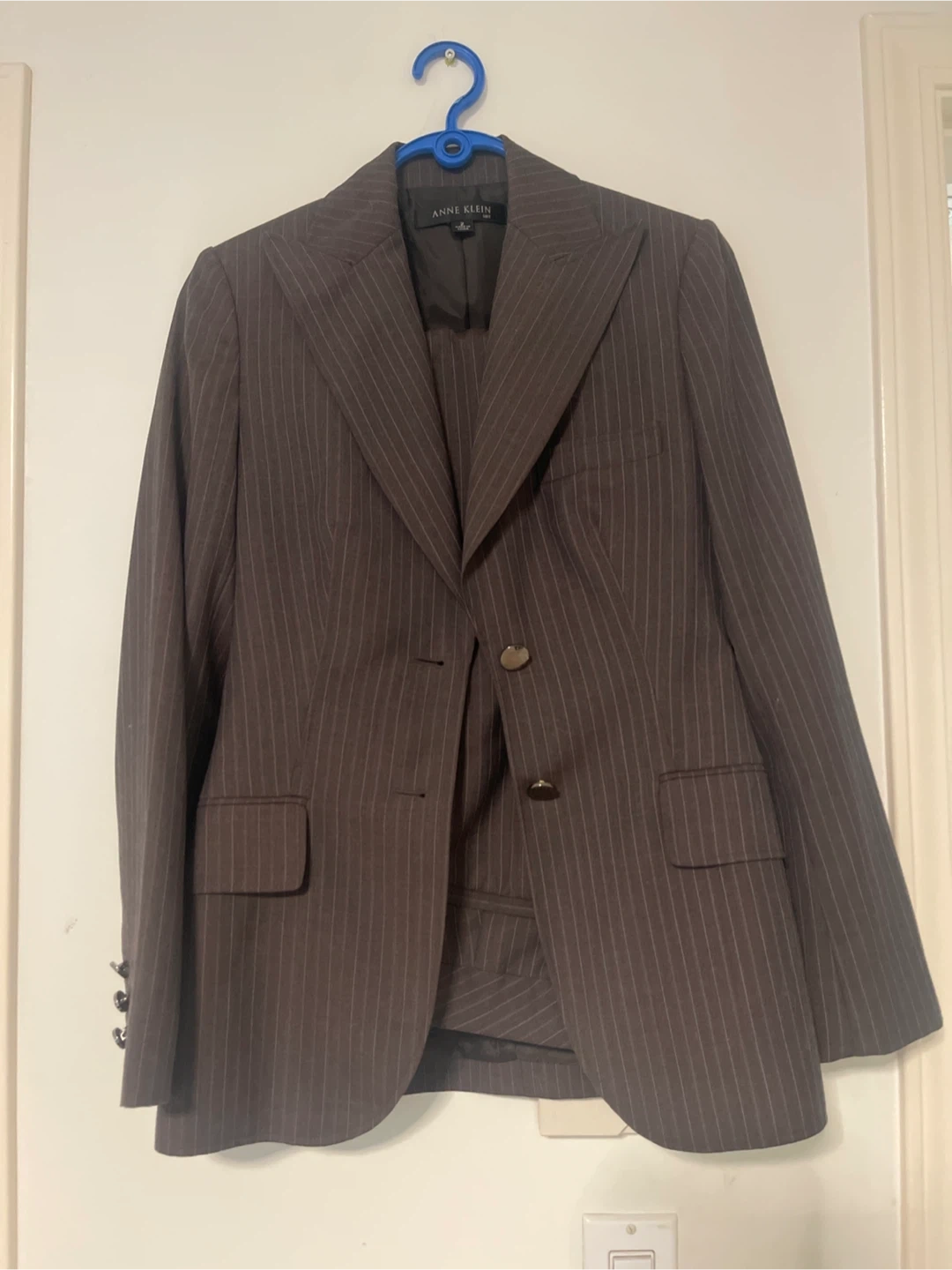Selling a stylish Anne Klein suit in a brown pinstripe pattern. The suit is a size 2 and includes both the jacket and pants. Perfect for a professional look! Very lightly used, like new