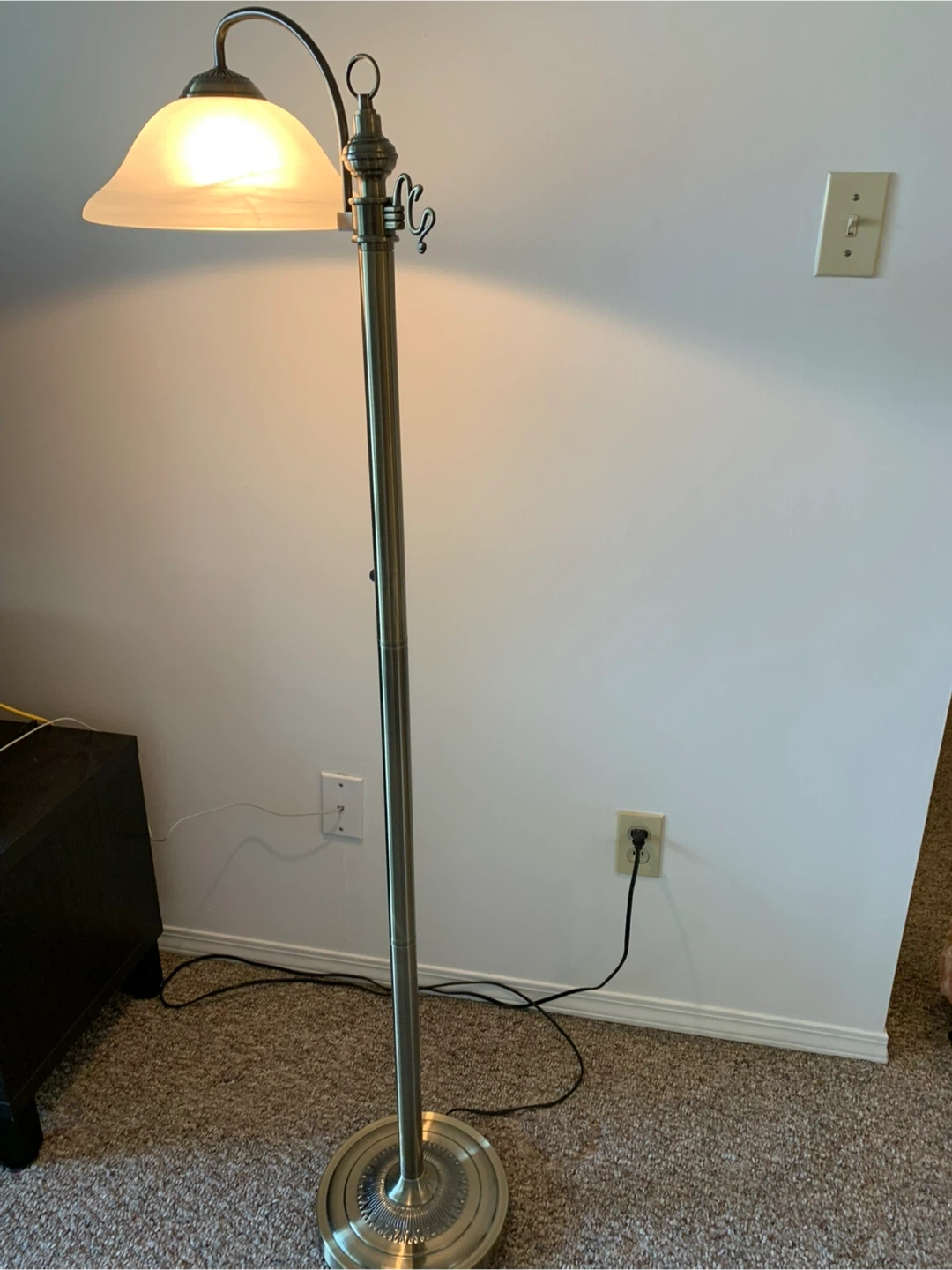 Beautiful antique brass floor lamp with frosted marble-like glass shade. In very good condition, no scratches or cracks on the glass. Lamp will accept incandescent or LED bulbs. 56 inches tall, shade is 9 inches in diameter.