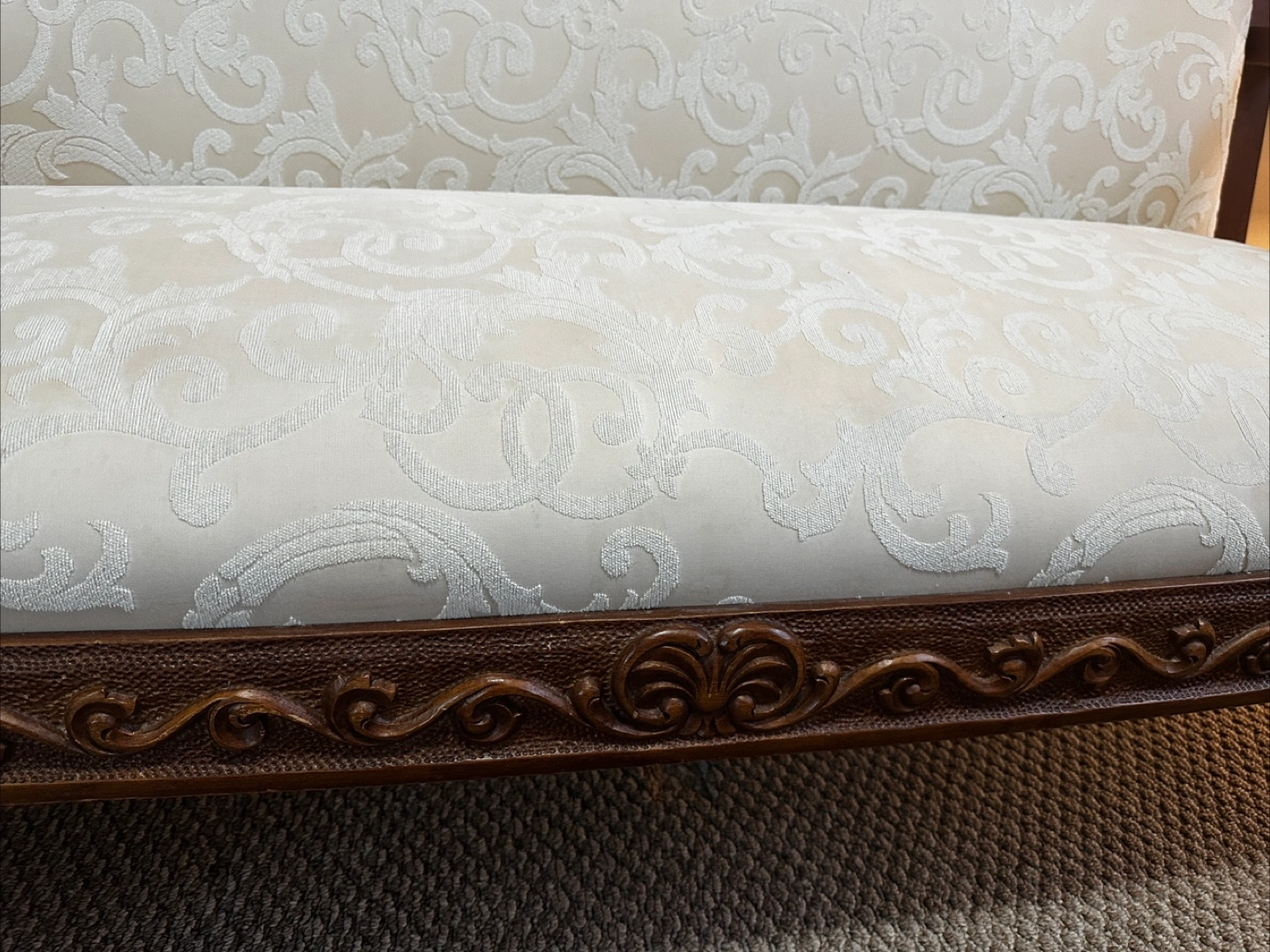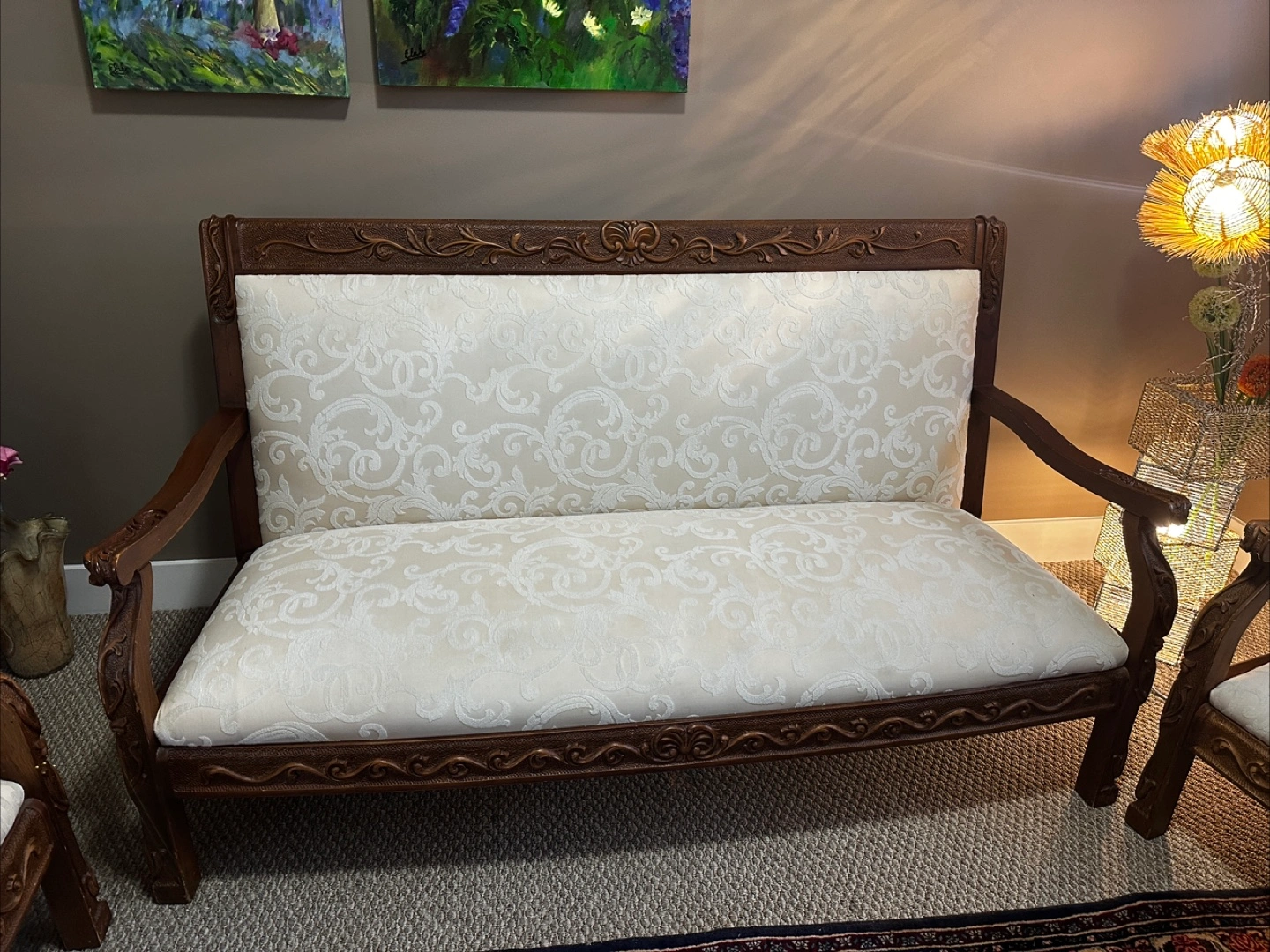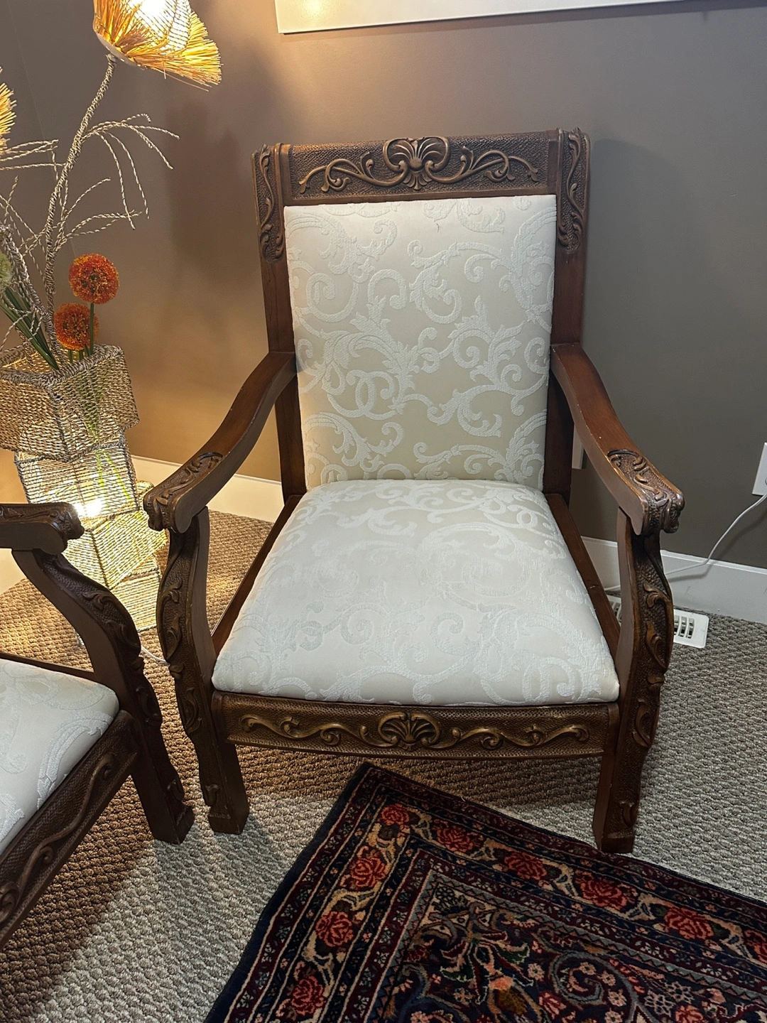 Beautiful antique chair and loveseat set featuring carved wood frames and cream-colored patterned upholstery. These pieces would add a touch of elegance to any room!