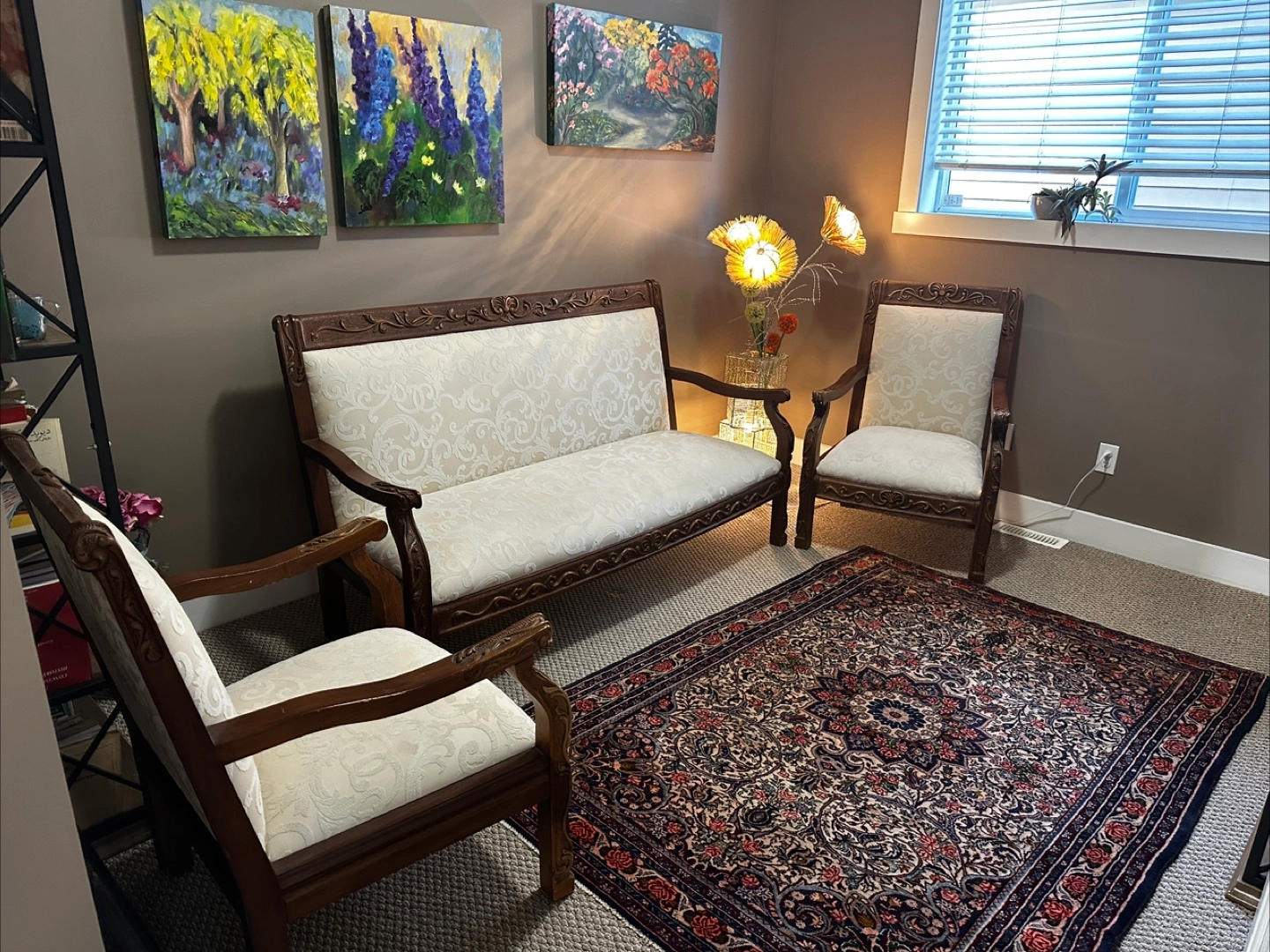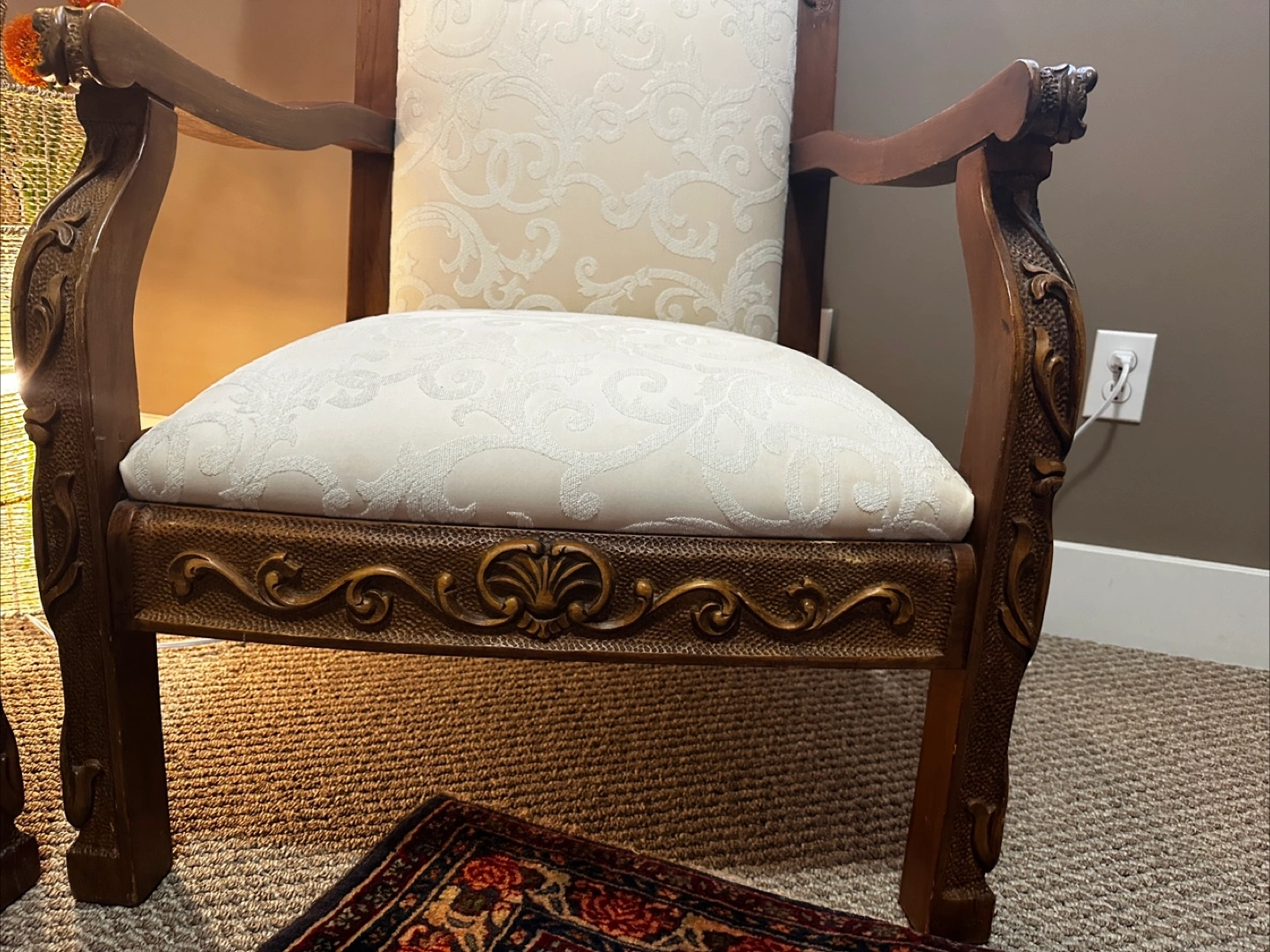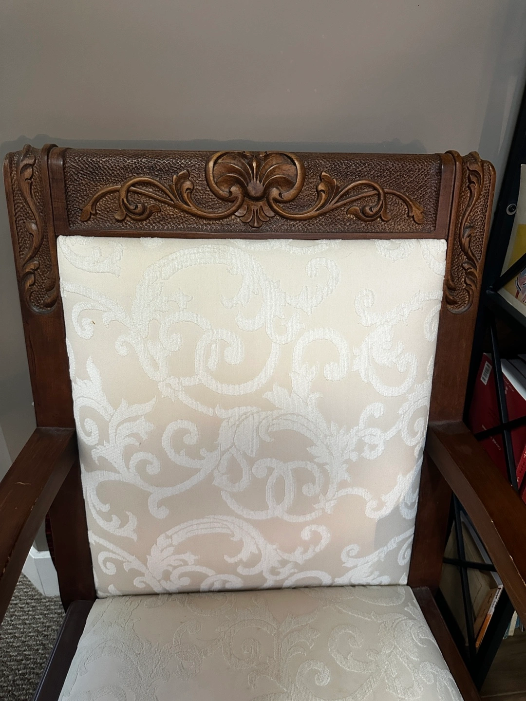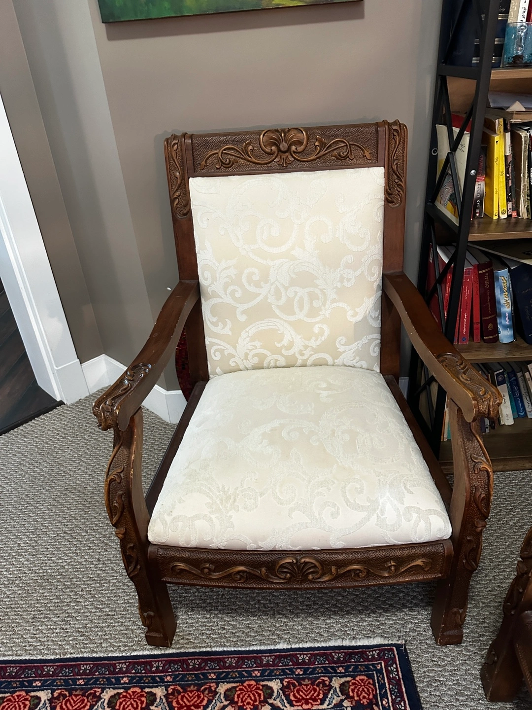 Beautiful antique chair and loveseat set featuring carved wood frames and cream-colored patterned upholstery. These pieces would add a touch of elegance to any room!