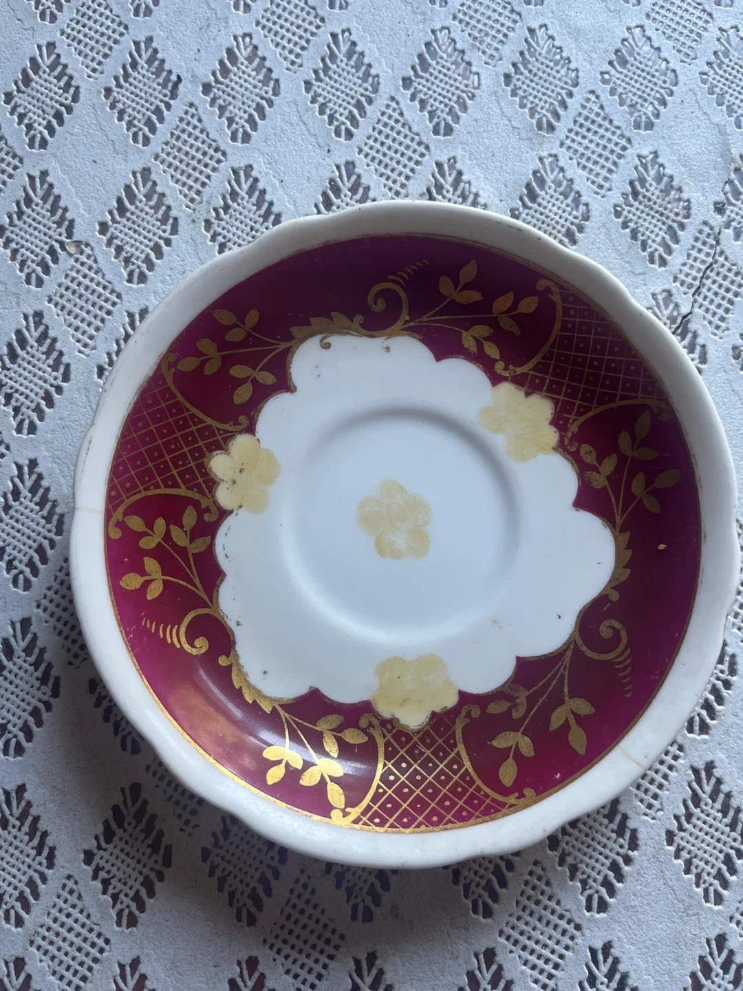 Selling an antique Grosvenor China saucer. It's a lovely piece made in England with a beautiful floral design in burgundy and gold. It shows some signs of wear consistent with its age, but it's still a charming addition to any collection