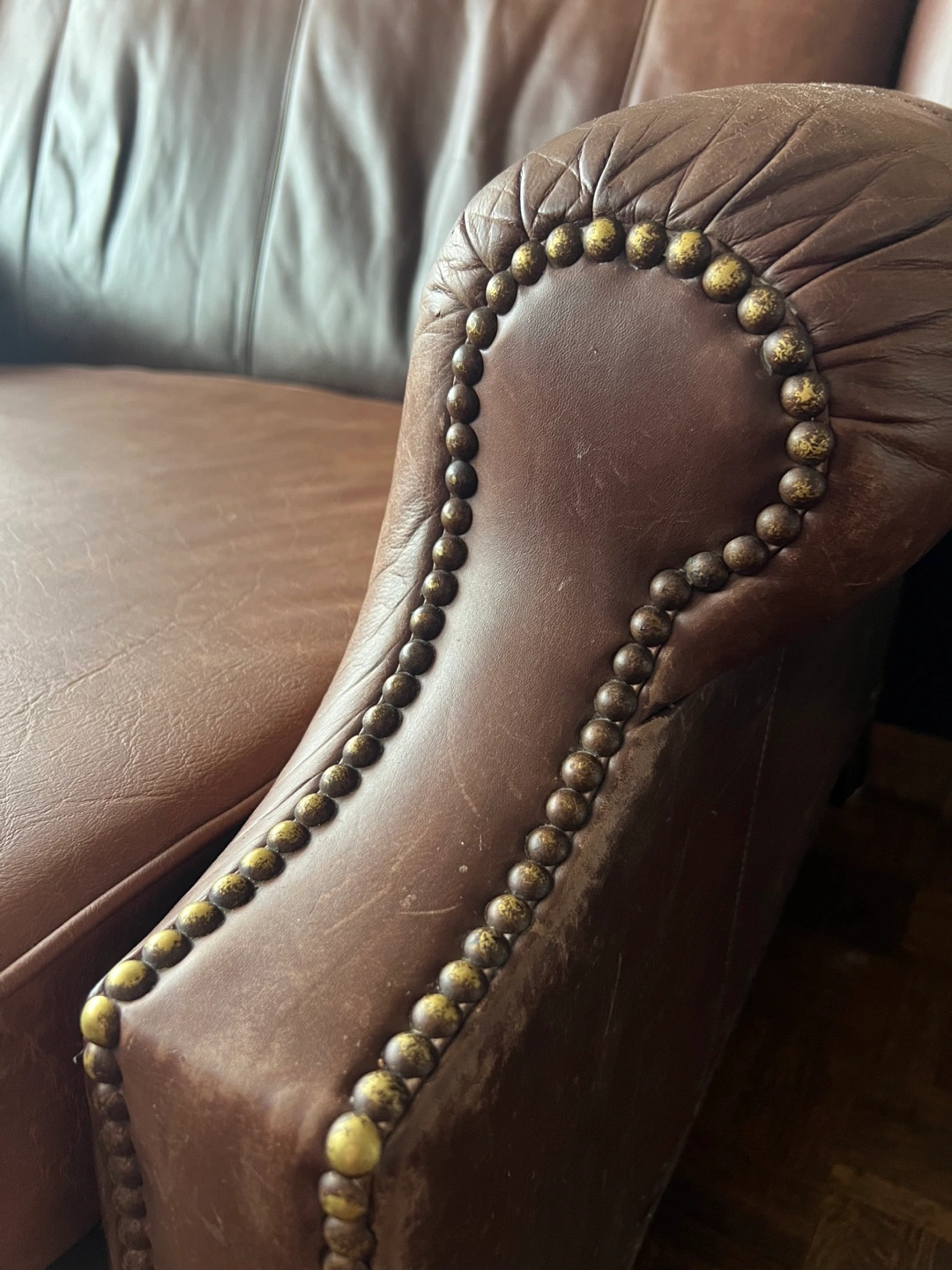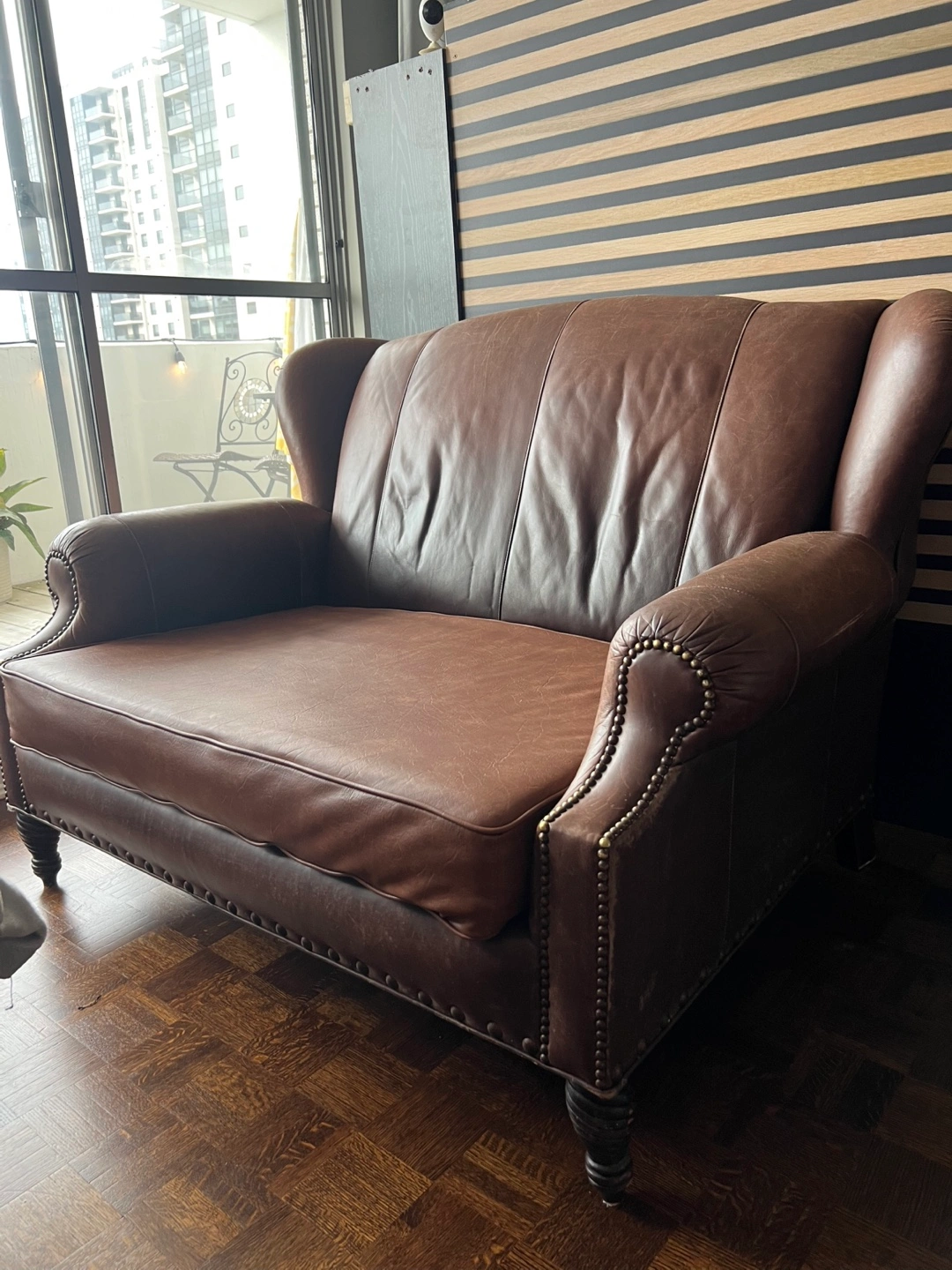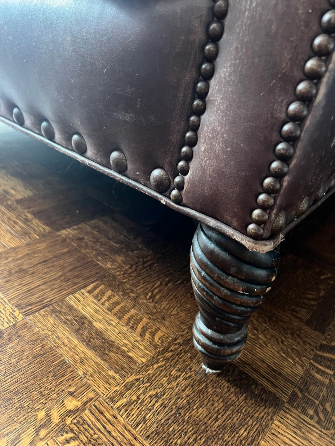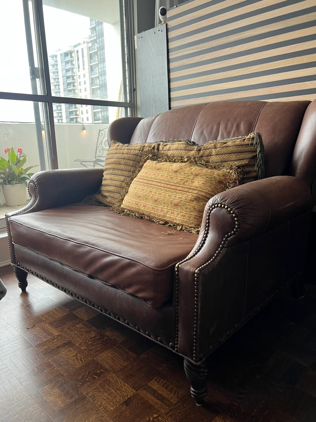 Selling a gently used brown leather loveseat. It features a classic design with nailhead trim and carved wooden legs. It's a stylish and comfortable piece for any living space!