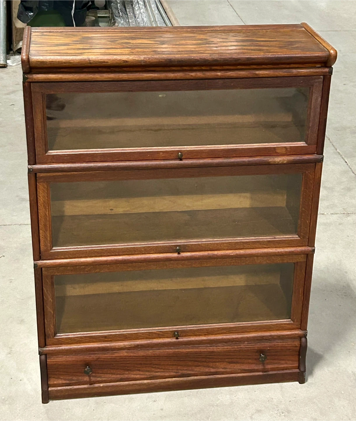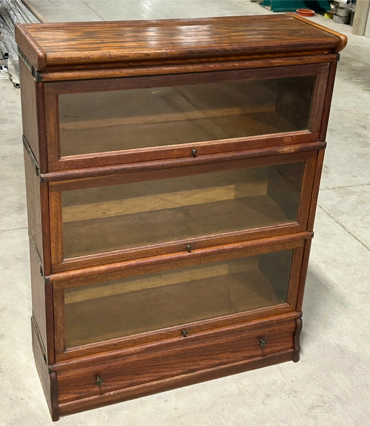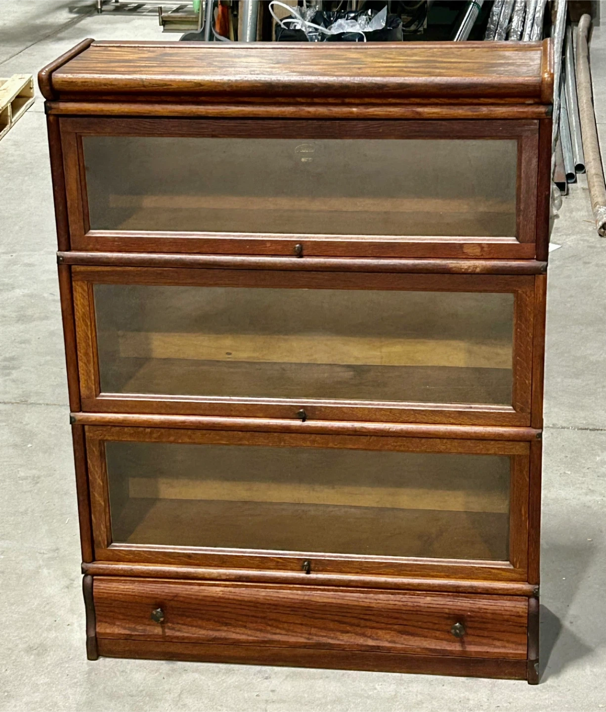 For sale is a lovely three tier “Macey” barrister bookcase (circa 1910). This stacking unit features metal banding accents with a dovetailed drawer at its base, for the storage of papers, placemats, or other items of choice. Display your favourite books or treasures within each tier, protected by sliding glass doors that function without issue. NO breaks, cracks, chips, or repairs to glass. Approximate measurements: 34”W X 12.5”D (at deepest point) X 10”D (inside depth) X 45.25”H. Presented in very good overall condition (with wear consistent with age and use). A beautiful and functional piece that would grace any space and decor! Offered for sale at $750 (or best offer). Serious inquiries only, please. Text interest to 41 six 602 three 803. Ad will be removed once barrister bookcase is sold. Check out my other fine items listed on Karrot!! Thanks for stopping by!