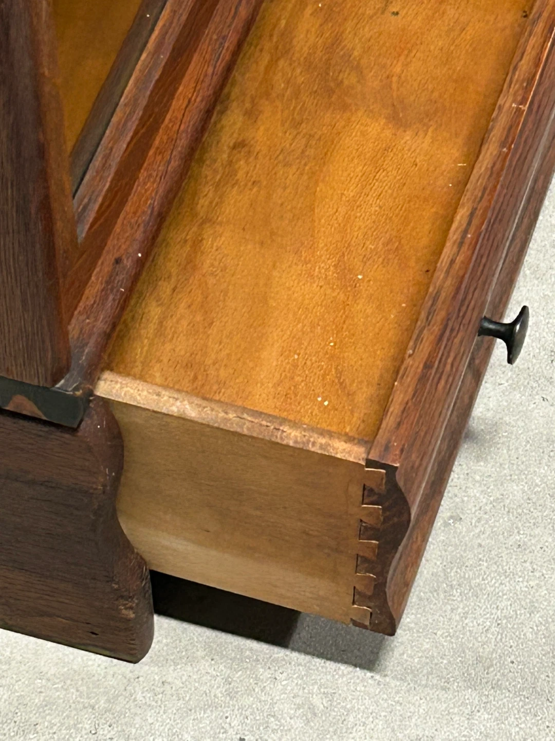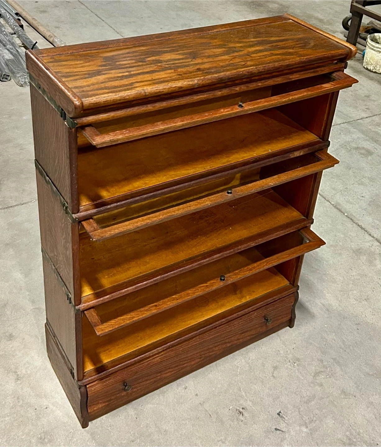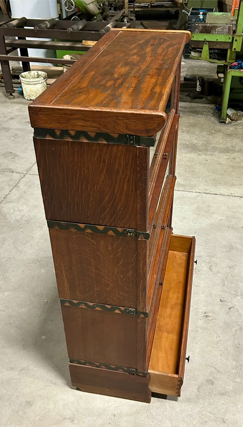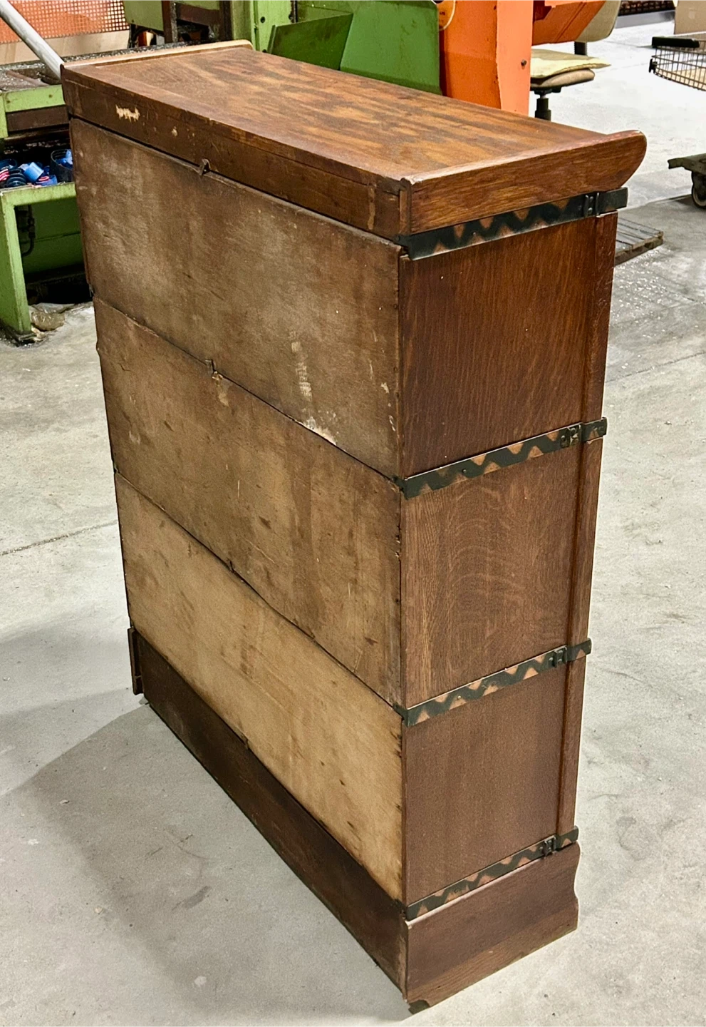 For sale is a lovely three tier “Macey” barrister bookcase (circa 1910). This stacking unit features metal banding accents with a dovetailed drawer at its base, for the storage of papers, placemats, or other items of choice. Display your favourite books or treasures within each tier, protected by sliding glass doors that function without issue. NO breaks, cracks, chips, or repairs to glass. Approximate measurements: 34”W X 12.5”D (at deepest point) X 10”D (inside depth) X 45.25”H. Presented in very good overall condition (with wear consistent with age and use). A beautiful and functional piece that would grace any space and decor! Offered for sale at $750 (or best offer). Serious inquiries only, please. Text interest to 41 six 602 three 803. Ad will be removed once barrister bookcase is sold. Check out my other fine items listed on Karrot!! Thanks for stopping by!