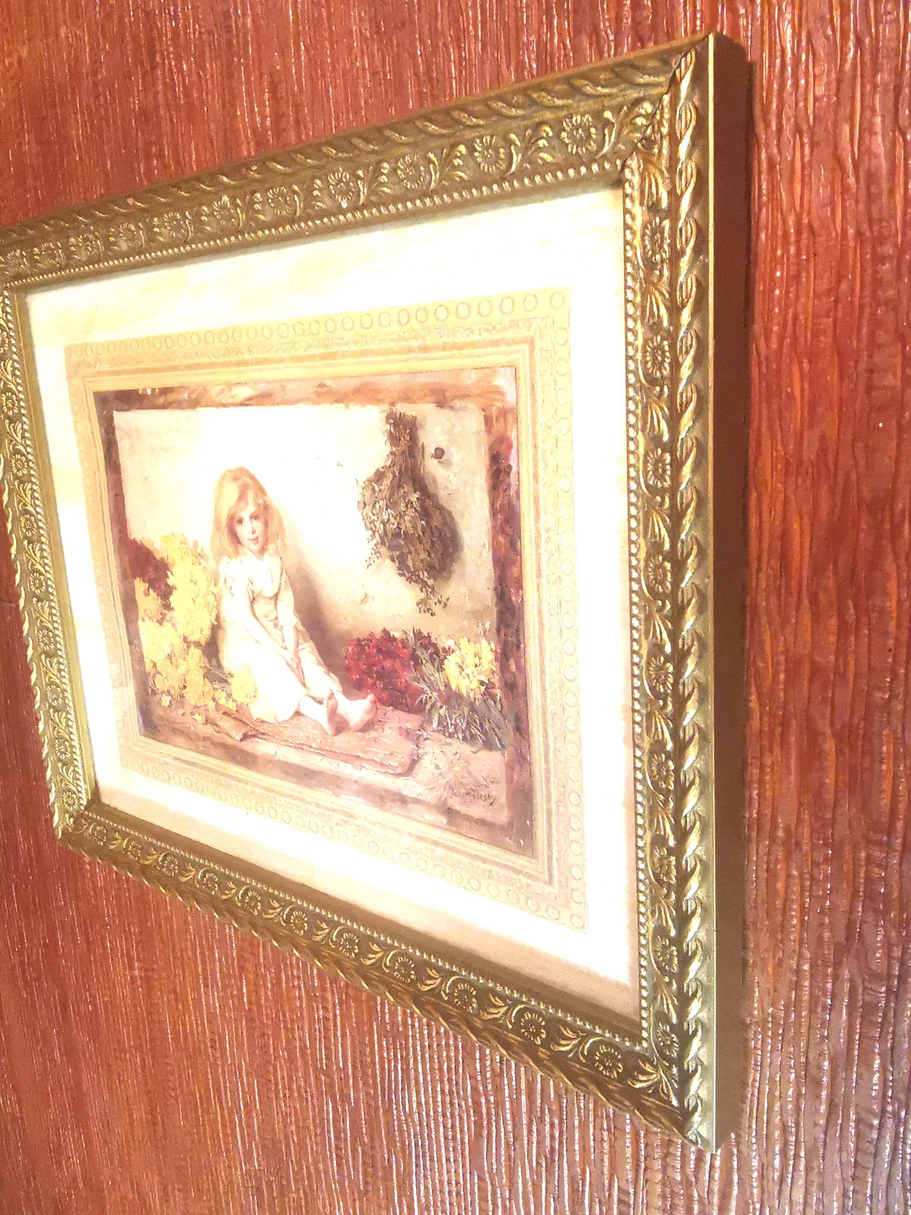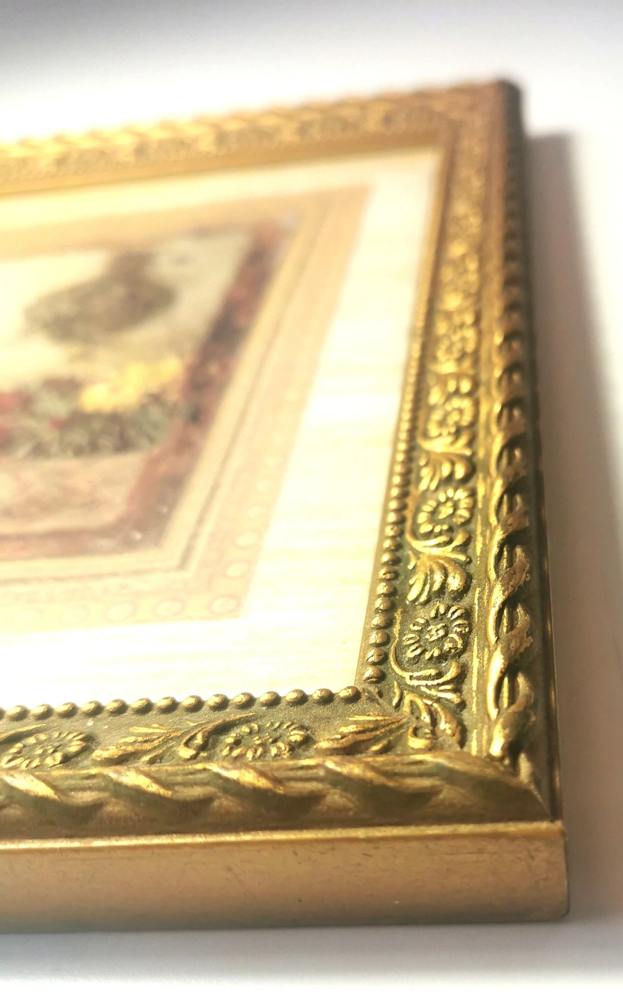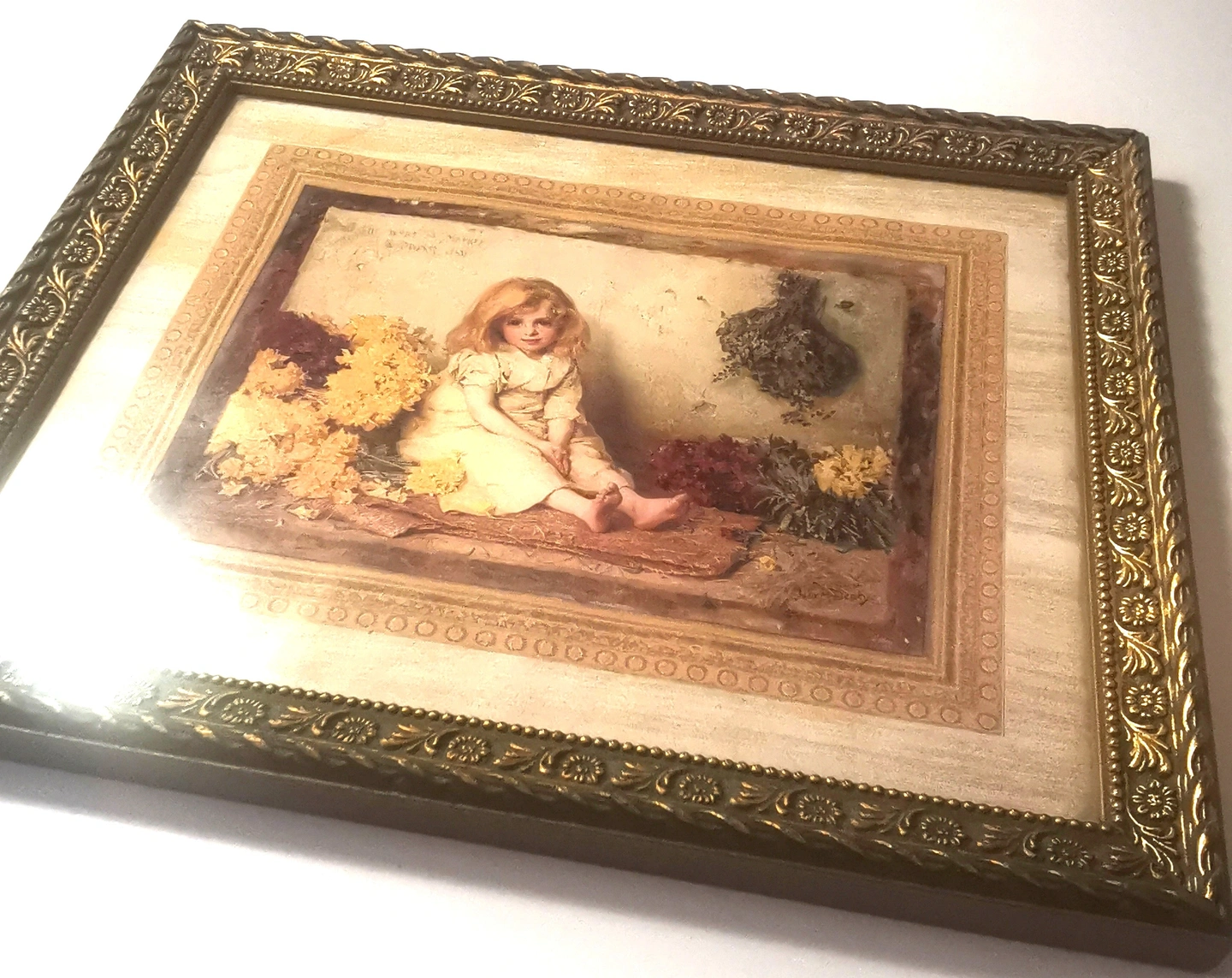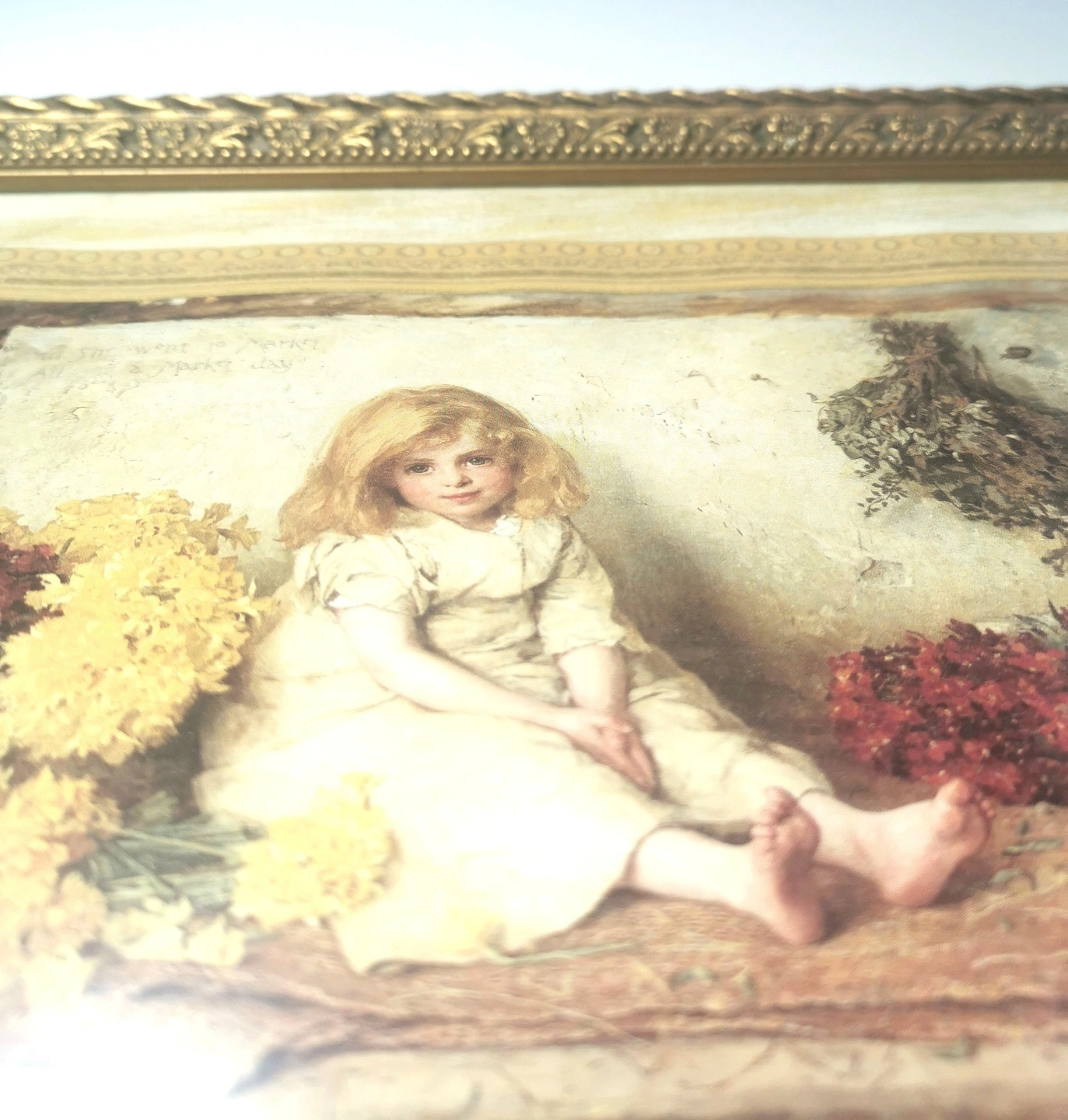 A beautiful and charming vintage framed print of the famous artwork "A Little Sunshine" by celebrated American artist Jane Stuart (McCreary). This piece was one of the most popular prints of the late Victorian and early Edwardian eras and captures the sweet innocence of childhood. The print features a lovely young girl with blonde curls, sitting amongst piles of yellow and red chrysanthemums. A bundle of dried herbs hangs on the wall behind her. The colours are beautifully muted with age, lending the piece an authentic antique character. It is housed in its original or period-appropriate ornate gold-tone frame, which features a lovely floral/foliate relief pattern. The framing gives the artwork a wonderful sense of depth and elegance. This piece is perfect for anyone who loves Victorian art, or for adding a touch of Cottagecore, Grandmacore, or antique charm to a nursery, bedroom, or gallery wall. Details: Artwork: "A Little Sunshine" Artist: Jane Stuart (McCreary) Type: Vintage Lithograph Print Period: c. Early 20th Century Condition: Excellent vintage condition. The print is clean with no signs of water damage or tears. The colours are consistent with a print of this age. The frame is solid, and the glass is intact. Please review all photos carefully as they are part of the description. Measurements: Total Frame Length: 11.5 inches Total Frame Height: 9.5 inches Depth: 0.5 inches